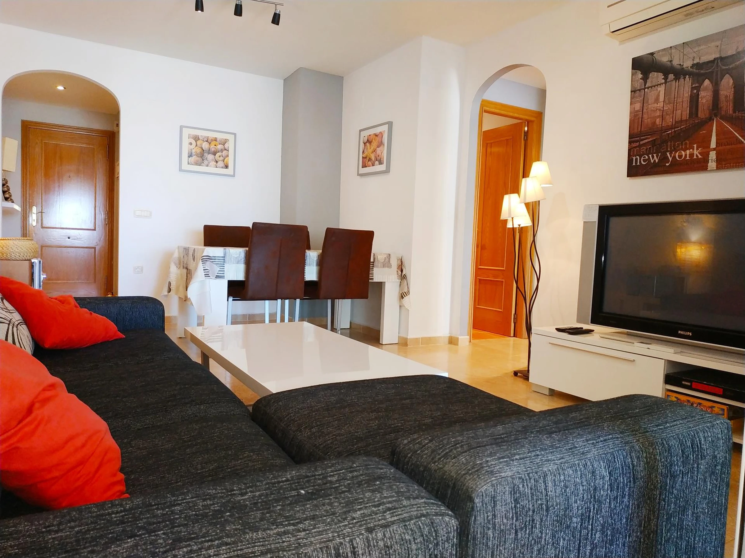 Un punto destacado es el aire acondicionado, presente en la sala de estar y en algunas habitaciones, ideal para los días más calurosos. Además, el apartamento ofrece conexión WiFi gratuita y cuenta con una televisión para momentos de entretenimiento. La terraza es otro de sus atractivos, perfecta para disfrutar de momentos de relax con vistas al entorno.