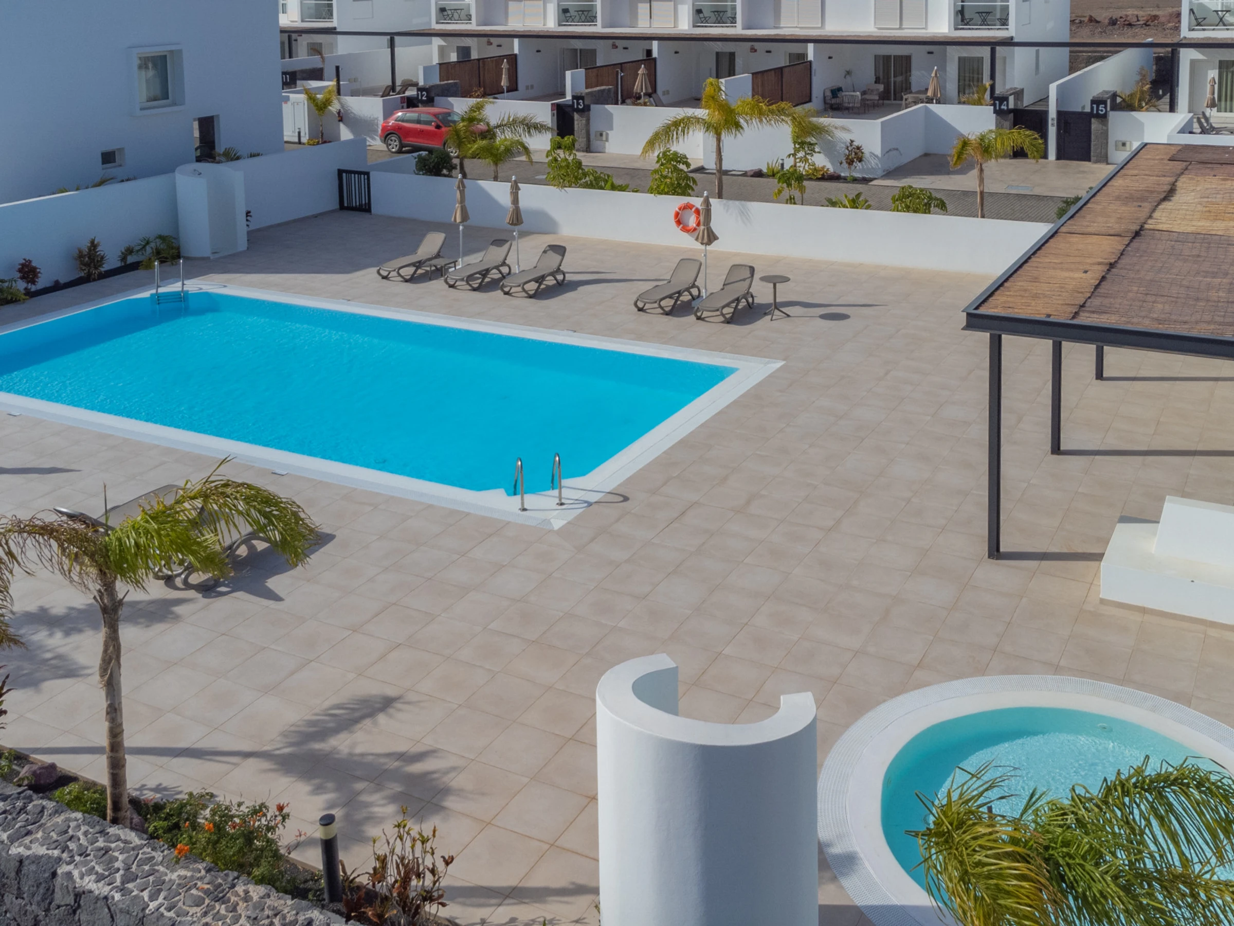 Su planta baja dispone de un luminoso espacio abierto que combina, salón-comedor y una moderna cocina americana totalmente equipada, además de un baño completo. Su exterior cuenta con una espaciosa terraza delantera con piscina privada climatizada, y una terraza trasera con jardín de piedra volcánica y barbacoa.