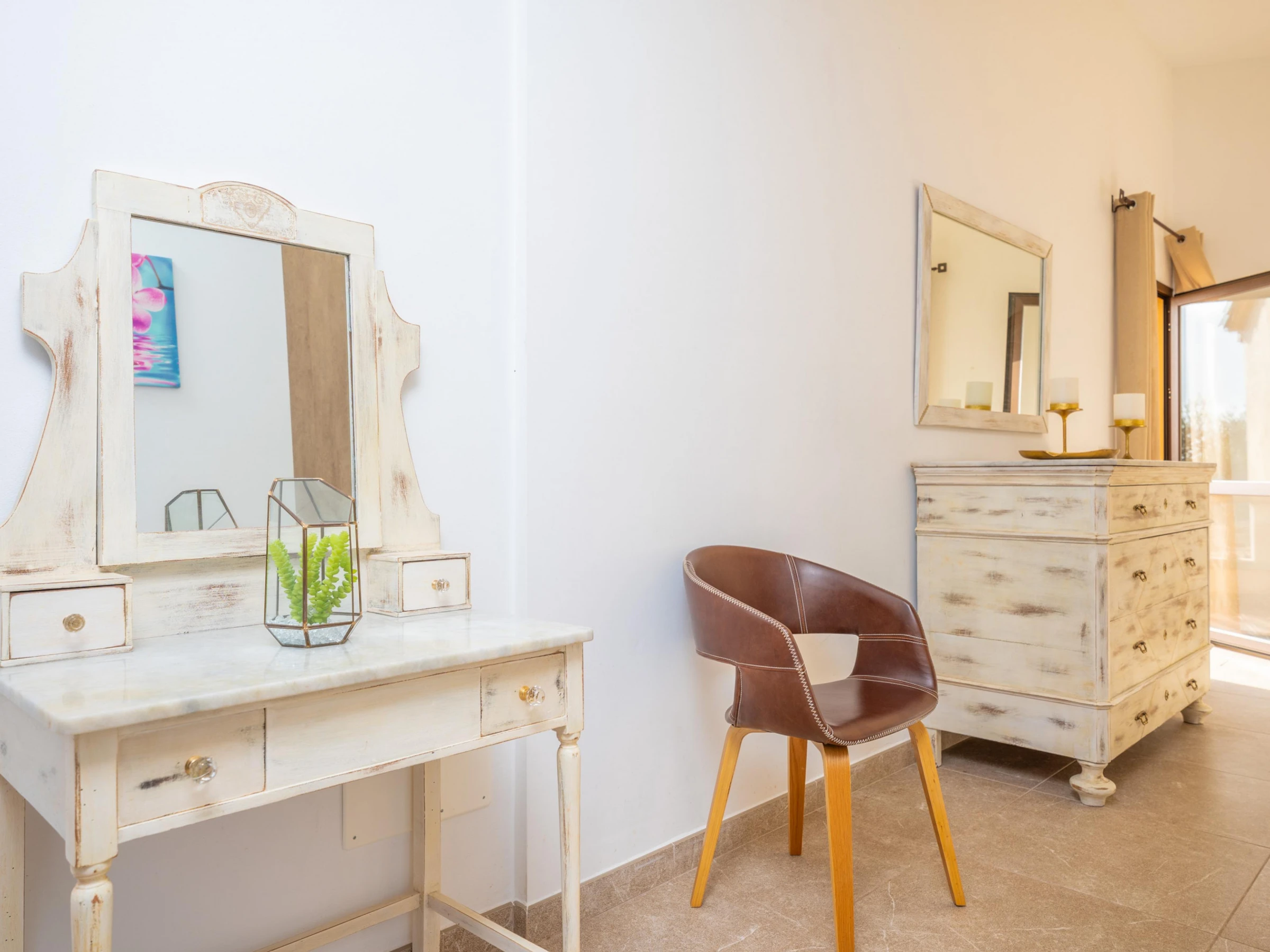 Al entrar en la casa de dos plantas, le da la bienvenida un salón-comedor agradable, dónde ver la televisión por satélite (canales solo en inglés) o comer juntos bajo el A/C. En la cocina que es de gas encontrarán todo lo necesario para preparar cualquier plato. Hay un baño completo con ducha que da servicio a esta planta. Además hay una lavandería con lavadora, plancha y tabla de planchar. Respecto a los dormitorios, en la planta baja encontrarán la primera habitación con una cama de matrimonio, A/C y armario. En la primera planta se encuentran los dos dormitorios restantes, ambos con baño en suite con ducha y equipados con armario y A/C. El primer dormitorio tiene dos camas individuales y el segundo una cama de matrimonio. Además desde este dormitorio pueden acceder a una pequeña terraza donde disfrutarán de las vistas a la montaña. Para nuestros huéspedes más pequeños facilitamos una cuna y una trona.