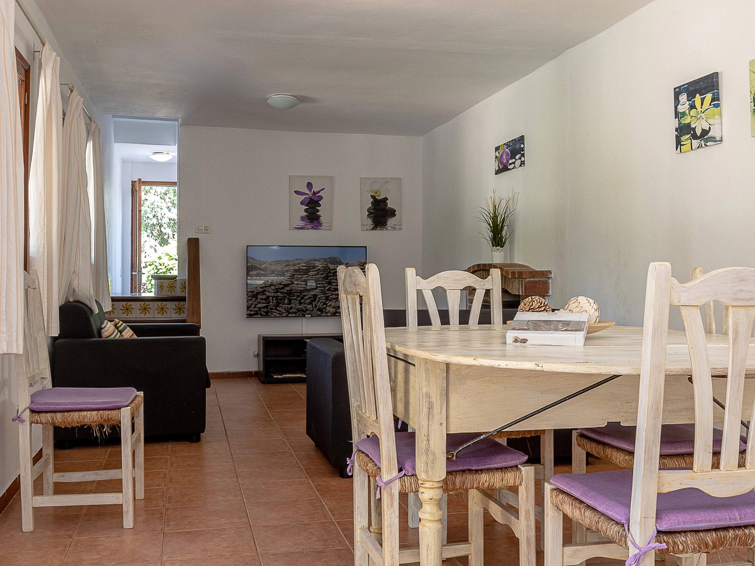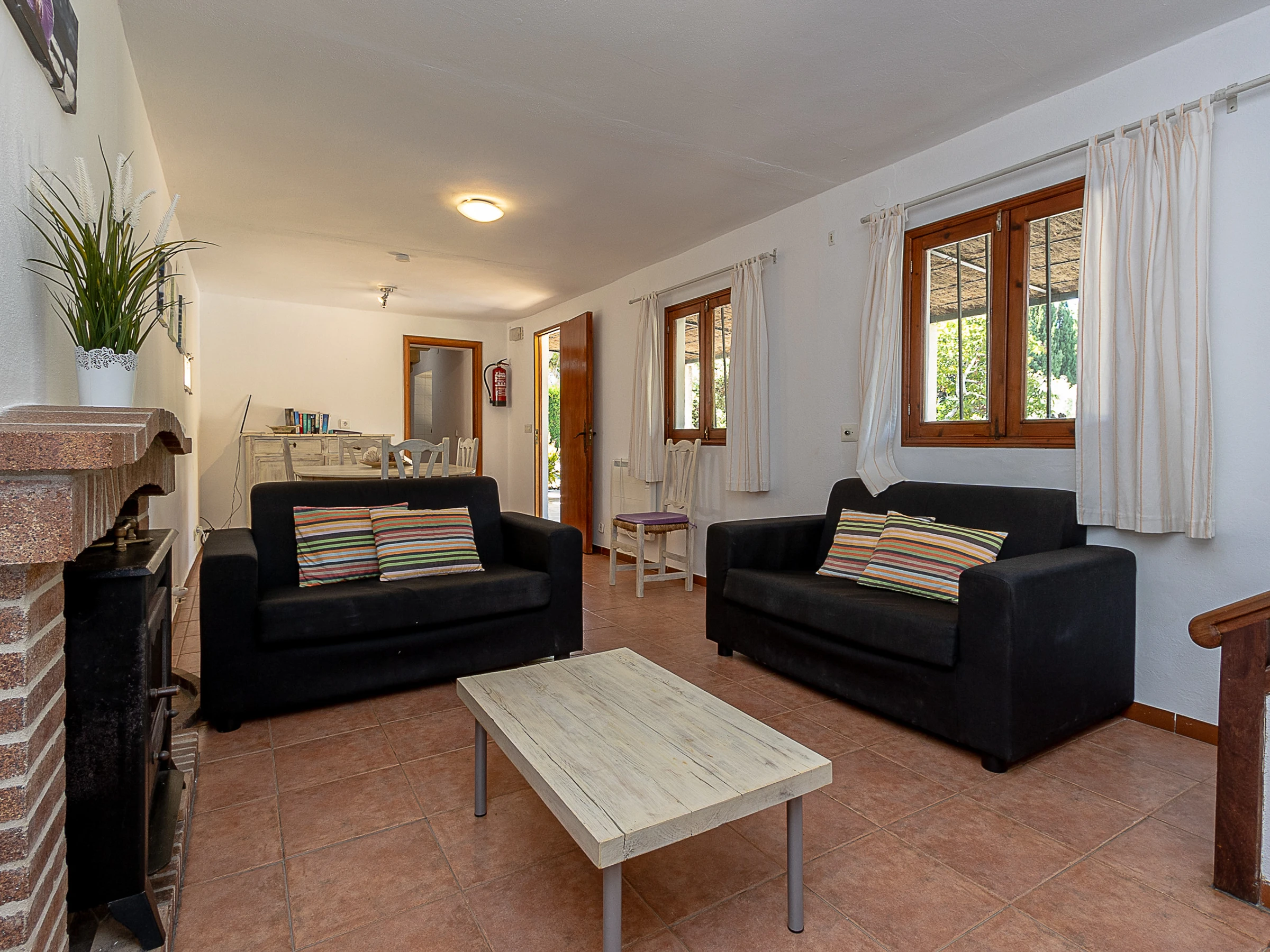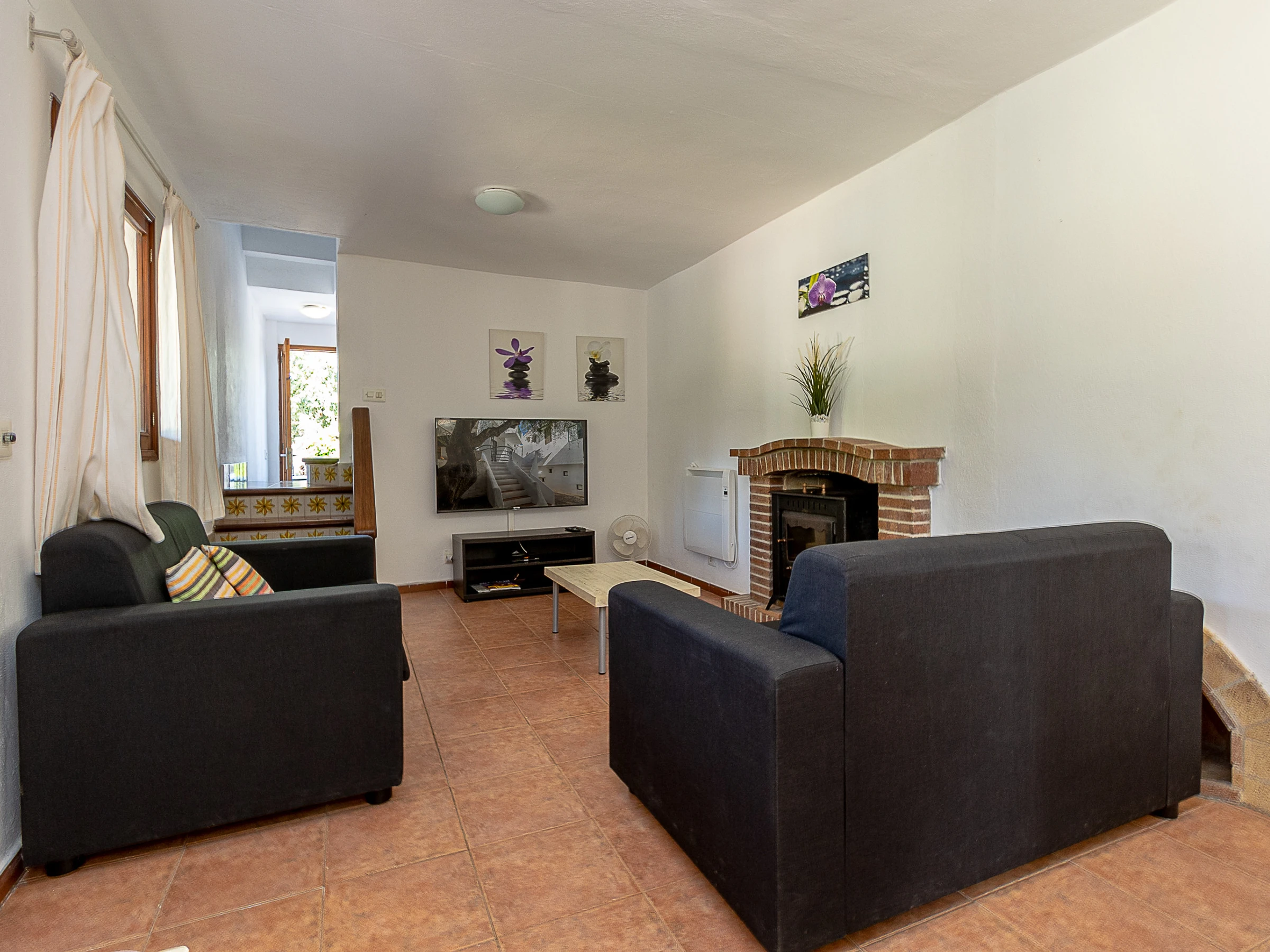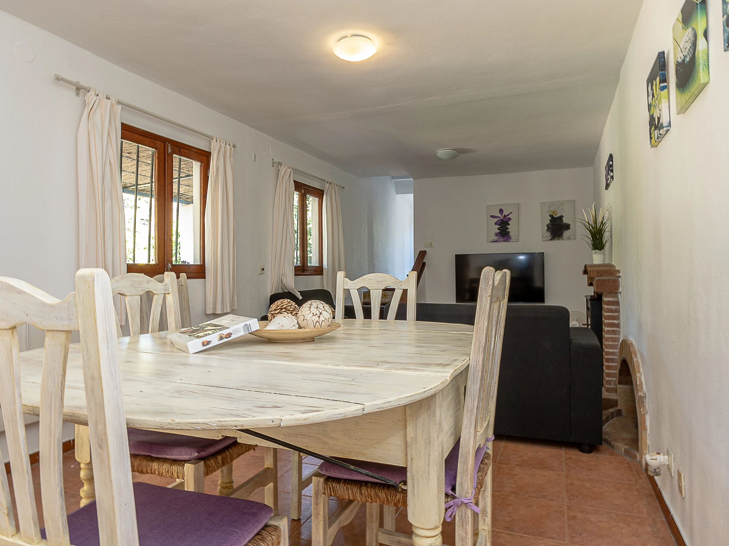 Amplio salón-comedor con chimenea y aire acondicionado, perfecto para relajarse en cualquier época del año.