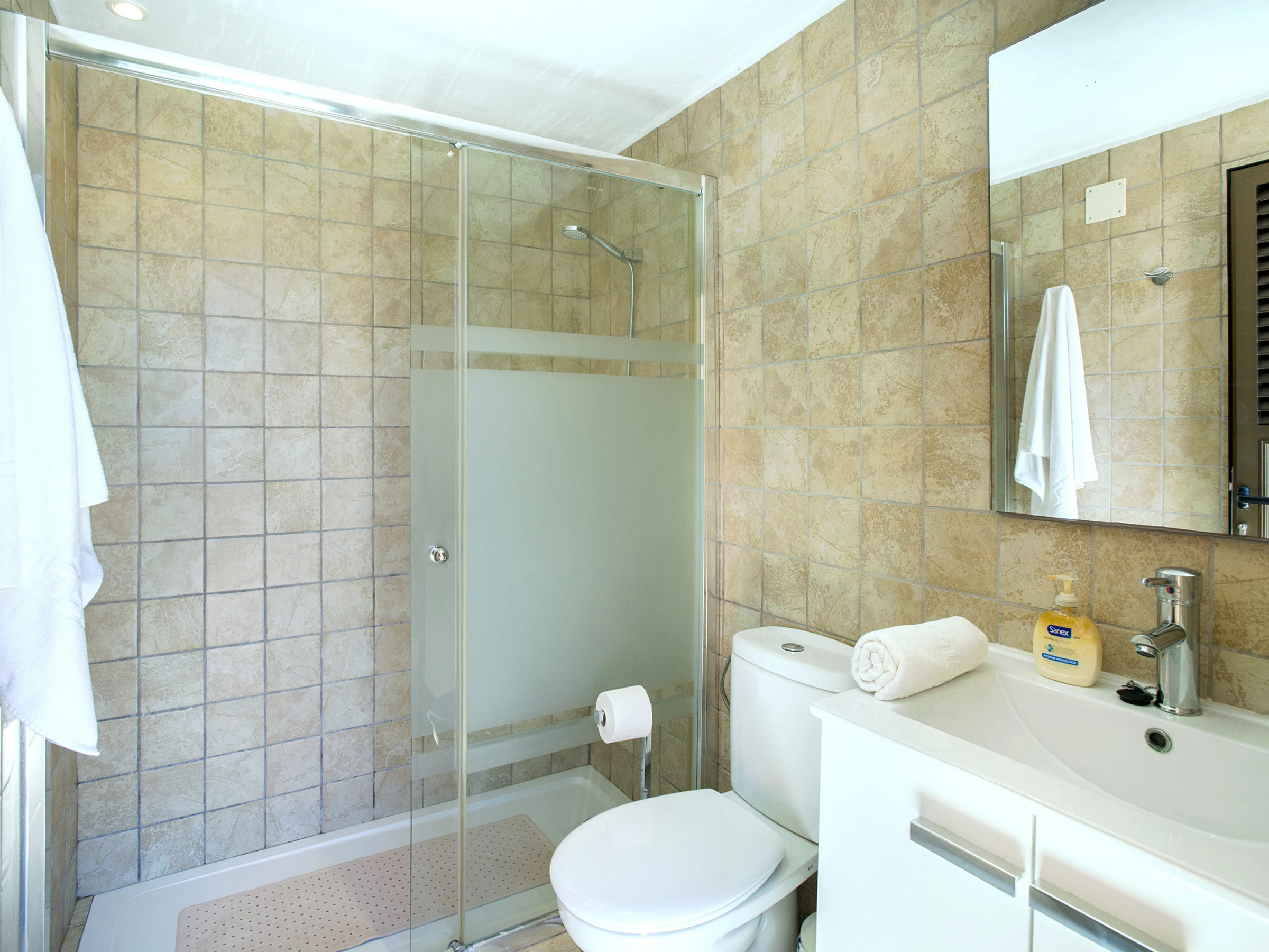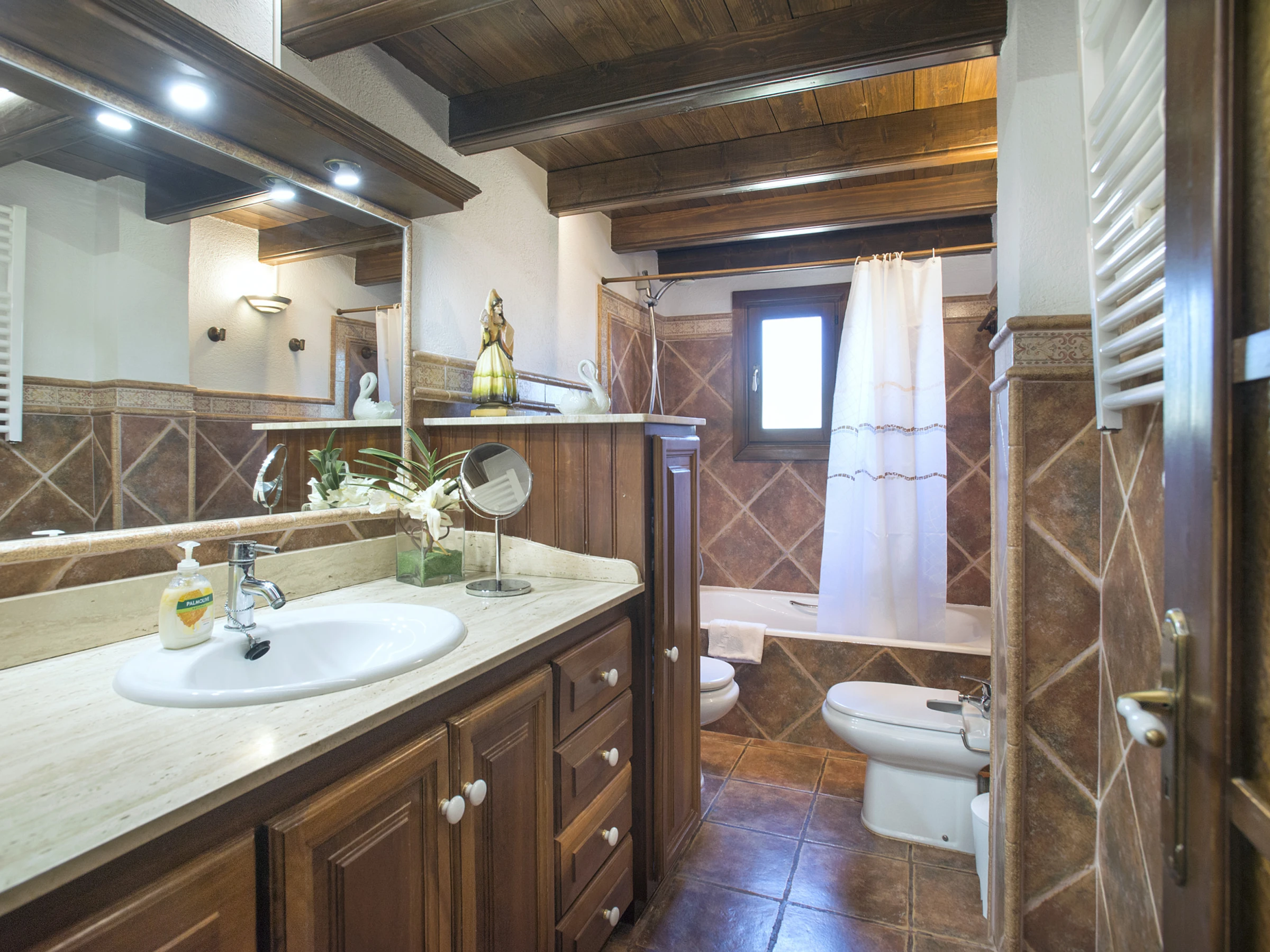 A la derecha de la cocina hay un pasillo donde encontramos dos dormitorios y un baño. Hay un dormitorio con cama matrimonial, todo en colores claros, y una habitación con dos camas también con paredes y armarios blancos. Este dormitorio con dos camas tiene salida a la terraza y piscina. Hay un baño junto a las habitaciones con bañera, ducha y bidet. Todos los muebles del baño son en madera haciendo combinación con el techo y los azulejos.