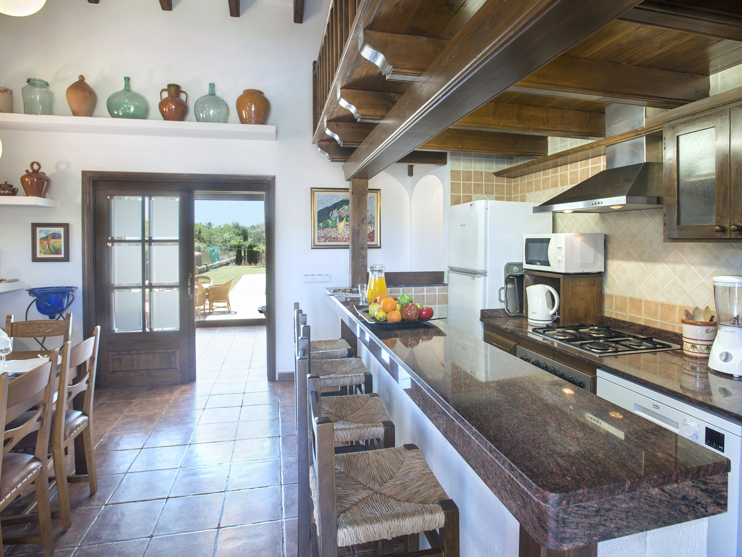 La entrada al Chalet Marvil está directamente en la cocina y comedor. La cocina abierta, dispone de una barra con sillas donde se puede desayunar y está completamente equipada con todas las comodidades que puede necesitar en sus vacaciones. El comedor dispone de una mesa de madera y esta adornado con grandes jarrones de arcilla y vidrio y paredes blancas. El techo tiene altas vigas de madera que le dan un toque rústico a este hermoso chalet.