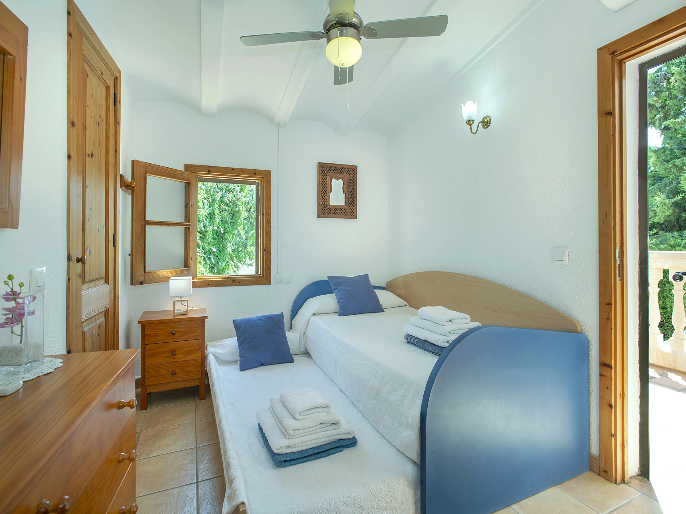 En la primera planta se sitúan las dos habitaciones, ambas con abundante luz natural y un ambiente tranquilo. Una de ellas cuenta con dos camas individuales juntas, mientras que la segunda dispone de una cama individual y una cama nido, además de acceso directo a un balcón privado con agradables vistas al entorno rural. Las habitaciones están equipadas con aire acondicionado frío/calor disponible las 24 horas del día, garantizando el máximo confort en cualquier época del año. La vivienda se completa con baños funcionales y bien mantenidos, pensados para cubrir las necesidades del día a día con total comodidad.