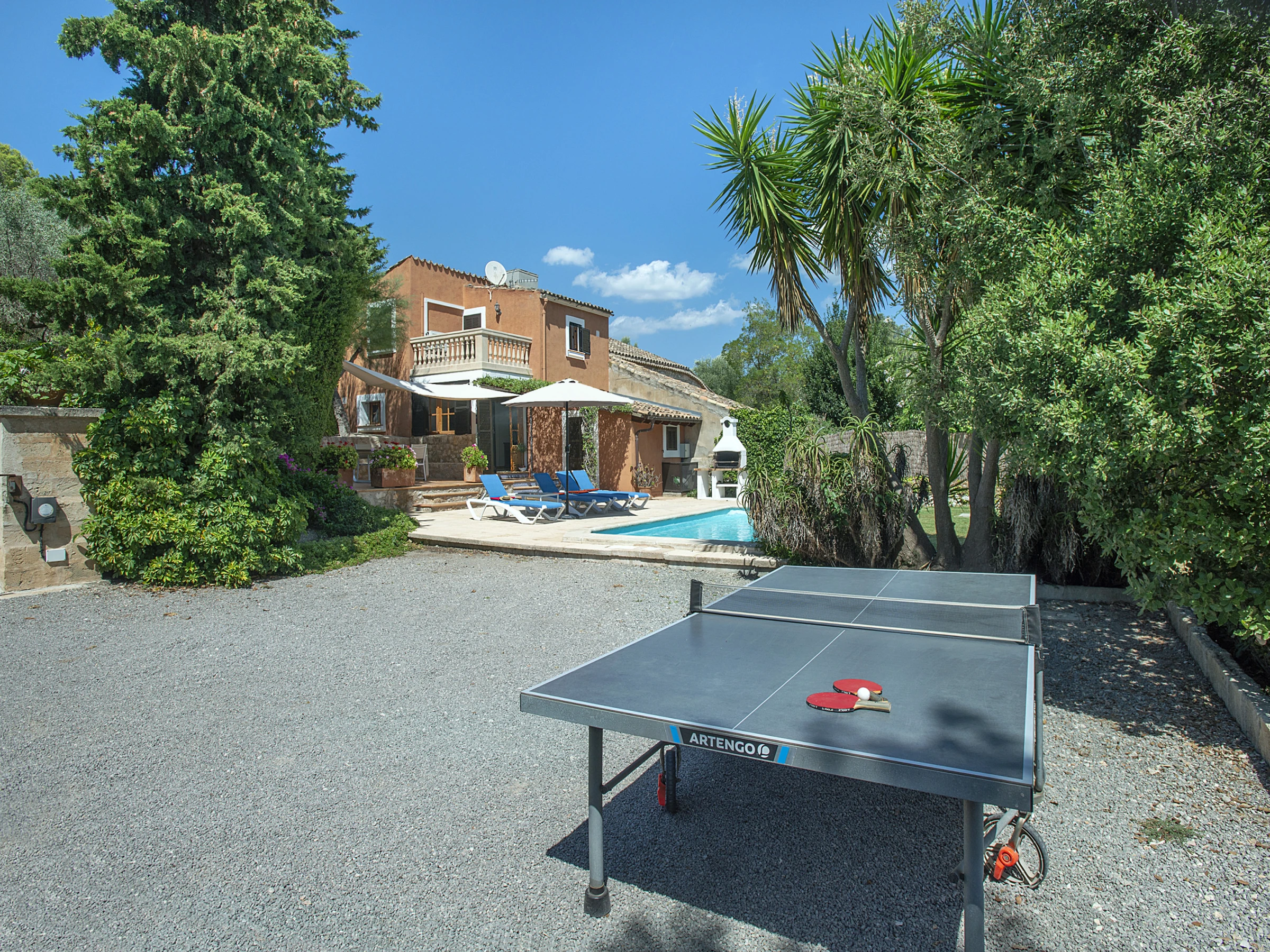 Las zonas exteriores son uno de los grandes atractivos de Villa Bennasar. Desde el salón se accede a una acogedora terraza frontal parcialmente cubierta, equipada con una agradable zona de comedor al aire libre. Esta terraza conecta directamente con la piscina privada y el área de solárium, ideales para disfrutar del clima mediterráneo con total privacidad. El exterior se completa con una barbacoa de obra, un práctico lavadero exterior y un baño con ducha, facilitando el disfrute de la vida al aire libre. El jardín, cuidadosamente mantenido, está rodeado de setos, plantas y arbustos, con zonas de césped y parterres que aportan armonía y tranquilidad al conjunto.