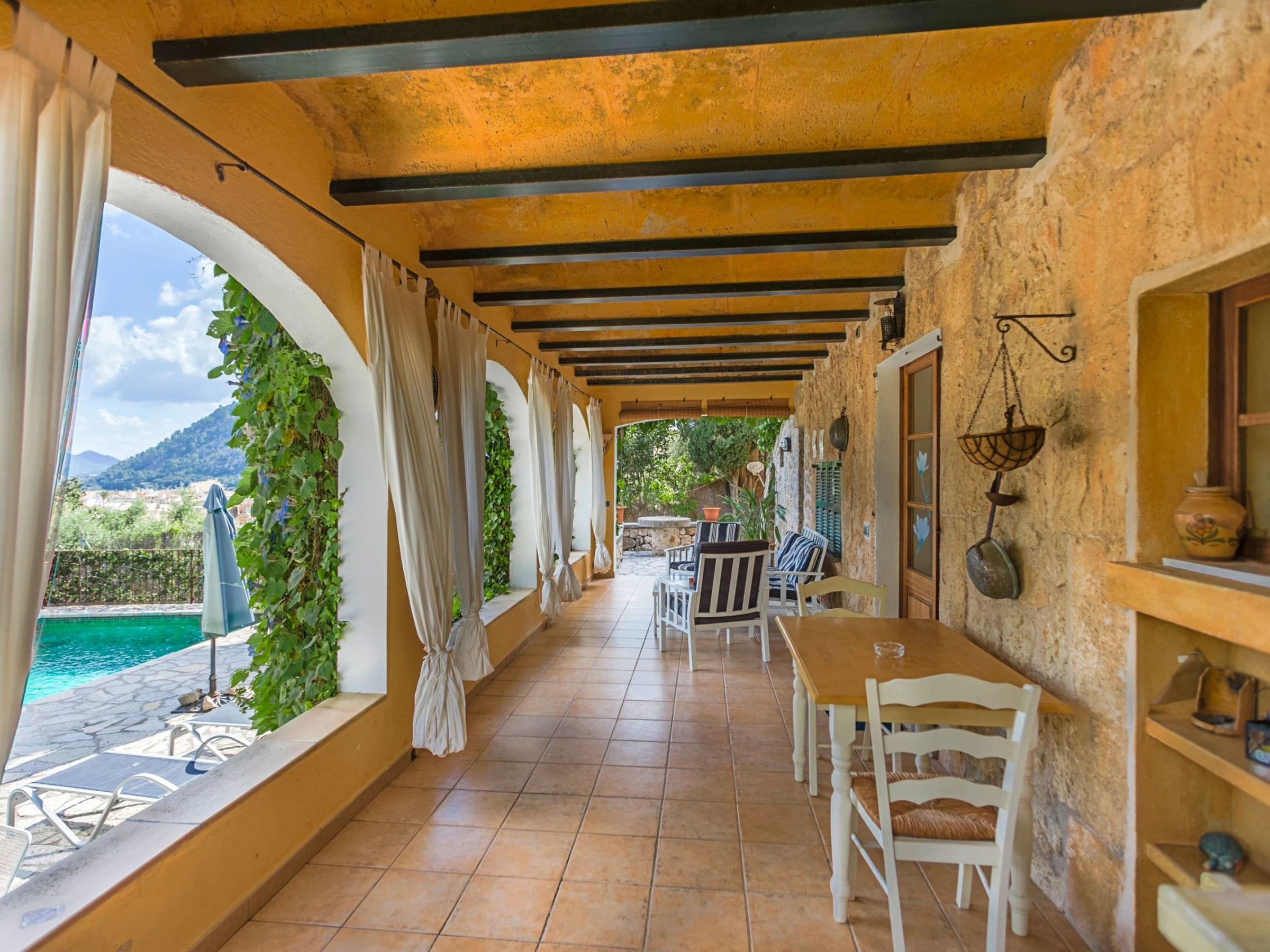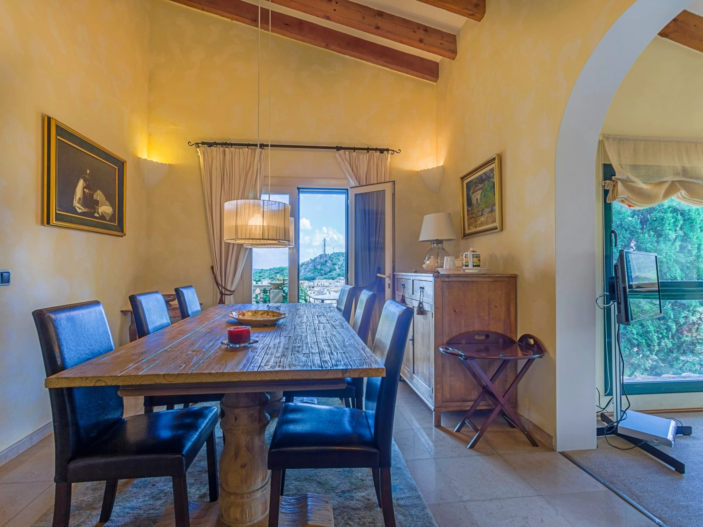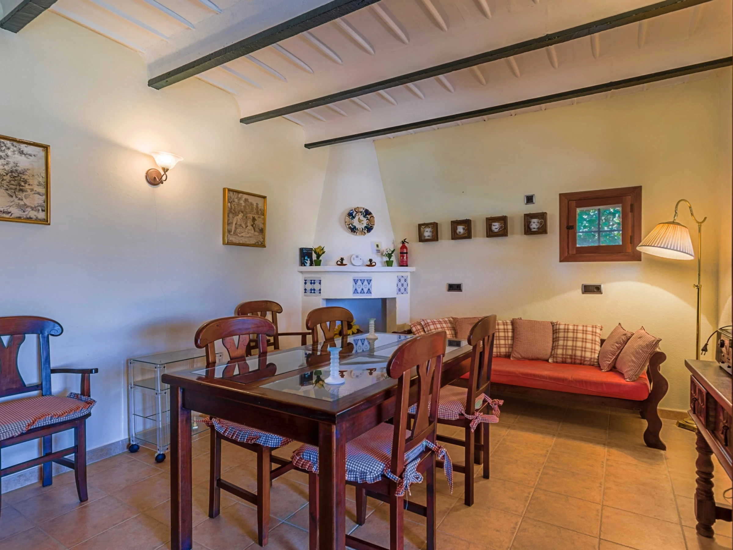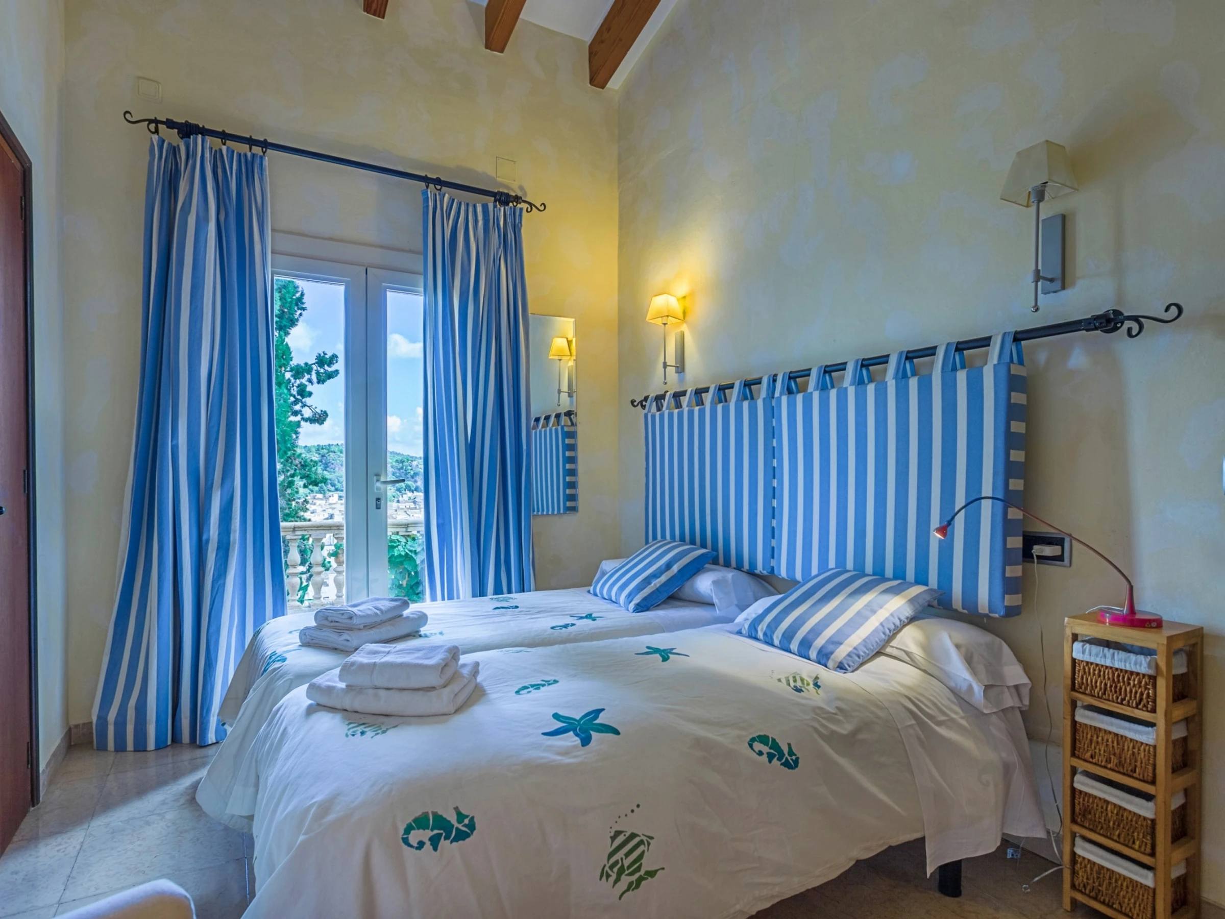 Desde la puerta de entrada, unos escalones conducen a un patio, con una encantadora zona de estar y un jardín. La puerta principal conduce al comedor, con paredes bellamente decoradas y grandes ventanales franceses que dan a la terraza. Desde el comedor, un arco conduce al amplio y luminoso salón con grandes ventanales que ofrecen hermosas vistas de la ciudad de Pollensa. La cocina independiente, totalmente equipada, tiene una puerta que da a una terraza cubierta (pérgola) que proporciona acceso directo a la zona de barbacoa y piscina (a través de unos escalones). Justo al lado del pasillo, hay una habitación doble y una habitación con dos camas individuales. Ambas habitaciones comparten un amplio vestidor y un baño completo. Más abajo, por los escalones de piedra exteriores, se accede a una habitación con dos camas individuales que tiene un baño completo con ducha y acceso directo a la terraza cubierta. También hay un segundo salón en este nivel, que una vez más disfruta de acceso directo a la terraza cubierta. Esta terraza está elegantemente amueblada con cómodos muebles de patio.