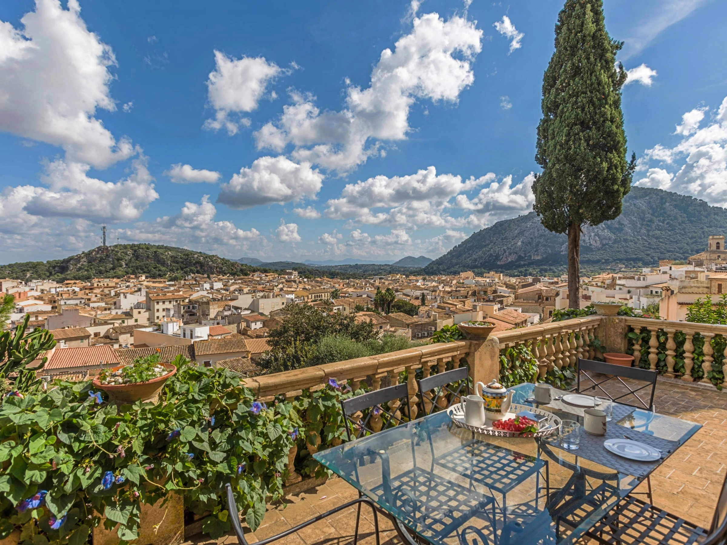 La acogedora piscina, rodeada de terrazas empedradas, ofrece impresionantes vistas del casco antiguo de Pollensa y está equipada con tumbonas, sombrillas, barbacoa y mesa para comer al aire libre mientras admira las vistas.