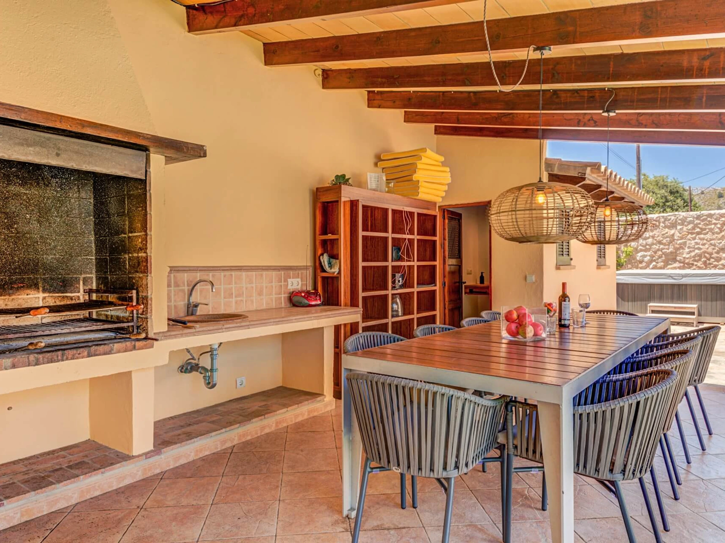 En el exterior hay una barbacoa empotrada cubierta con una mesa larga y sillas que pueden acomodar fácilmente a 8 personas para disfrutar de una deliciosa comida en conjunto. También hay una nevera y un fregadero disponibles. Al lado de la zona de barbacoa hay un aseo y un lavadero.