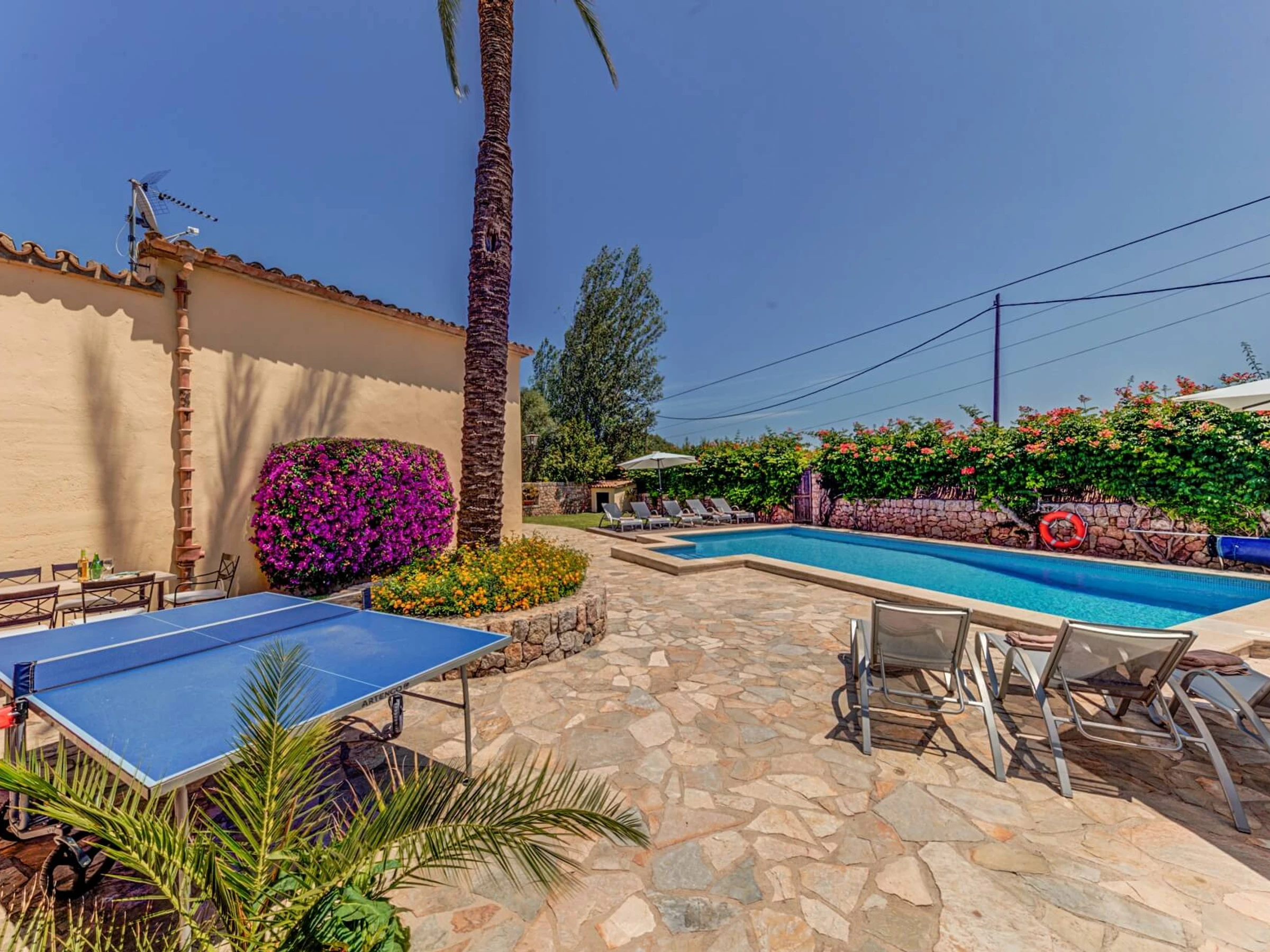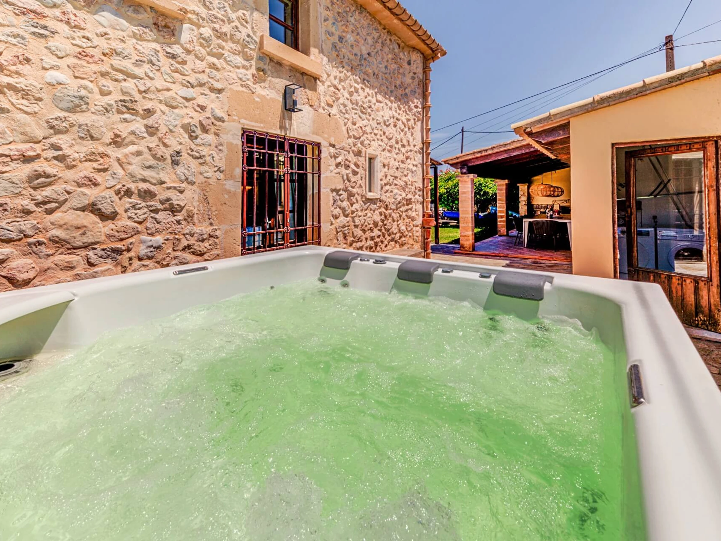 La zona de la piscina es perfecta para tomar el sol y relajarse y tiene un jacuzzi. Tiene una terraza de teca a un lado, césped a los dos lados y un patio de piedra que corre a lo largo del otro extremo. La terraza cubierta cerca de la zona de barbacoa está amueblada con sofás y sillas y también hay una zona de estar de piedra con cómodos cojines y una mesa de billar.