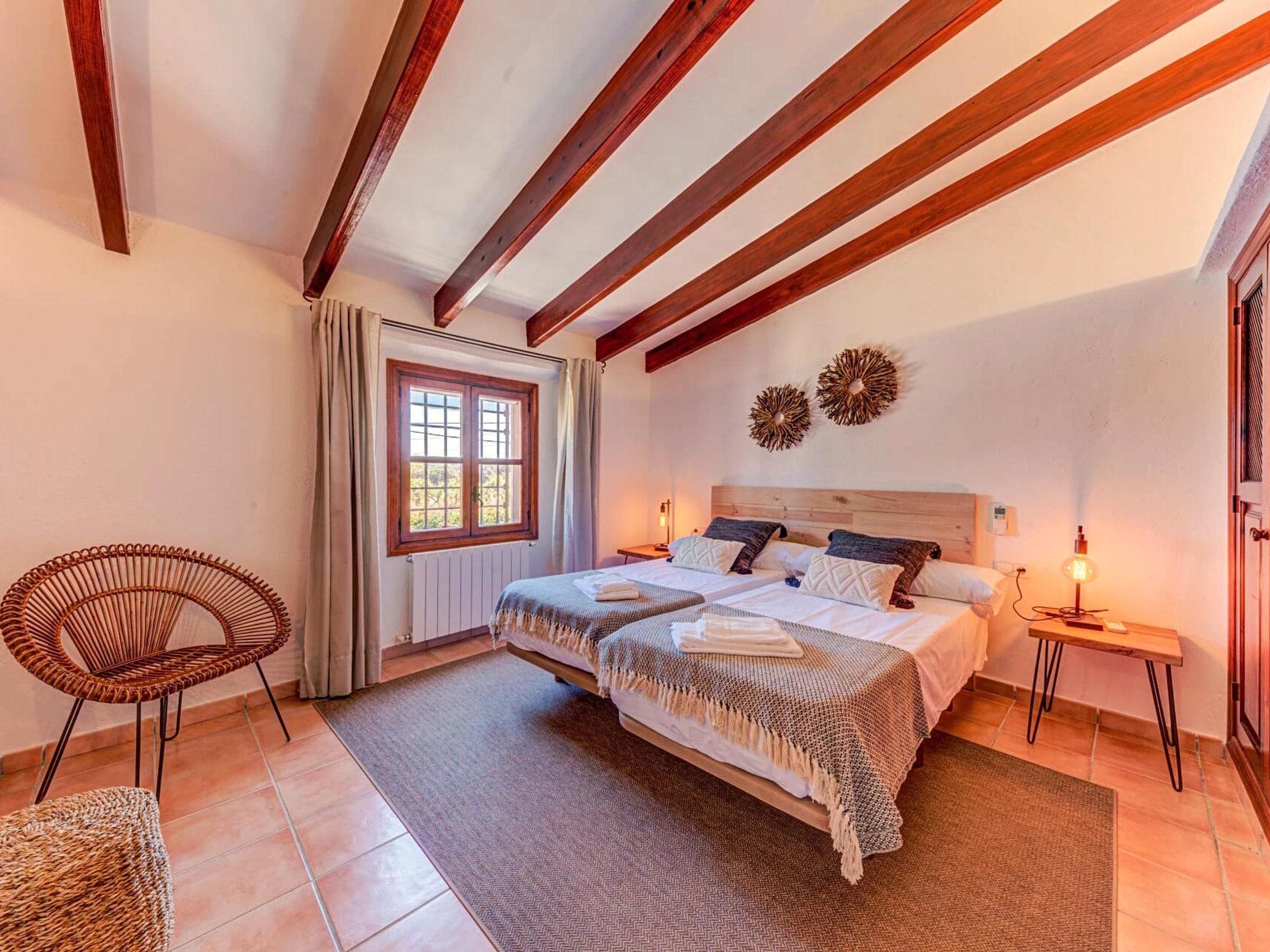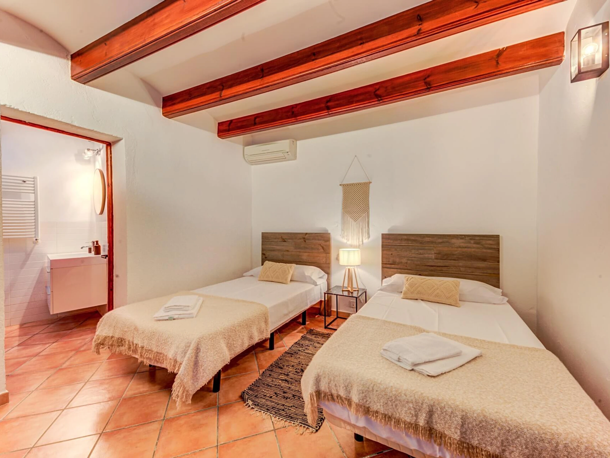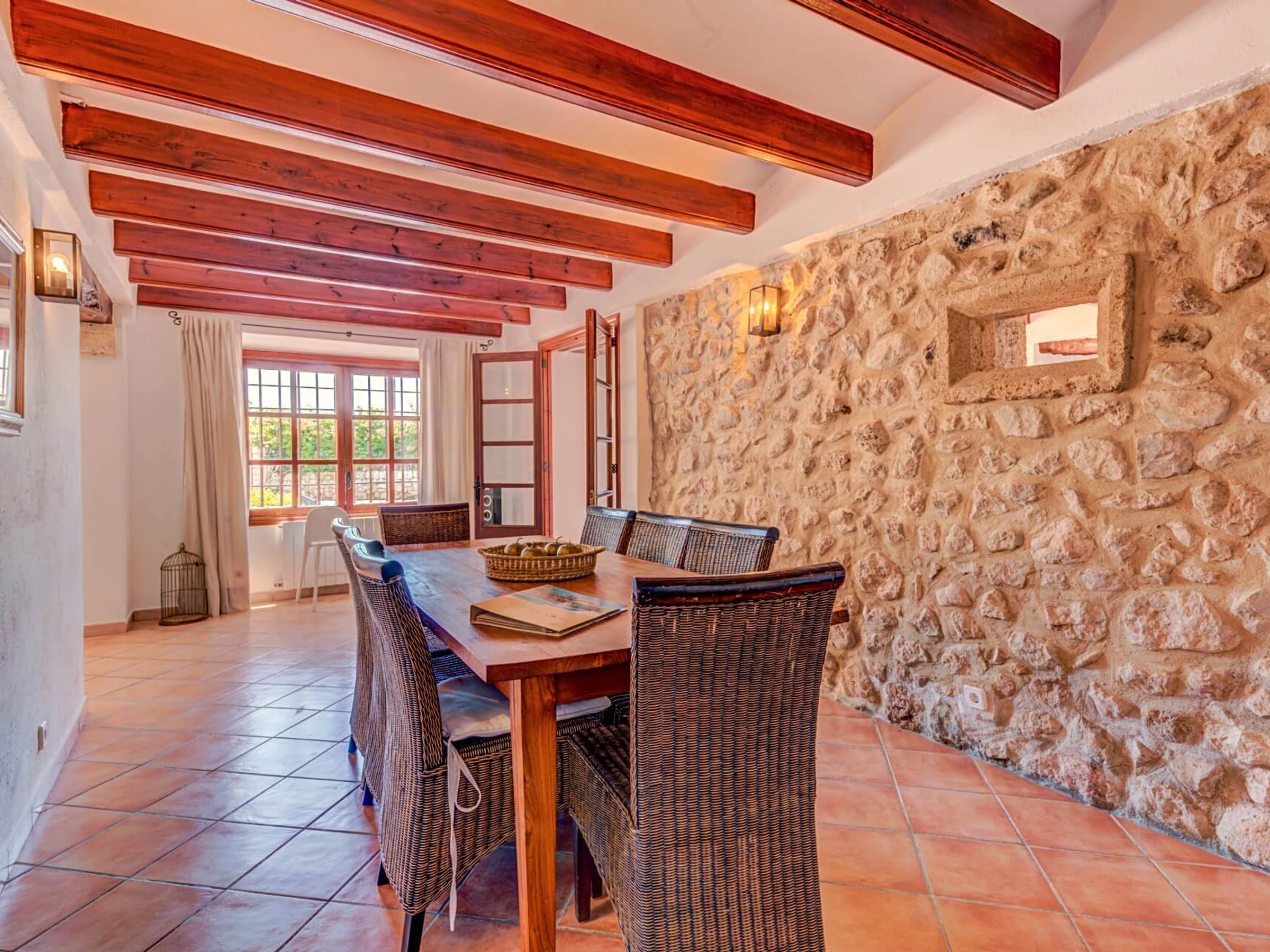 En el interior, la villa se distribuye en 2 plantas. Junto al hall de entrada, hay un amplio salón con techos altos con vigas a la vista, tragaluces y paredes de piedra vista. Las puertas francesas, con vistas a la piscina y la zona de barbacoa, conducen a una hermosa terraza con zona de estar perfecta para relajarse y leer un libro. A la derecha del hall de entrada, hay un bonito comedor con cocina (incluida una barra de desayuno). En la planta baja también hay una habitación doble con baño privado con ducha. Una amplia escalera conduce al primer piso, que cuenta con una habitación doble con baño privado con ducha, una habitación con dos camas individuales con baño privado con ducha, una habitación con dos camas individuales y un baño completo con ducha separada.