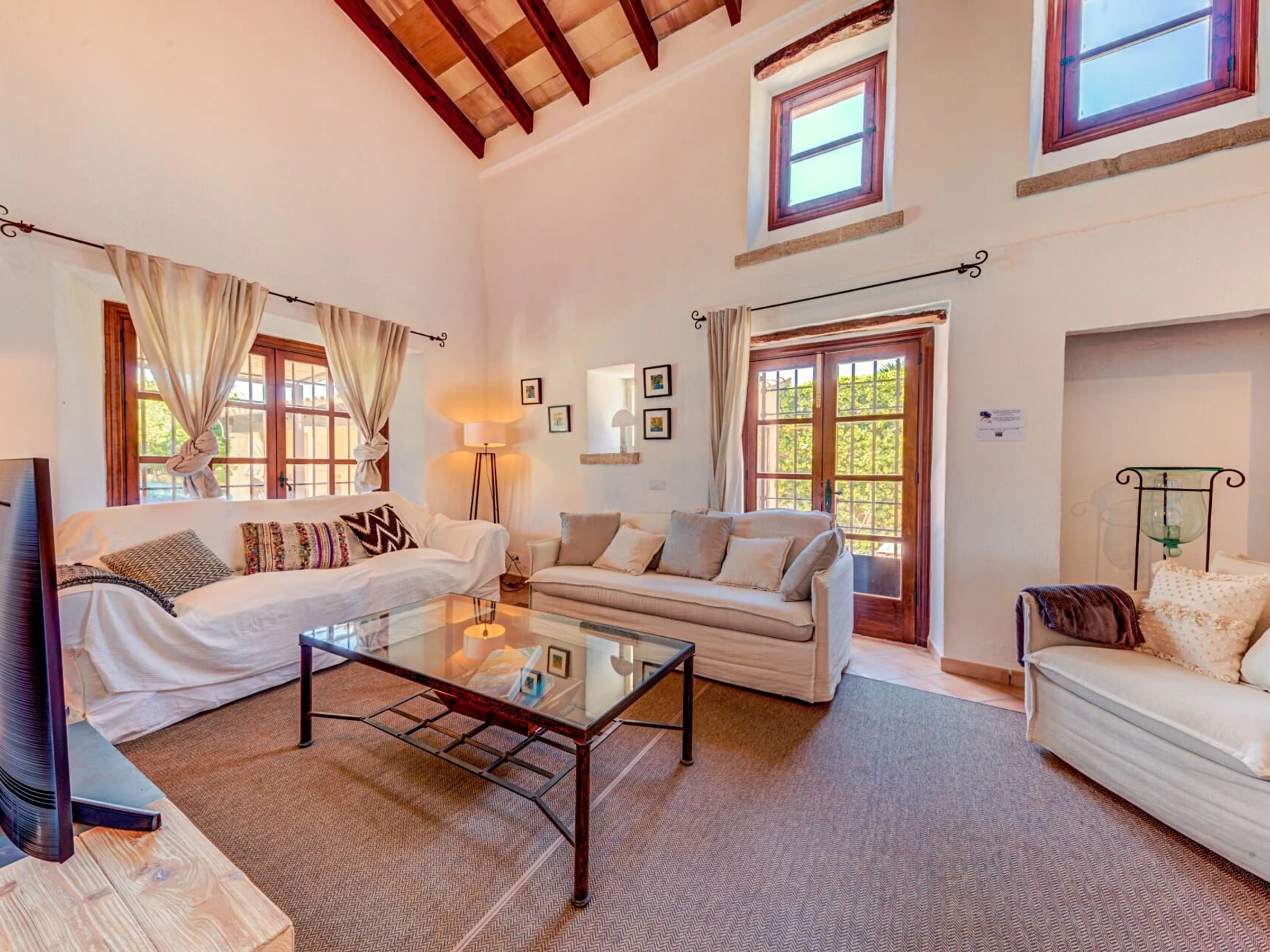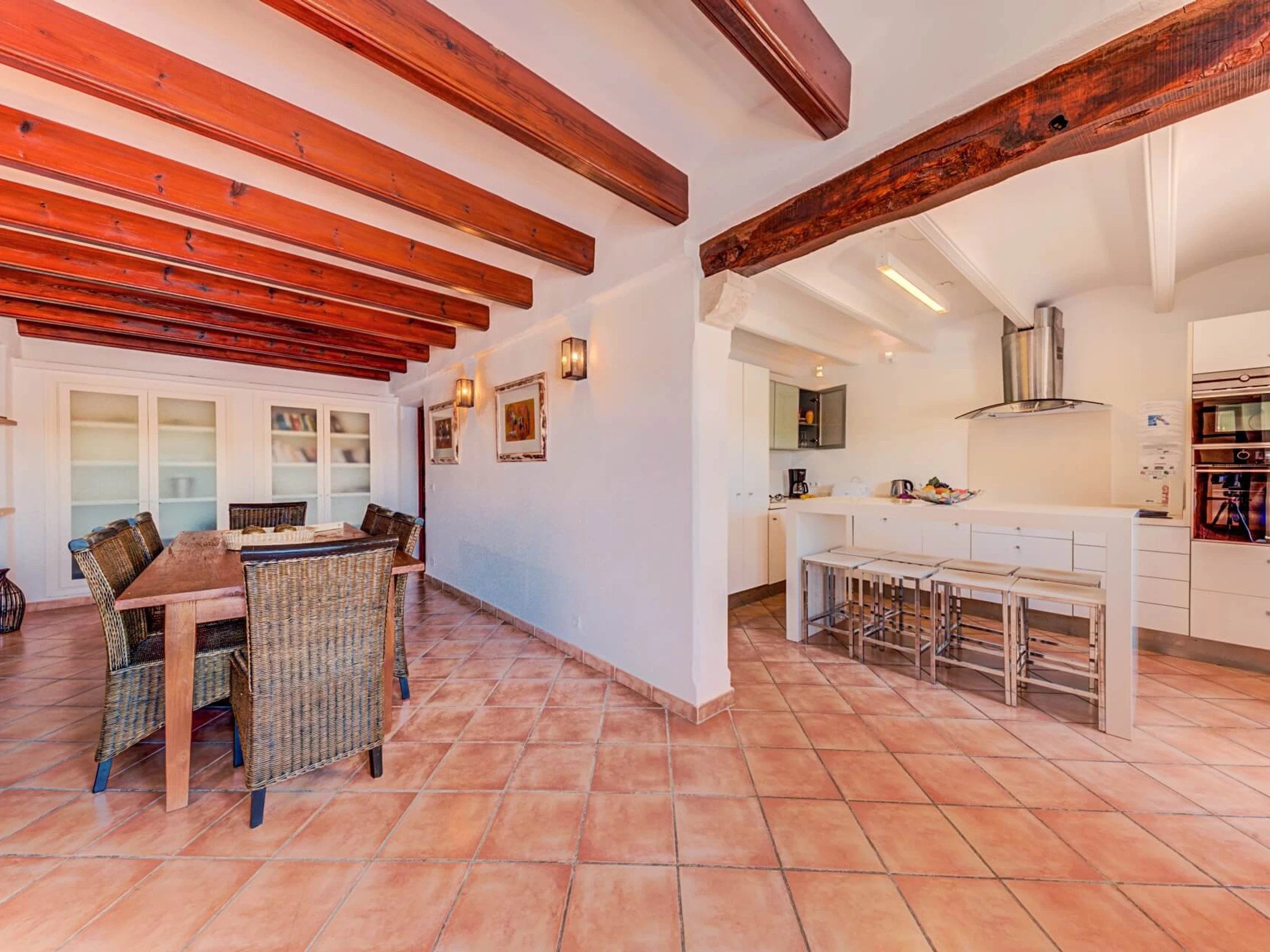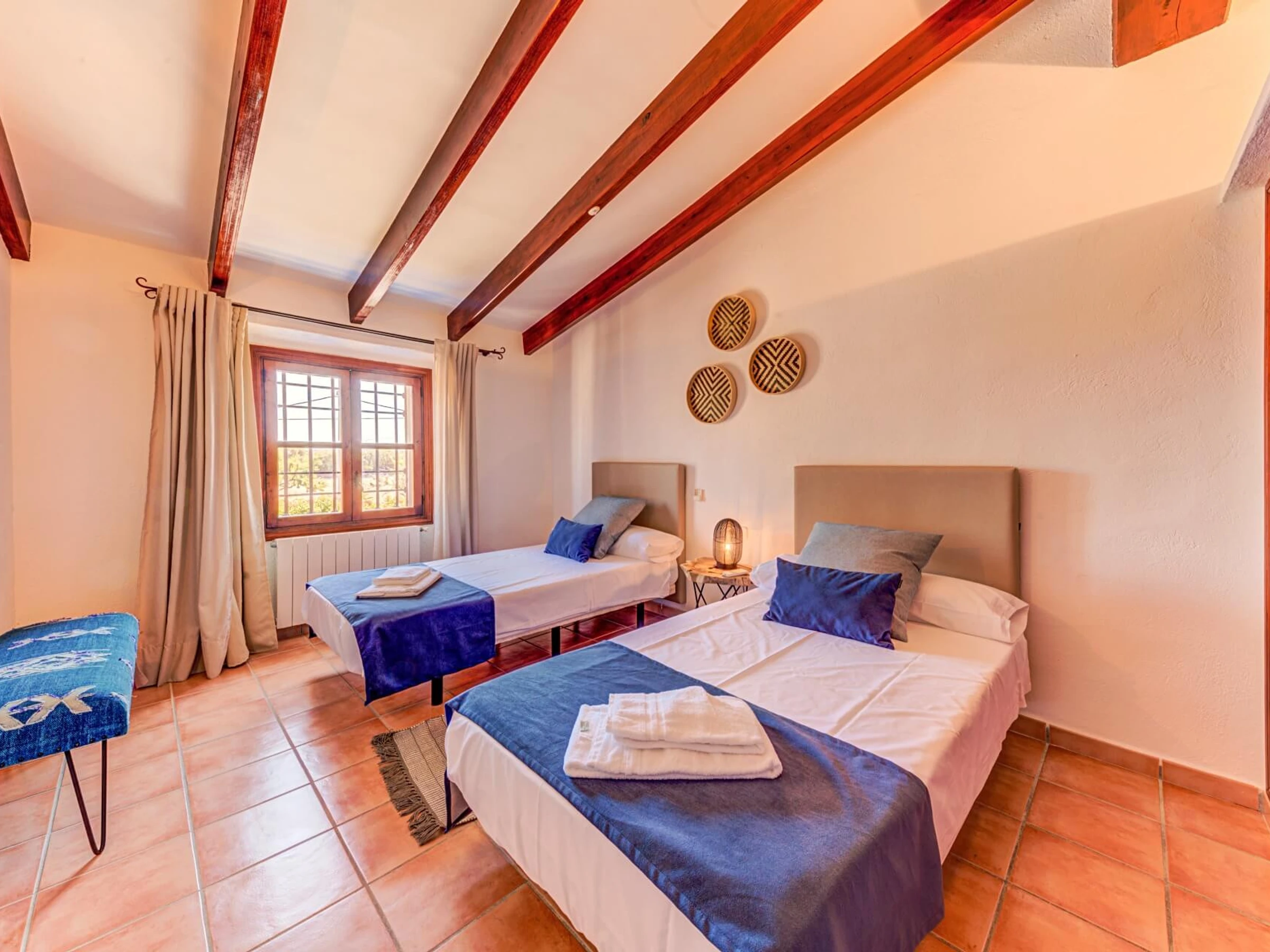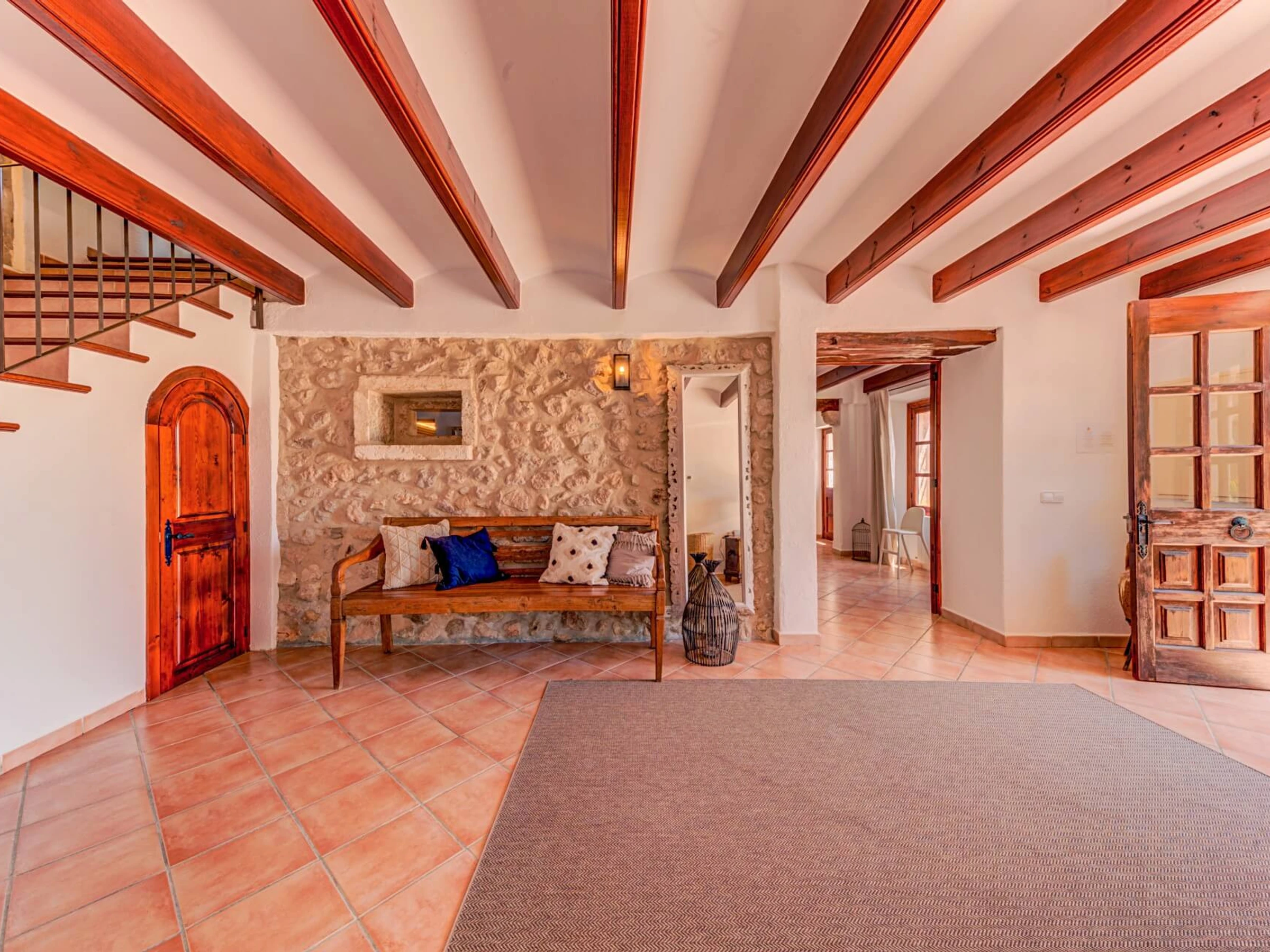En el interior, la villa se distribuye en 2 plantas. Junto al hall de entrada, hay un amplio salón con techos altos con vigas a la vista, tragaluces y paredes de piedra vista. Las puertas francesas, con vistas a la piscina y la zona de barbacoa, conducen a una hermosa terraza con zona de estar perfecta para relajarse y leer un libro. A la derecha del hall de entrada, hay un bonito comedor con cocina (incluida una barra de desayuno). En la planta baja también hay una habitación doble con baño privado con ducha. Una amplia escalera conduce al primer piso, que cuenta con una habitación doble con baño privado con ducha, una habitación con dos camas individuales con baño privado con ducha, una habitación con dos camas individuales y un baño completo con ducha separada.