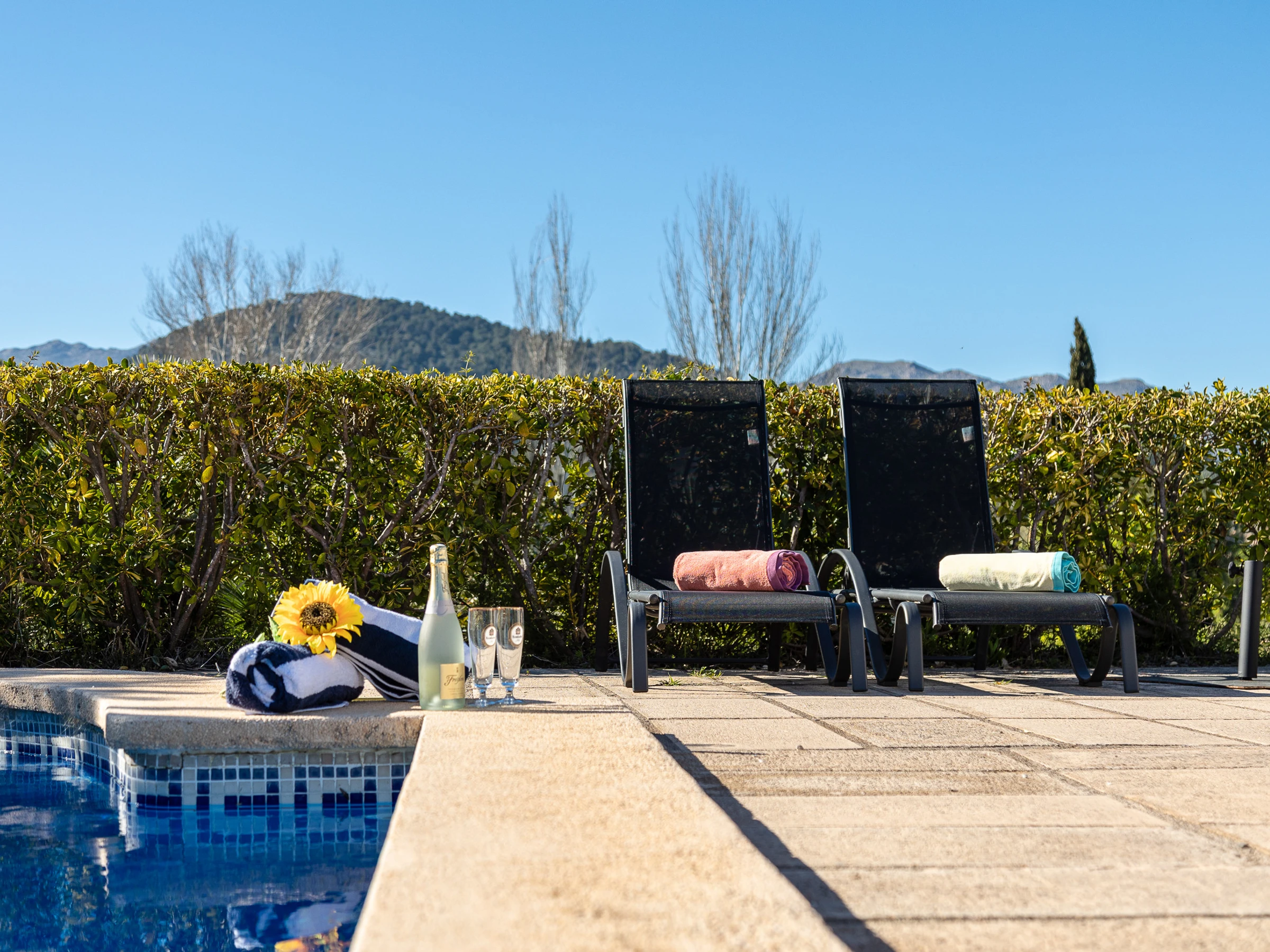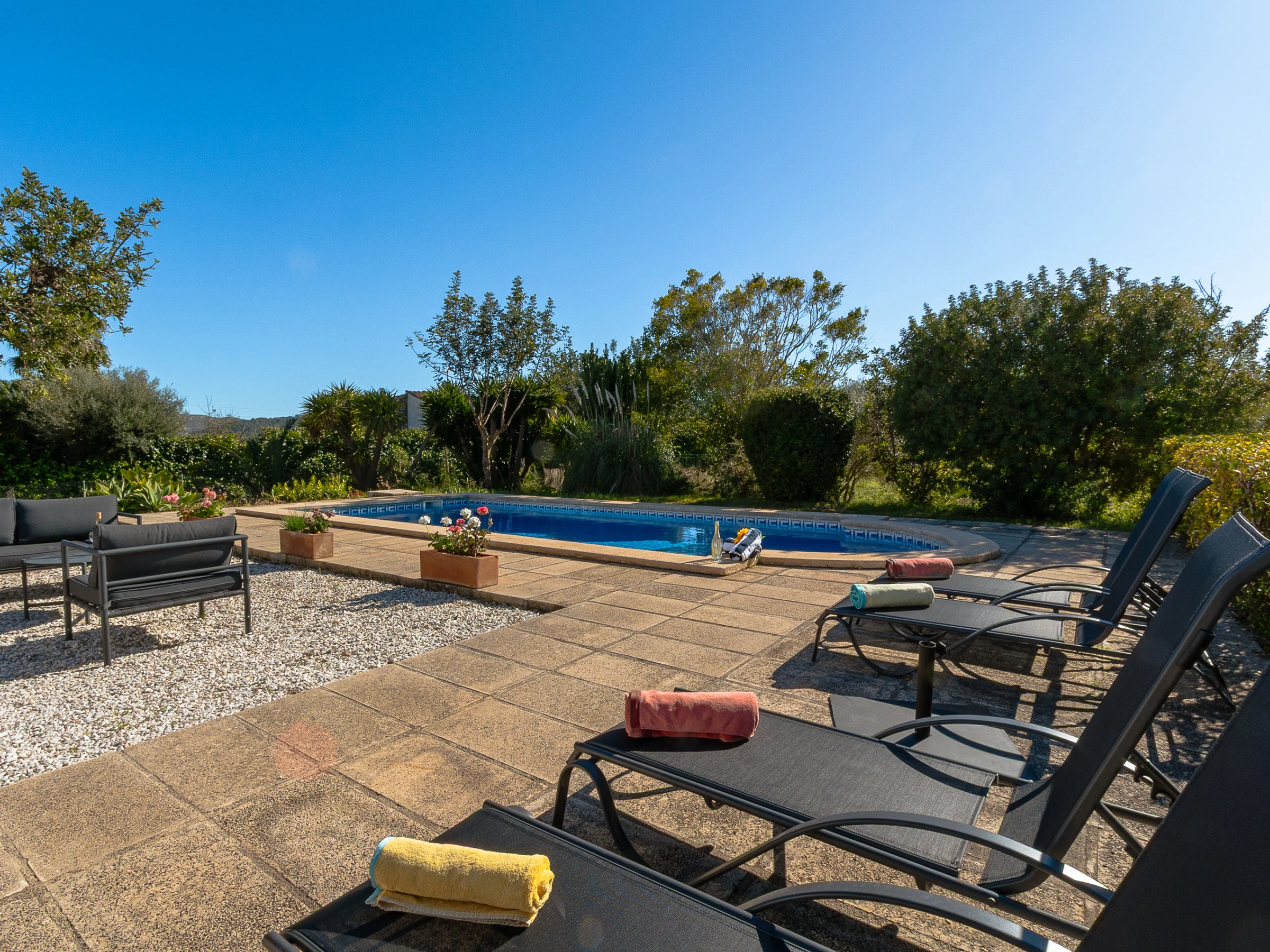La zona exterior de la finca invita a disfrutar: una gran piscina, cuidadas zonas ajardinadas, cuatro cómodas tumbonas y una zona de barbacoa con muebles de jardín crean el escenario perfecto para unas relajantes vacaciones bajo el sol.