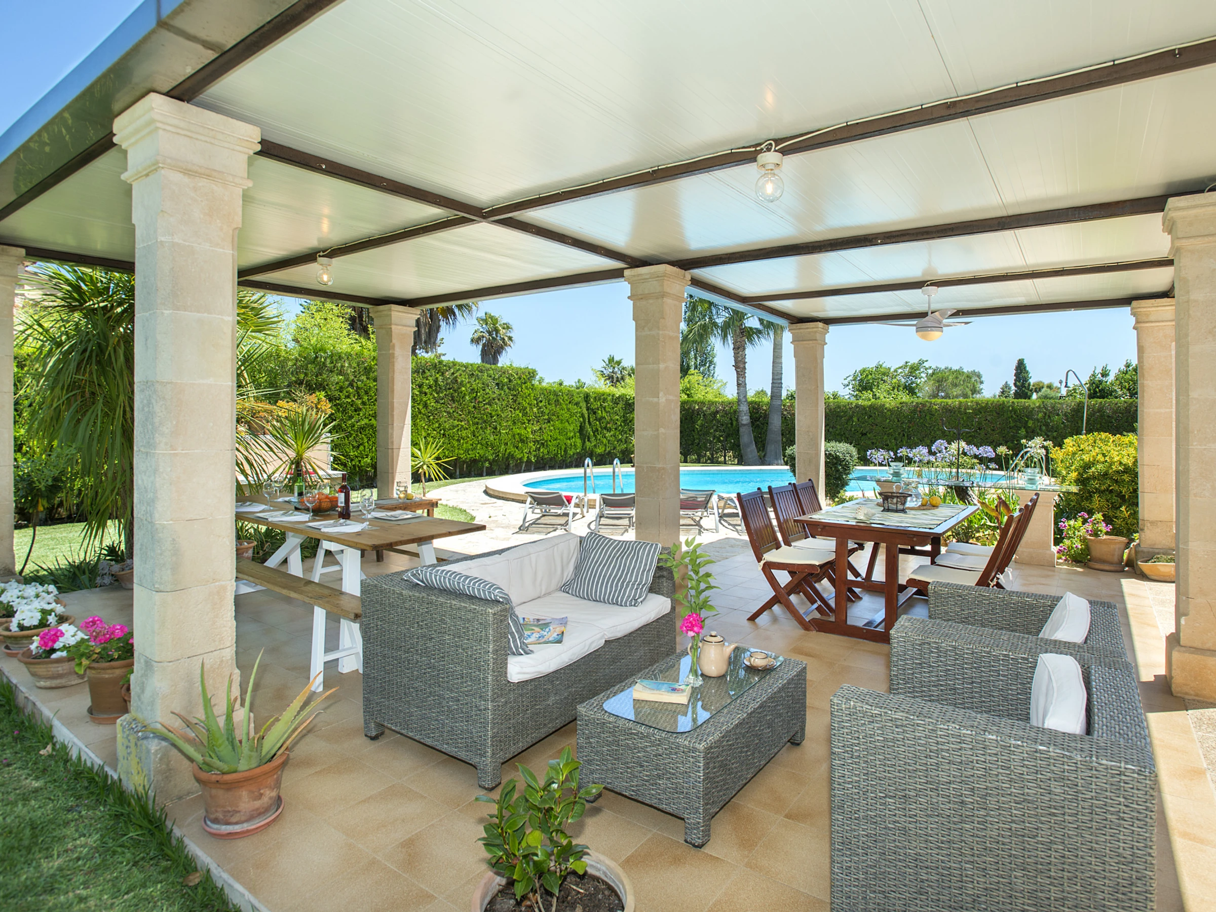 La piscina privada es enorme para disfrutarla durante sus vacaciones. La gran área de descanso y descanso cubierta al aire libre es solo uno de los aspectos más destacados de este hermoso chalet exclusivo. Las largas mesas de madera para comer y la moderna zona de estar, con cómodos sofás con vistas a la zona de la piscina, hacen de esta zona una terraza independiente única. Junto con la zona de barbacoa invita a eventos inolvidables de barbacoa y grandes cenas con amigos y familiares. Desde la piscina se puede disfrutar de una vista de las copas de los árboles vecinos y el shilouette de las montañas de la Sierra de Tramuntana, patrimonio mundial desde [hidden] entrada privada te lleva directamente a la zona de aparcamiento cubierto del chalet, con la entrada principal en la parte delantera de la casa. Hay espacio para aparcar dos coches fácilmente.