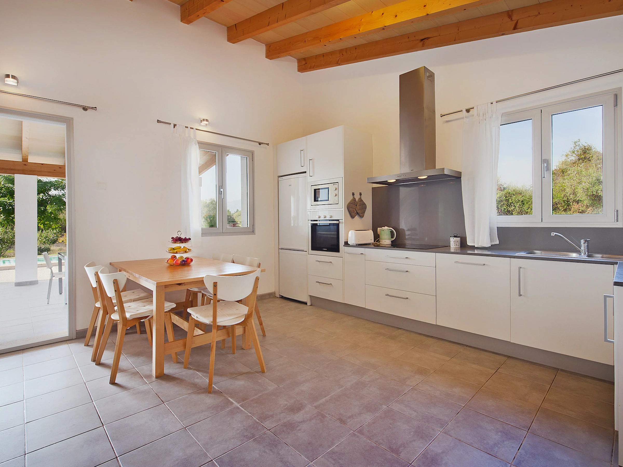 La villa cuenta con una amplia zona de estar y comedor de planta abierta, conectada sin problemas a una gran terraza cubierta en la parte trasera a través de amplias puertas de vidrio. Desde la terraza, puede admirar la piscina privada orientada al sur y el exuberante entorno natural, creando un retiro tranquilo para la relajación.