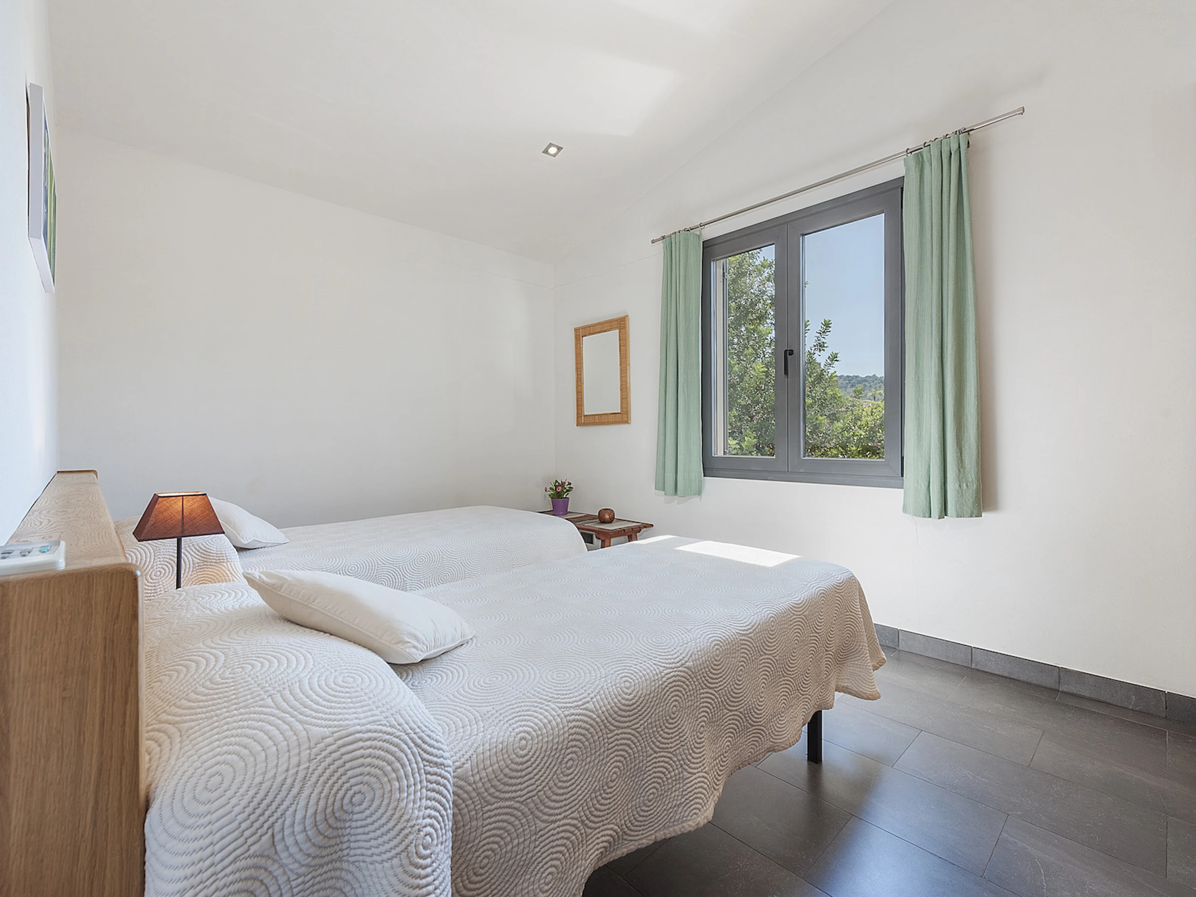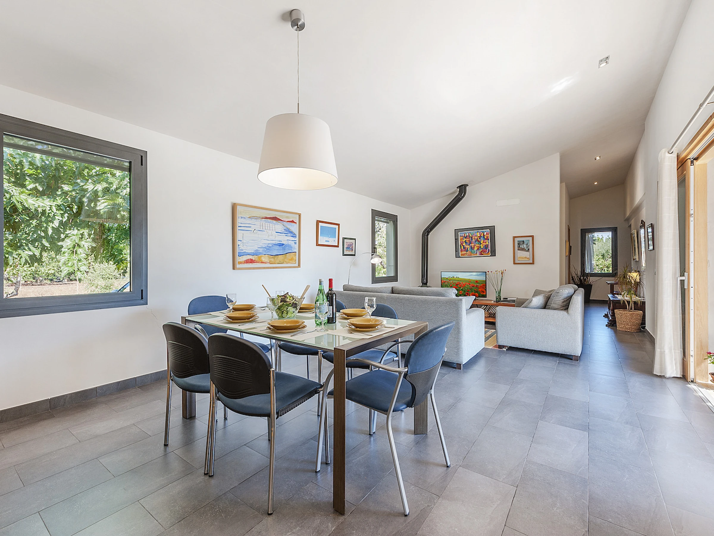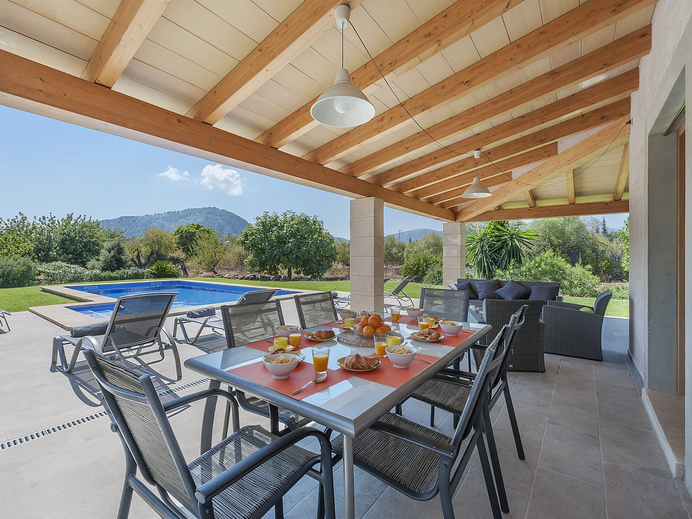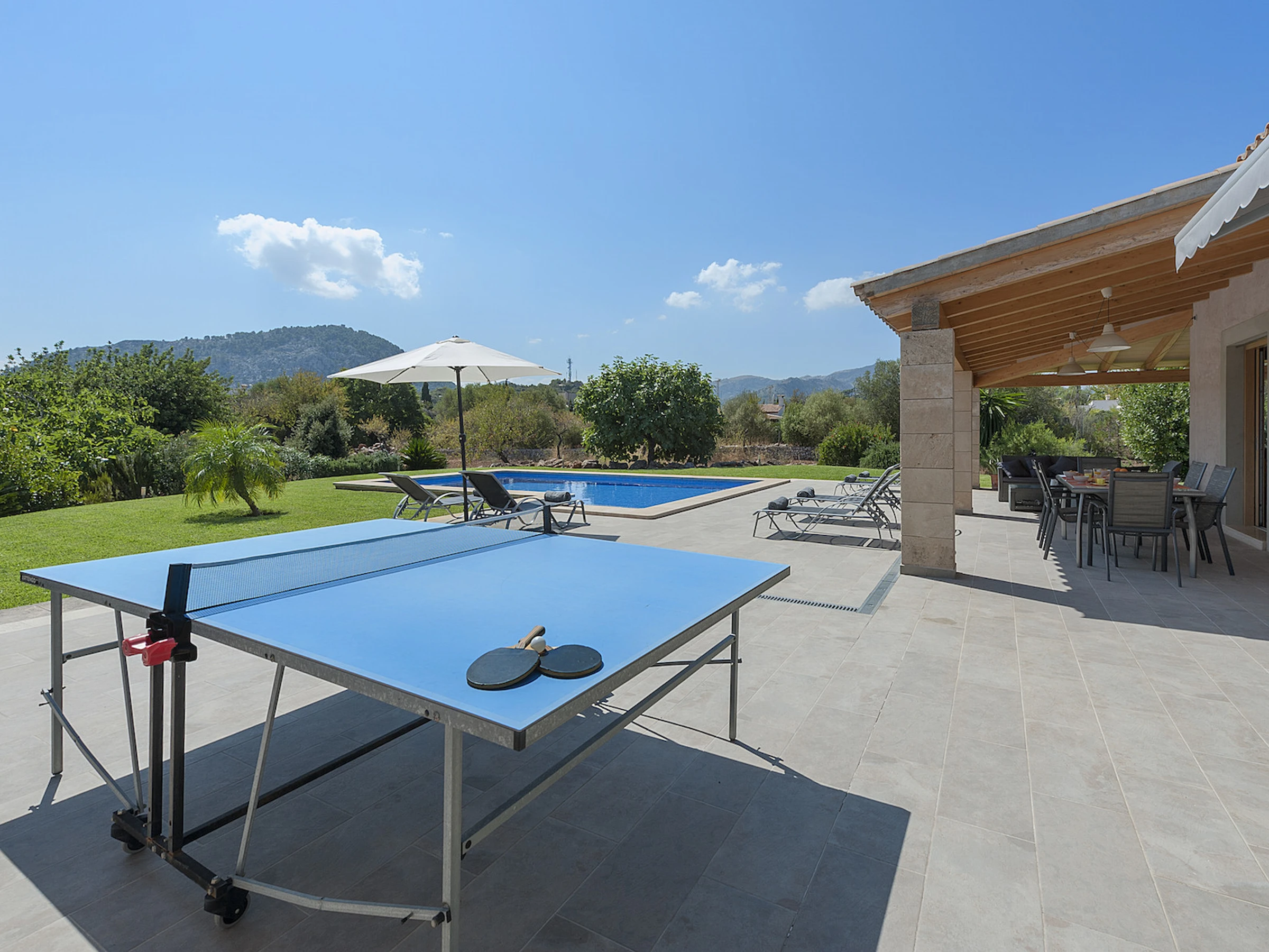 El exterior de la villa está diseñado para disfrutar plenamente del clima mediterráneo. La terraza de la piscina ofrece impresionantes vistas de las montañas de La Font, mientras que la terraza superior presume de vistas al majestuoso Puig Maria y las laderas de Santuiri, proporcionando un entorno relajante y sereno. Los huéspedes también pueden disfrutar de una partida de ping pong, perfecta para el entretenimiento familiar.