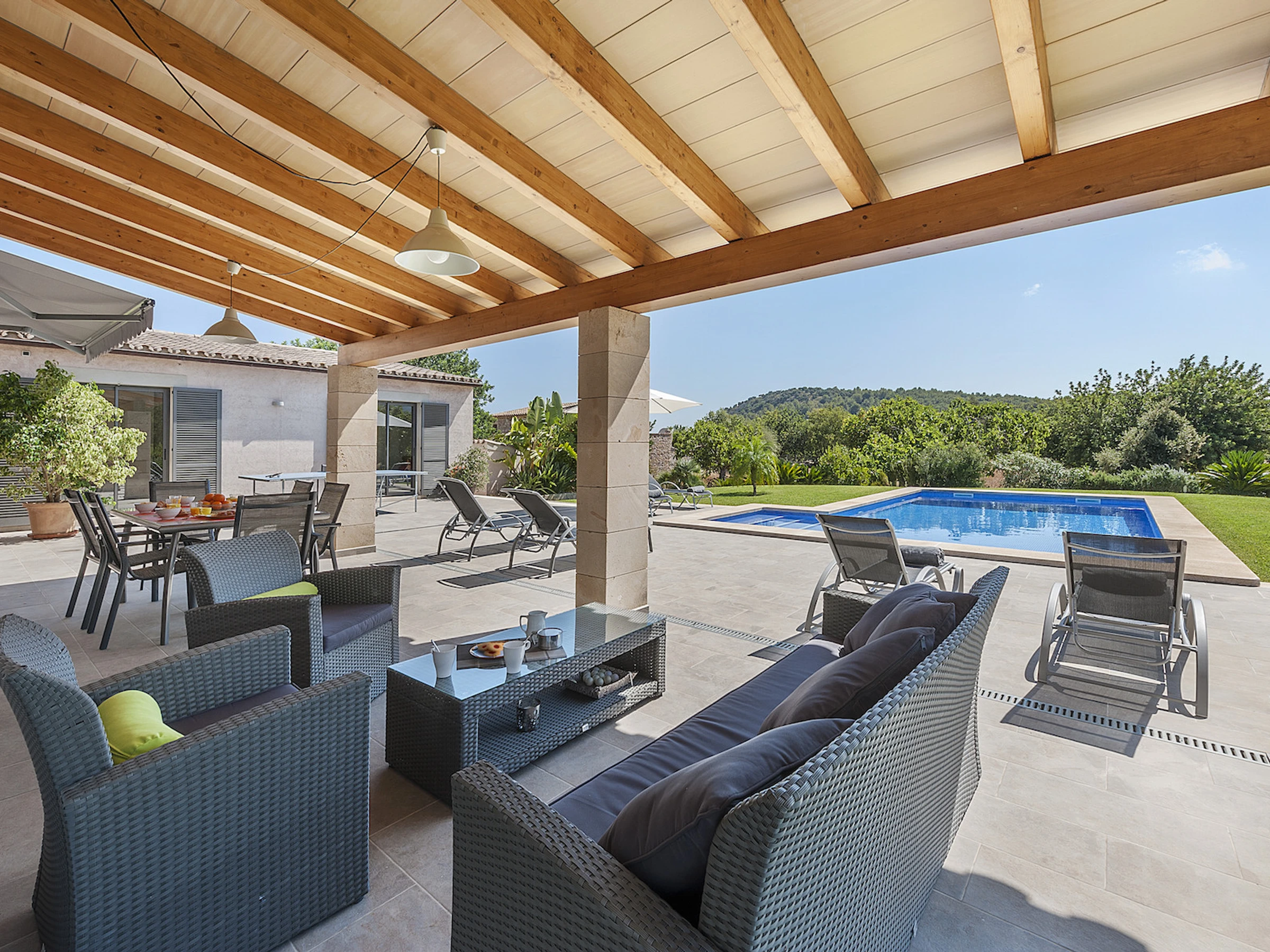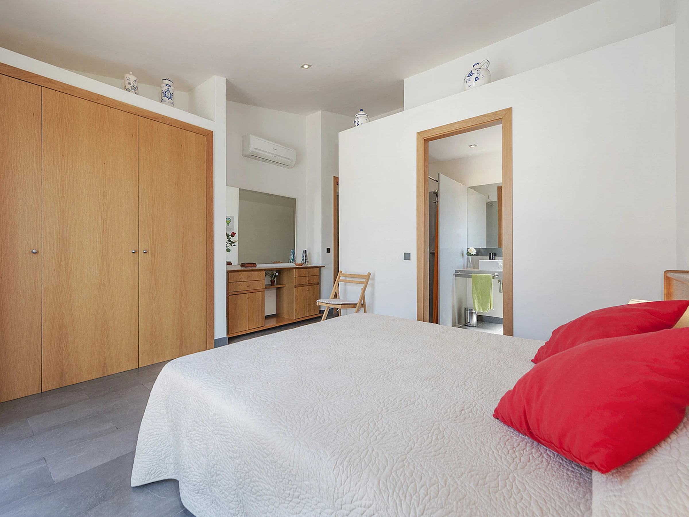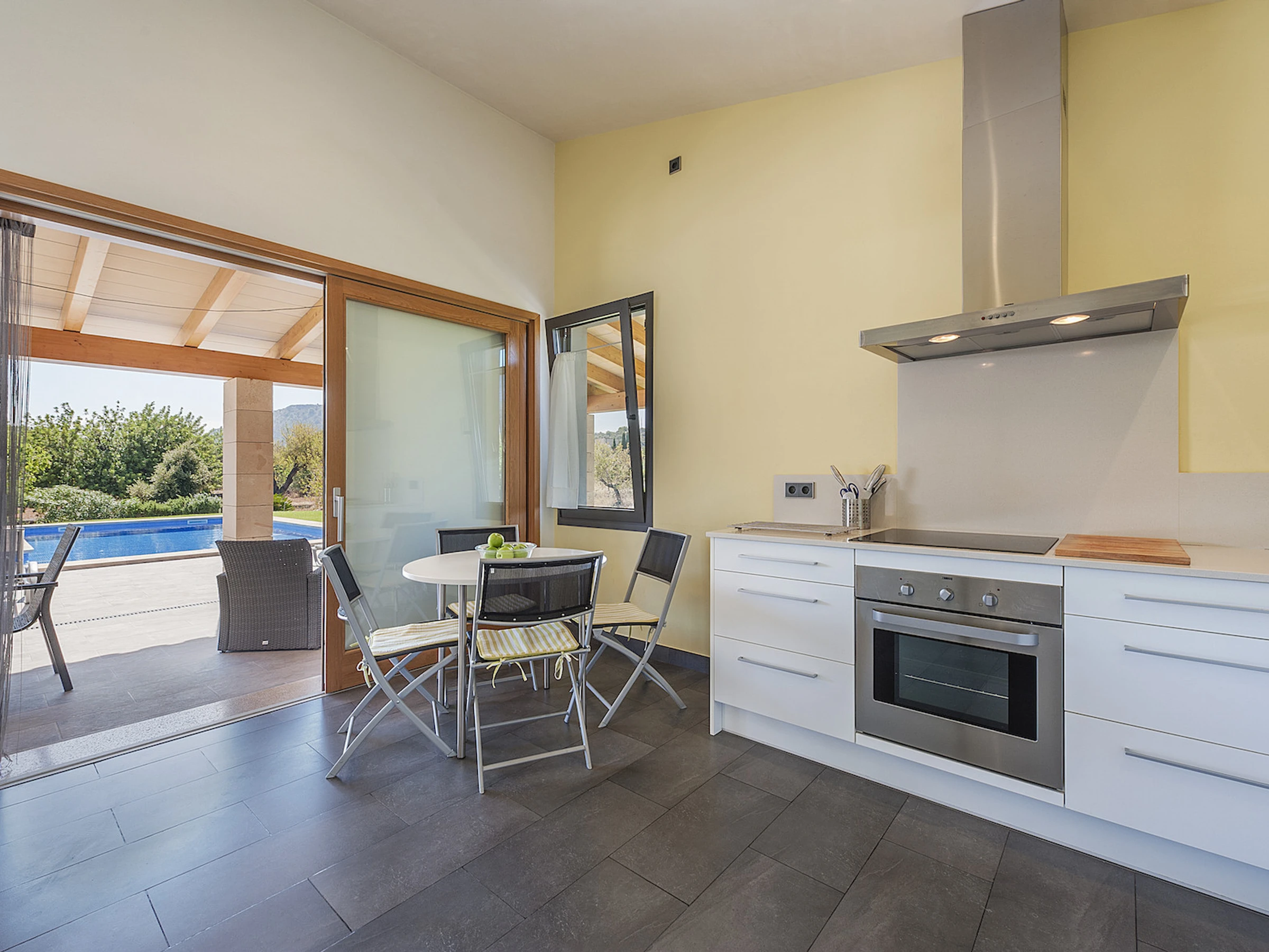 El exterior de la villa está diseñado para disfrutar plenamente del clima mediterráneo. La terraza de la piscina ofrece impresionantes vistas de las montañas de La Font, mientras que la terraza superior presume de vistas al majestuoso Puig Maria y las laderas de Santuiri, proporcionando un entorno relajante y sereno. Los huéspedes también pueden disfrutar de una partida de ping pong, perfecta para el entretenimiento familiar.