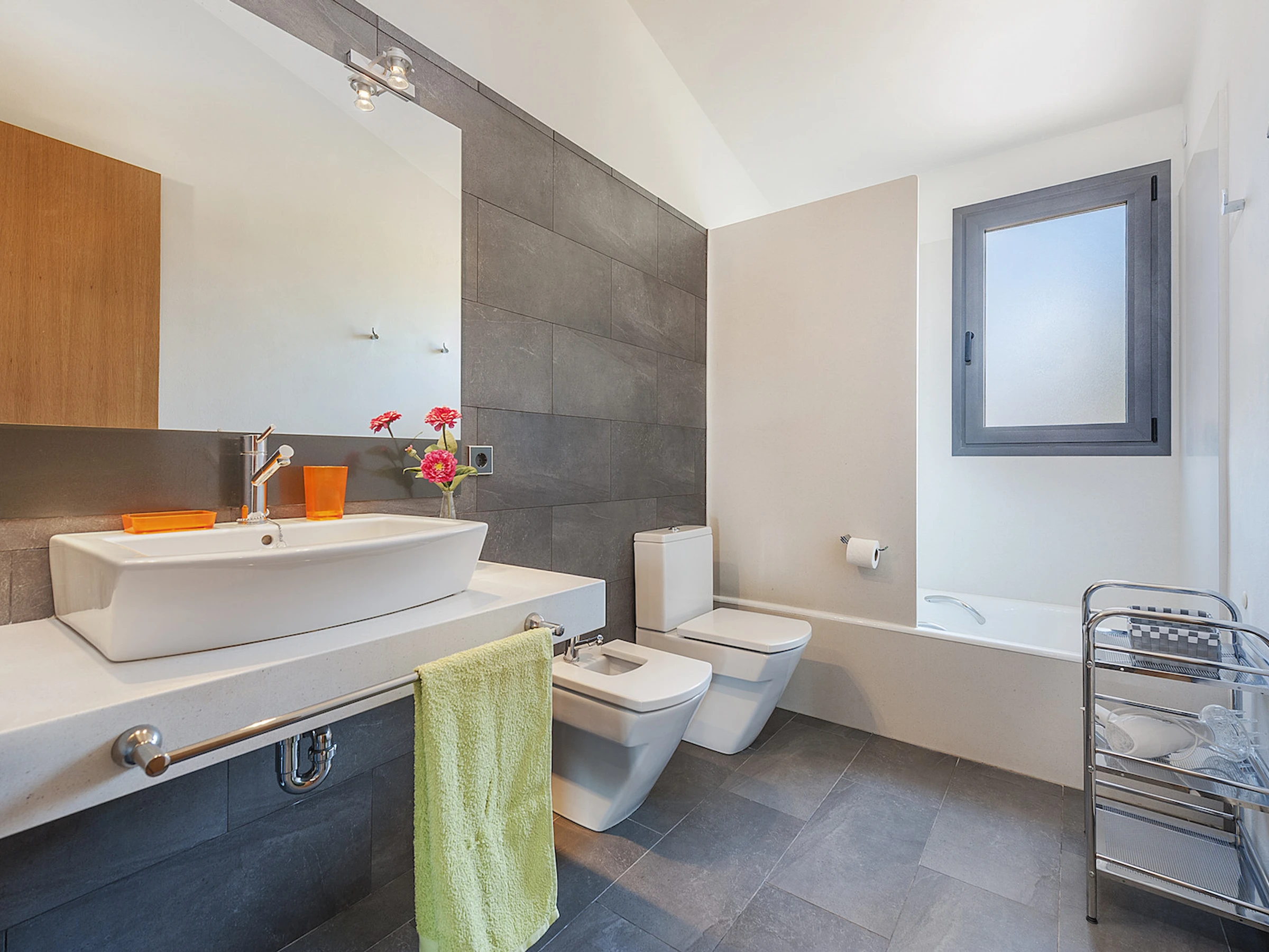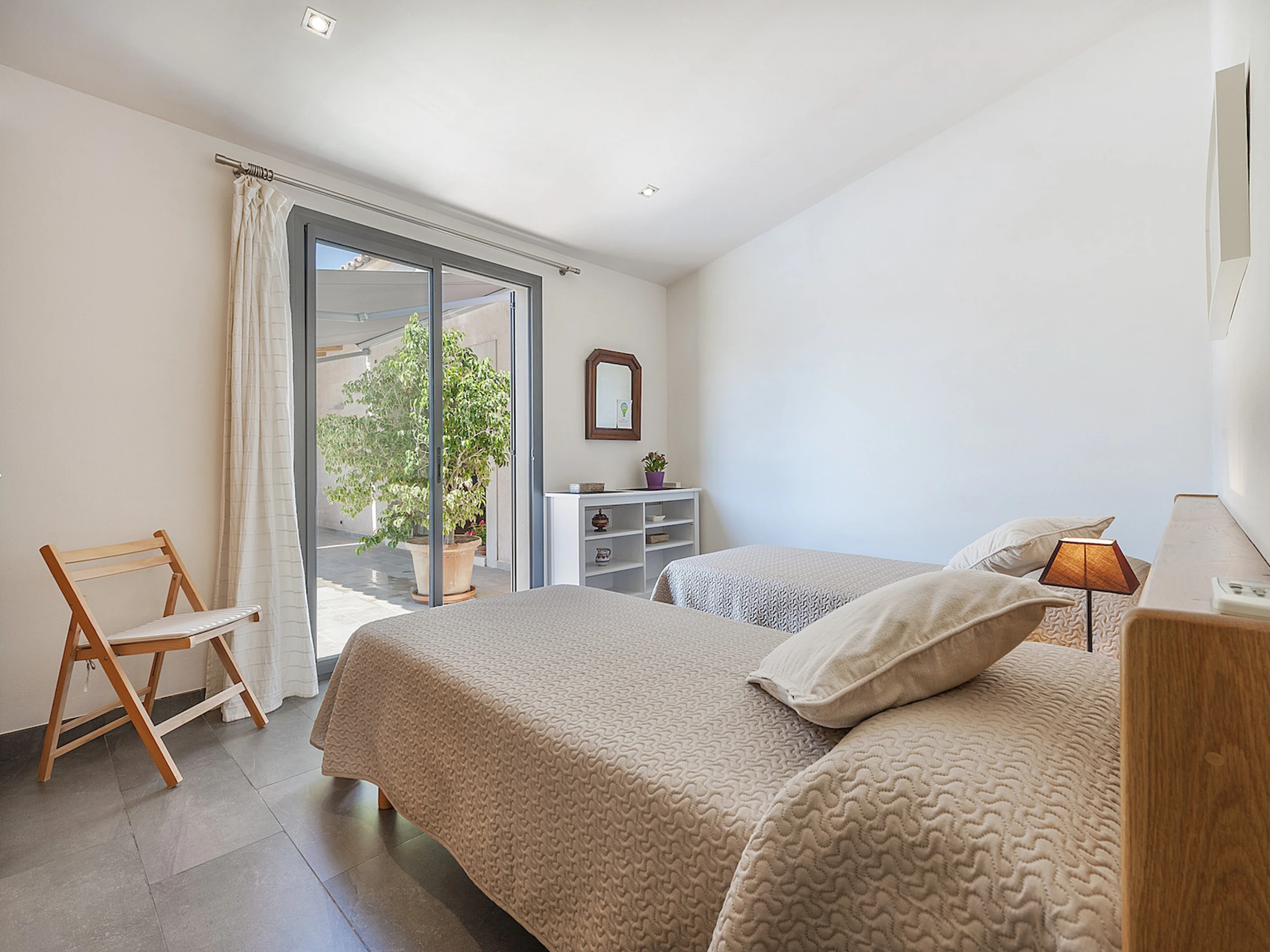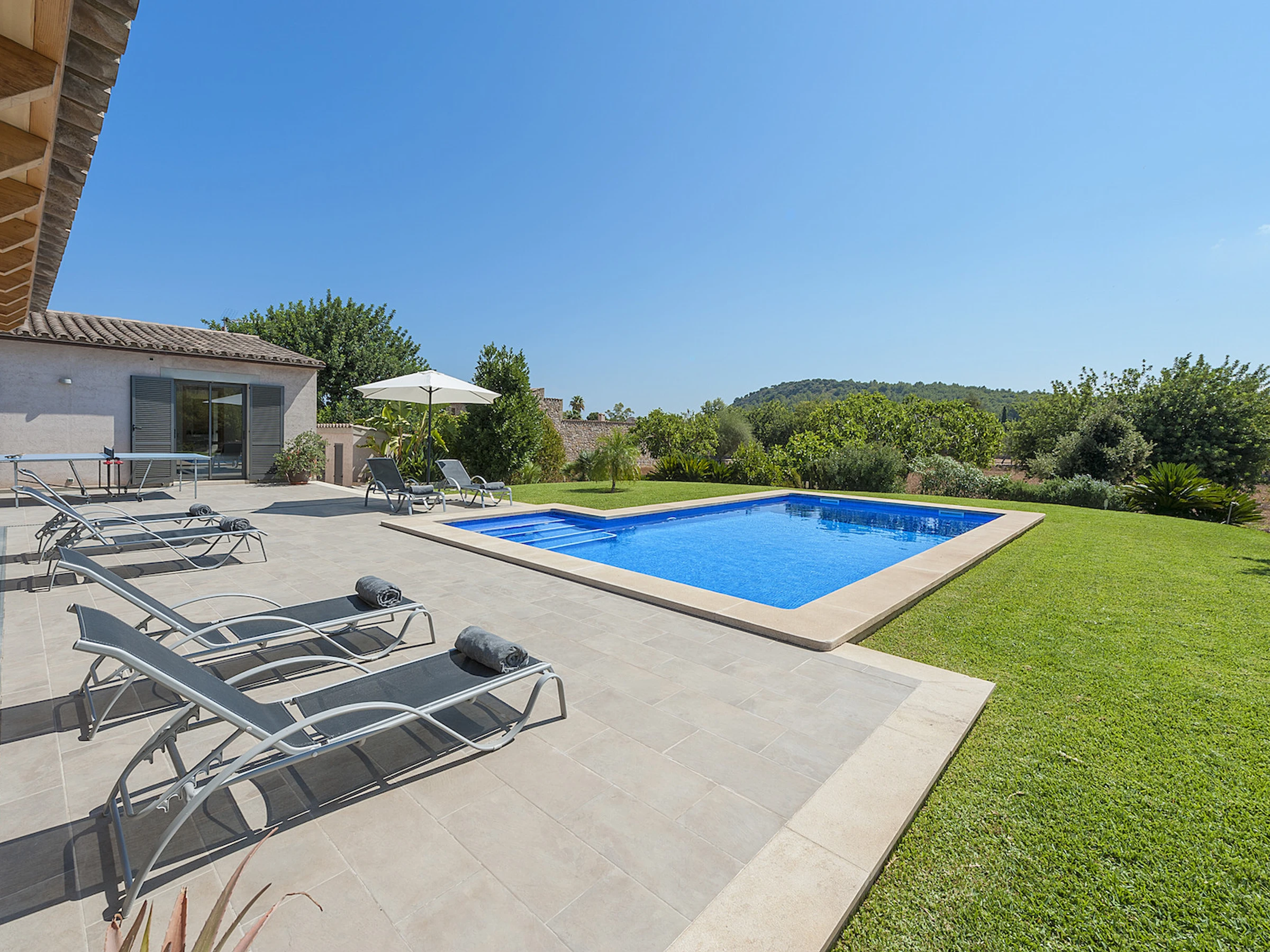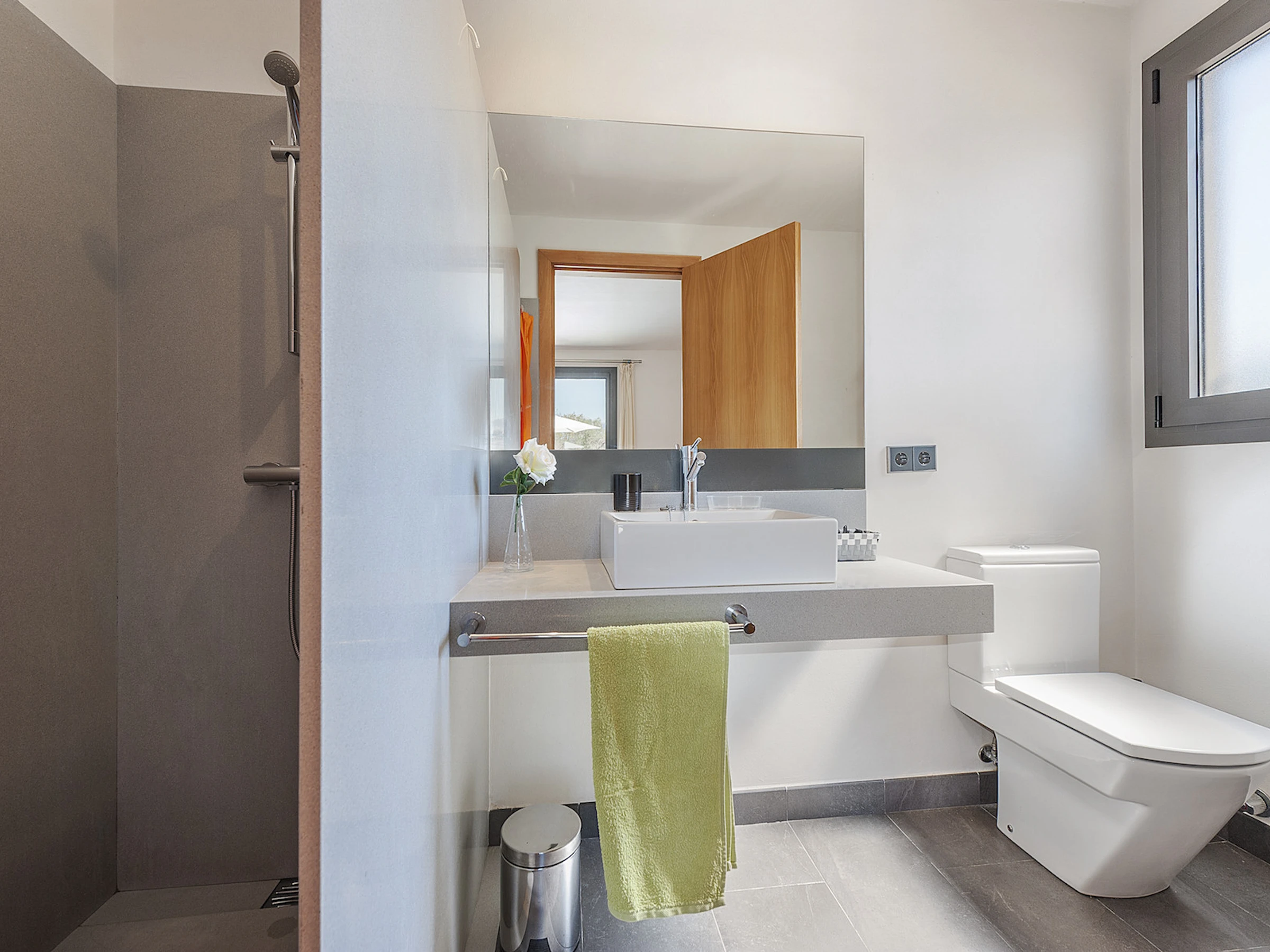 El exterior de la villa está diseñado para disfrutar plenamente del clima mediterráneo. La terraza de la piscina ofrece impresionantes vistas de las montañas de La Font, mientras que la terraza superior presume de vistas al majestuoso Puig Maria y las laderas de Santuiri, proporcionando un entorno relajante y sereno. Los huéspedes también pueden disfrutar de una partida de ping pong, perfecta para el entretenimiento familiar.