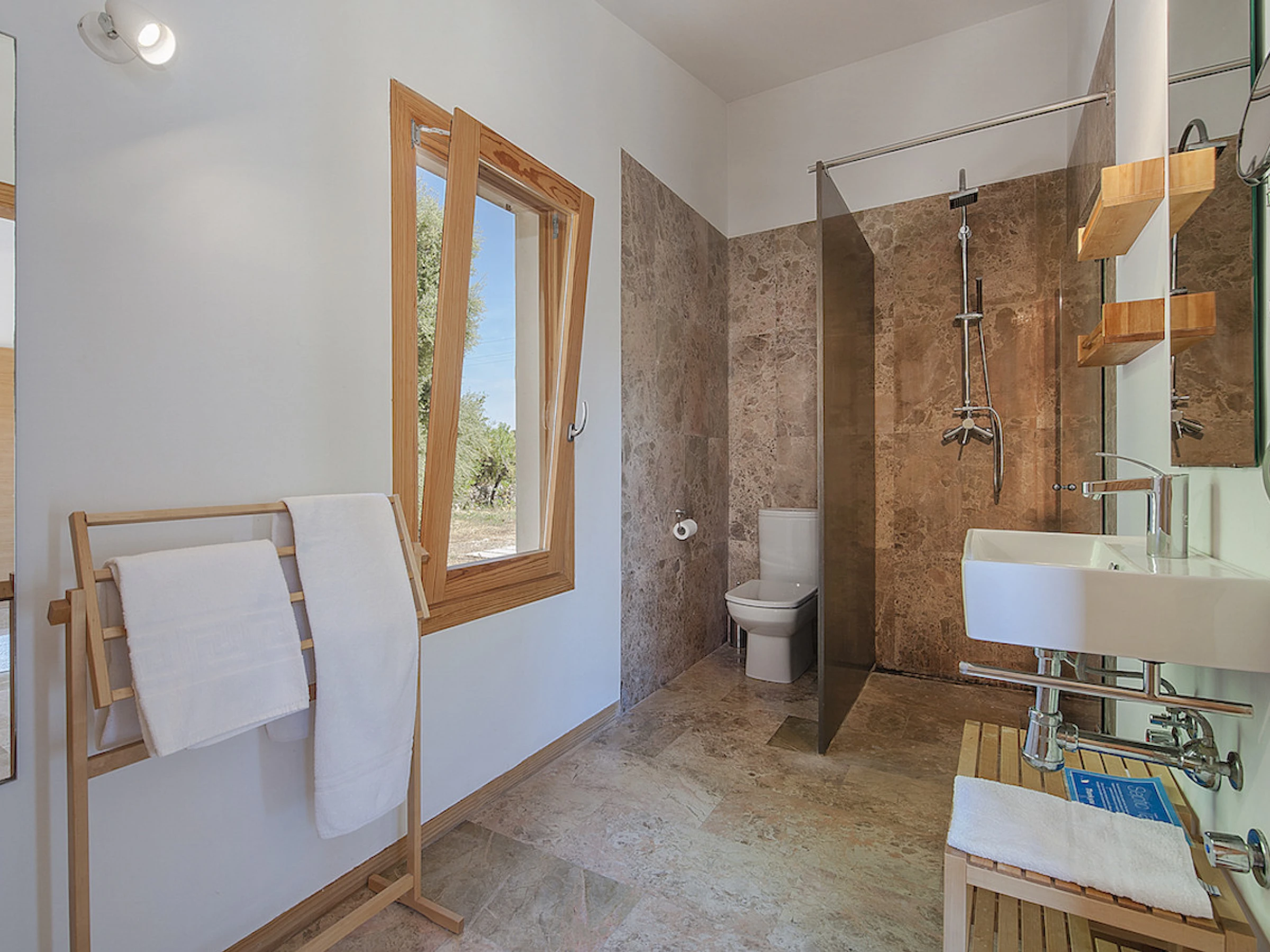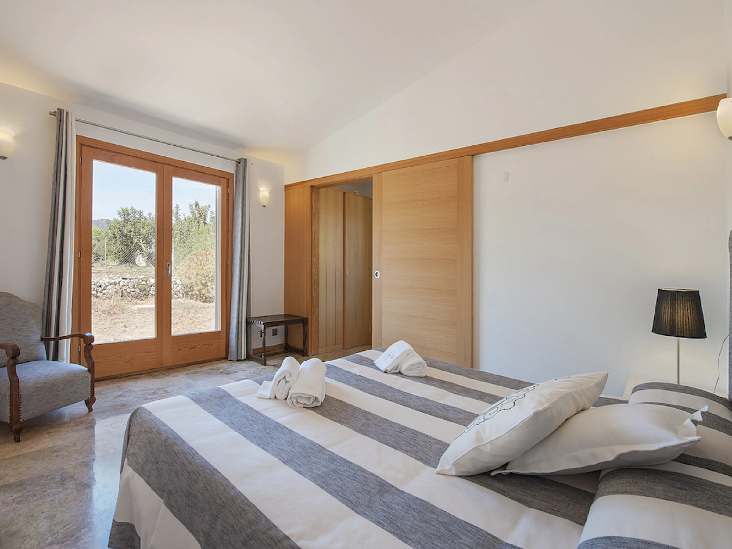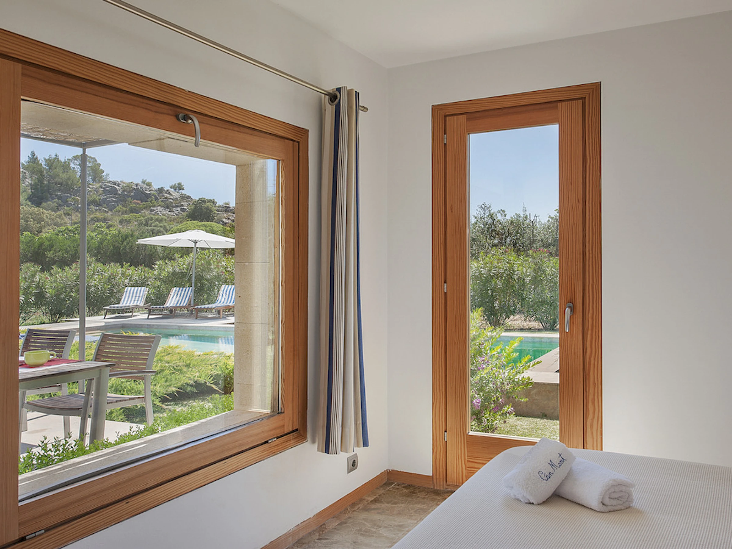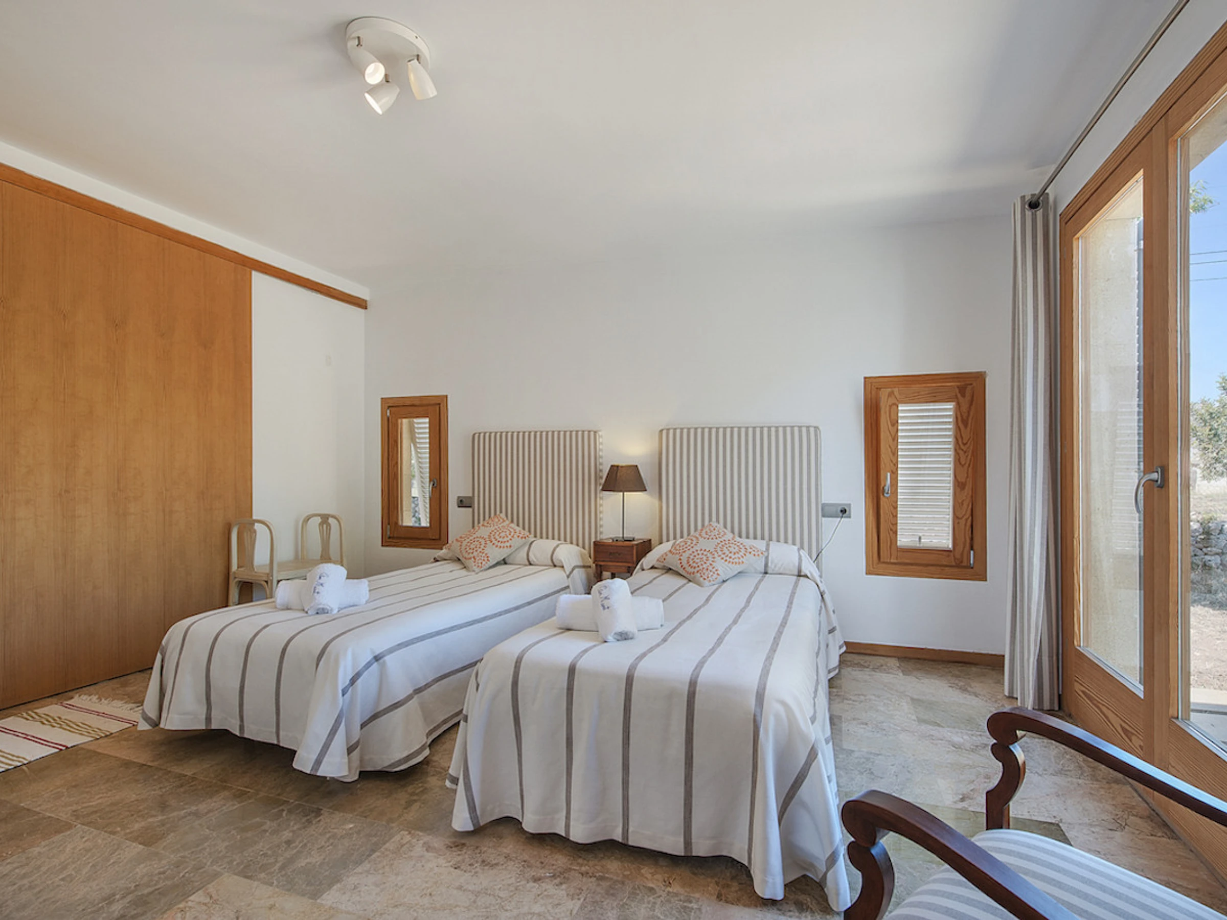 La villa, construida en una sola planta, cuenta con 3 habitaciones, todas equipadas con aire acondicionado. Dos de ellas son habitaciones dobles, y la tercera tiene dos camas individuales. Todas las habitaciones tienen acceso directo a la piscina privada de 9x3 metros y a la espaciosa terraza, ideal para disfrutar de momentos de relajación al aire libre. La propiedad también dispone de dos baños, uno de ellos en suite para mayor comodidad.