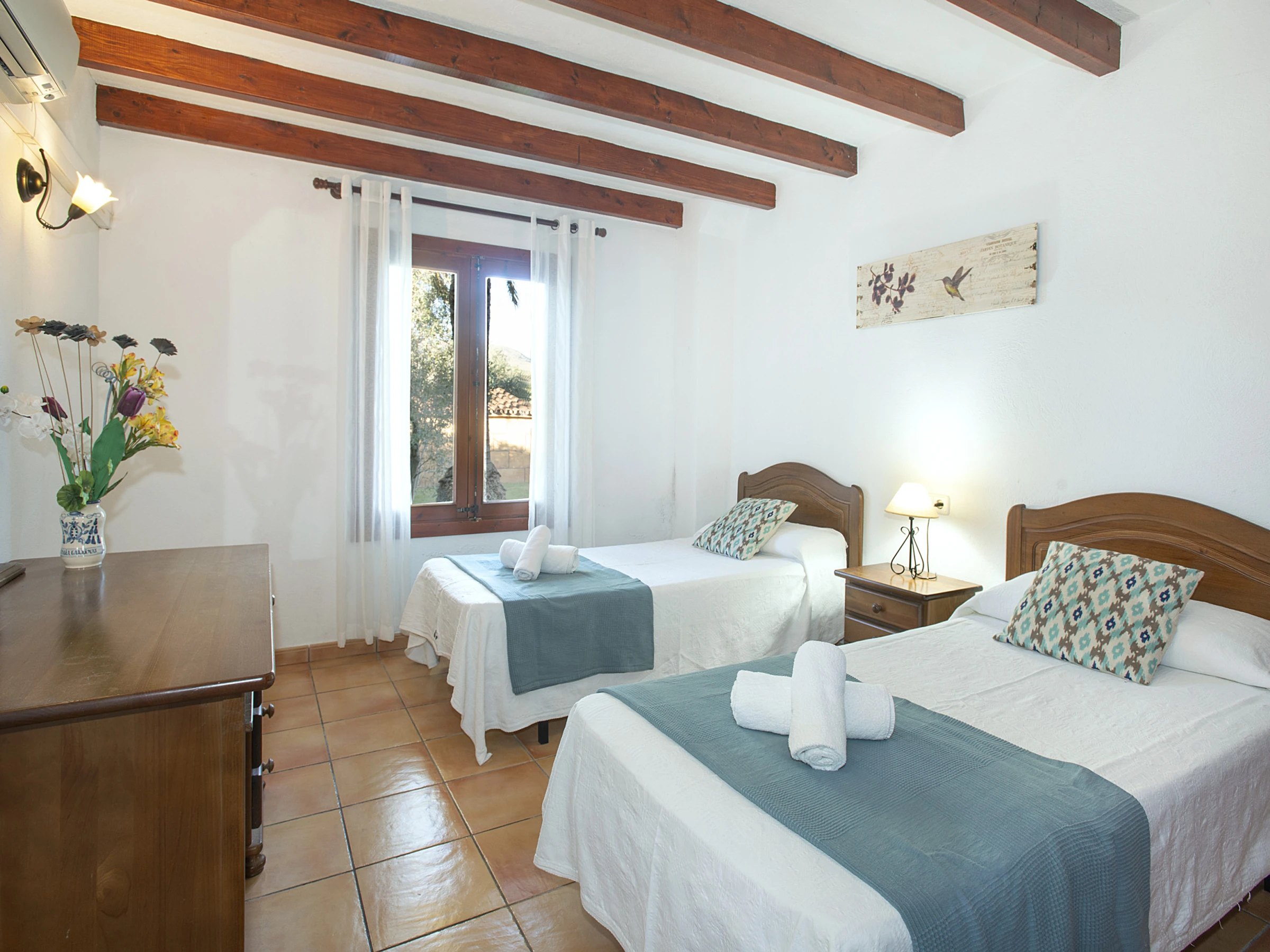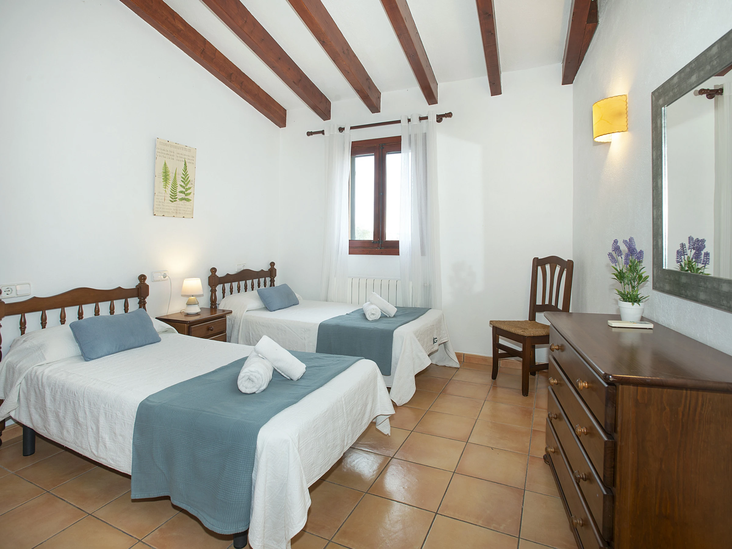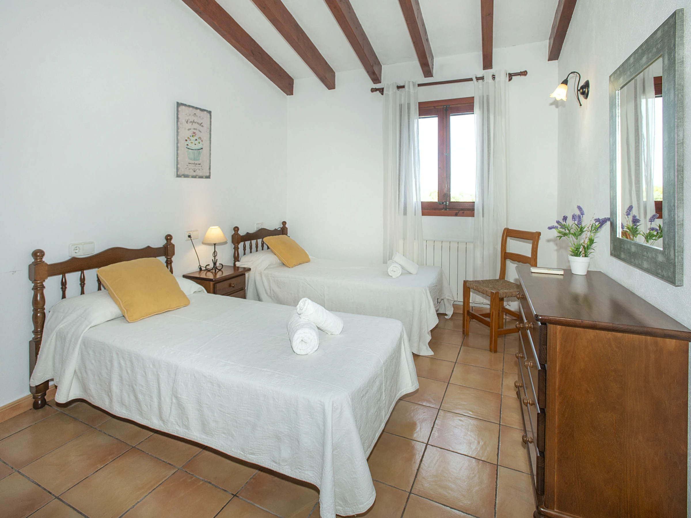 En la planta baja se encuentra una habitación con dos camas individuales y un baño con ducha. El resto de dormitorios se ubican en la planta superior, a la que se accede desde el salón comedor. Un pasillo distribuye cinco habitaciones adicionales: dos dormitorios dobles con baño privado (uno con bañera y otro con ducha) y acceso a un generoso balcón compartido con vistas a las montañas; y tres dormitorios con dos camas individuales cada uno, todos con agradables vistas al jardín, la piscina o el paisaje circundante.