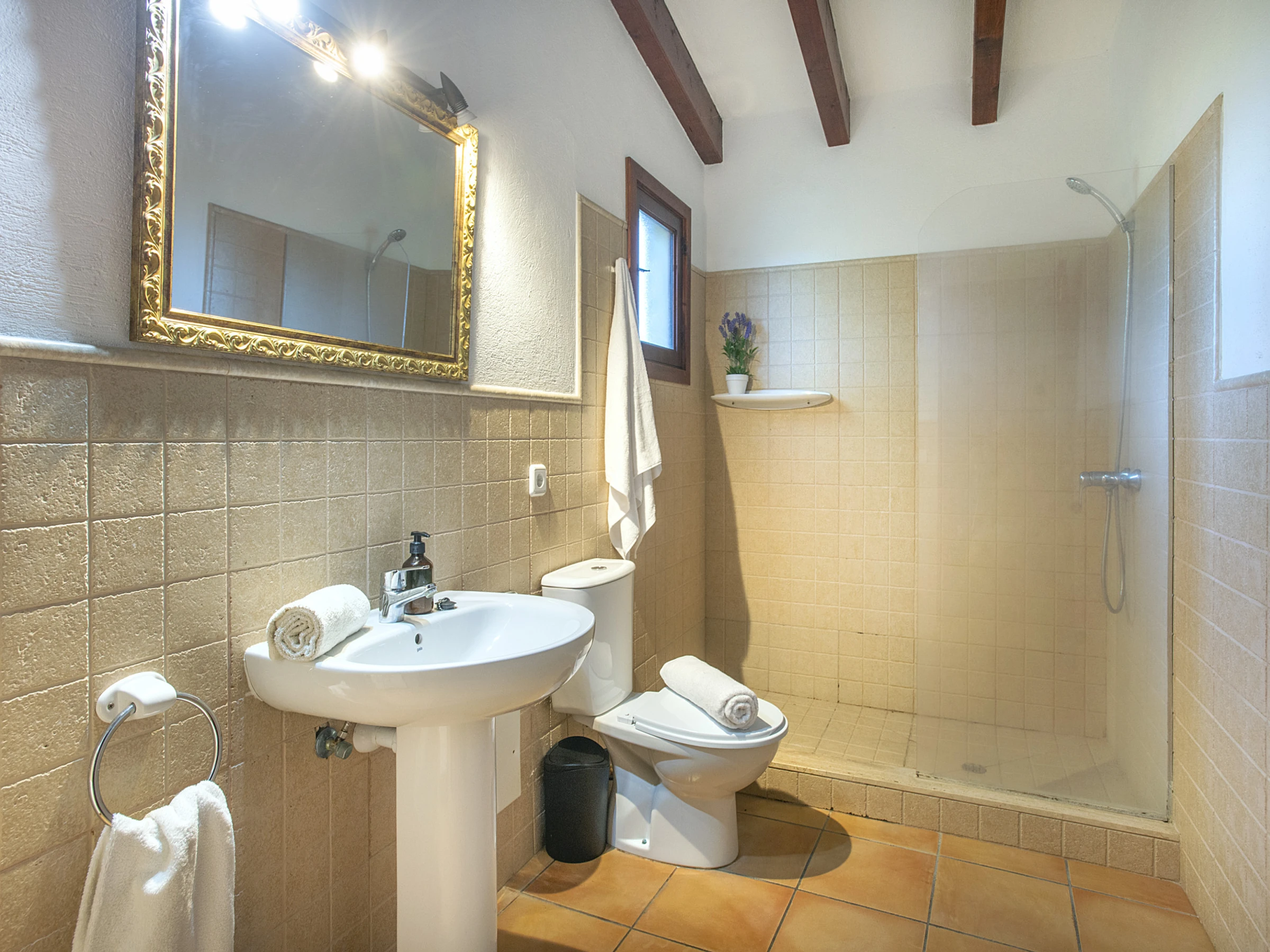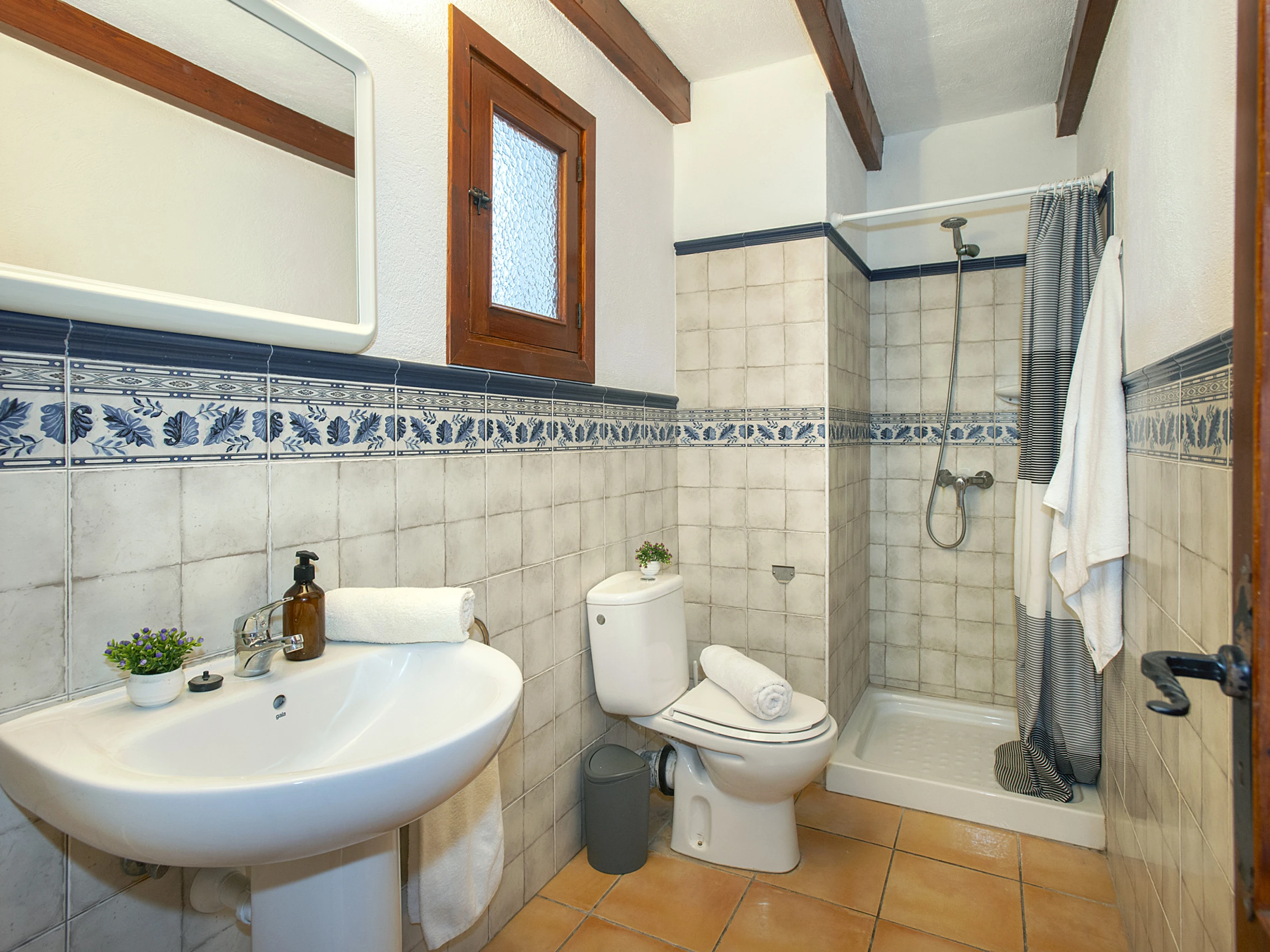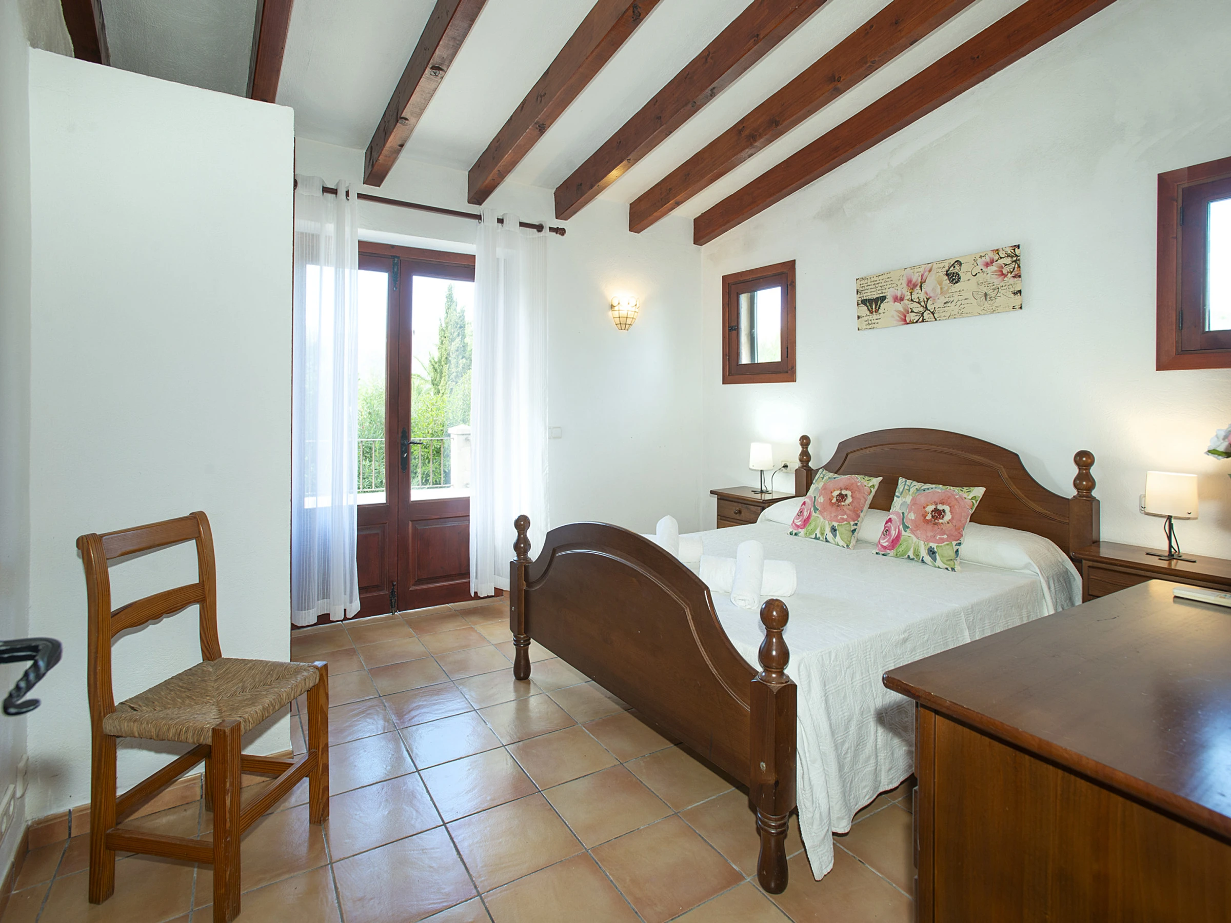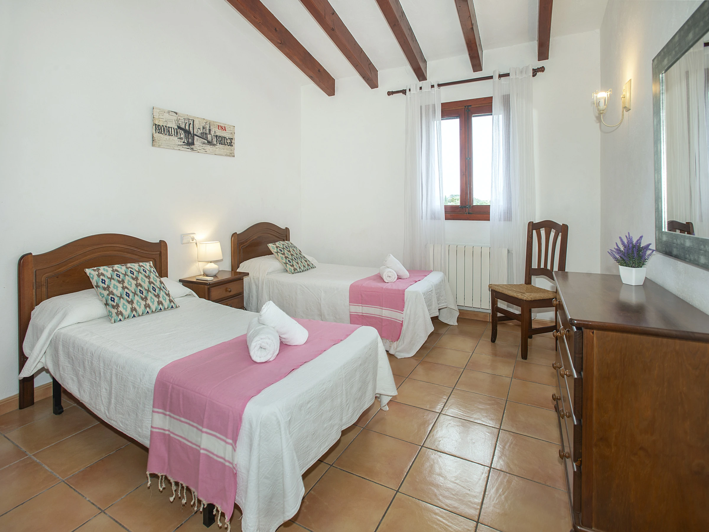 En la planta baja se encuentra una habitación con dos camas individuales y un baño con ducha. El resto de dormitorios se ubican en la planta superior, a la que se accede desde el salón comedor. Un pasillo distribuye cinco habitaciones adicionales: dos dormitorios dobles con baño privado (uno con bañera y otro con ducha) y acceso a un generoso balcón compartido con vistas a las montañas; y tres dormitorios con dos camas individuales cada uno, todos con agradables vistas al jardín, la piscina o el paisaje circundante.