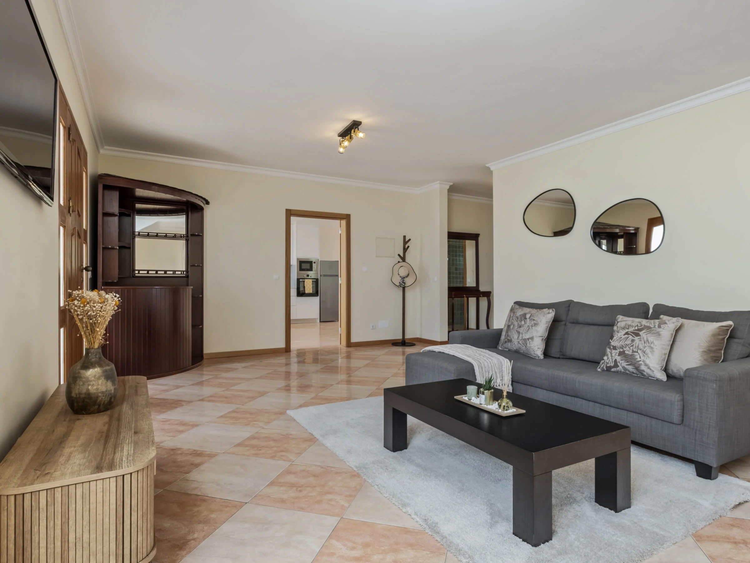 Con una decoración contemporánea, tonos suaves y acabados de calidad, los interiores de Amendoeira Residence transmiten ligereza y bienestar. El salón, amplio y luminoso, se conecta armoniosamente con la cocina totalmente equipada, creando un ambiente funcional y agradable para momentos de convivencia y descanso.