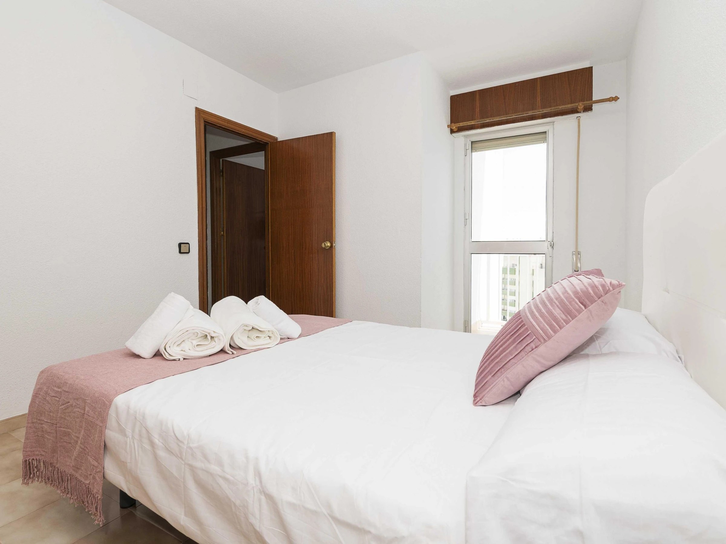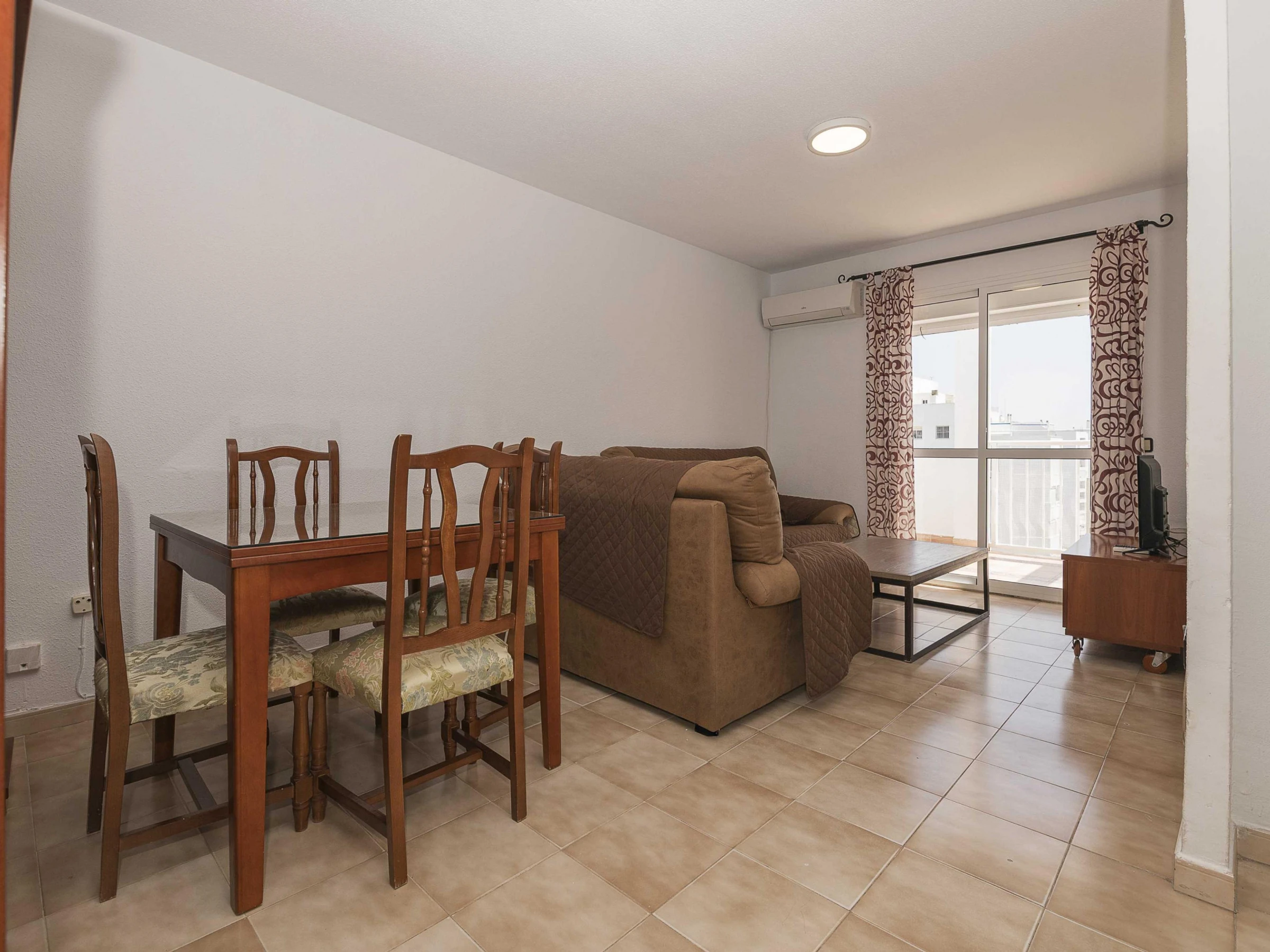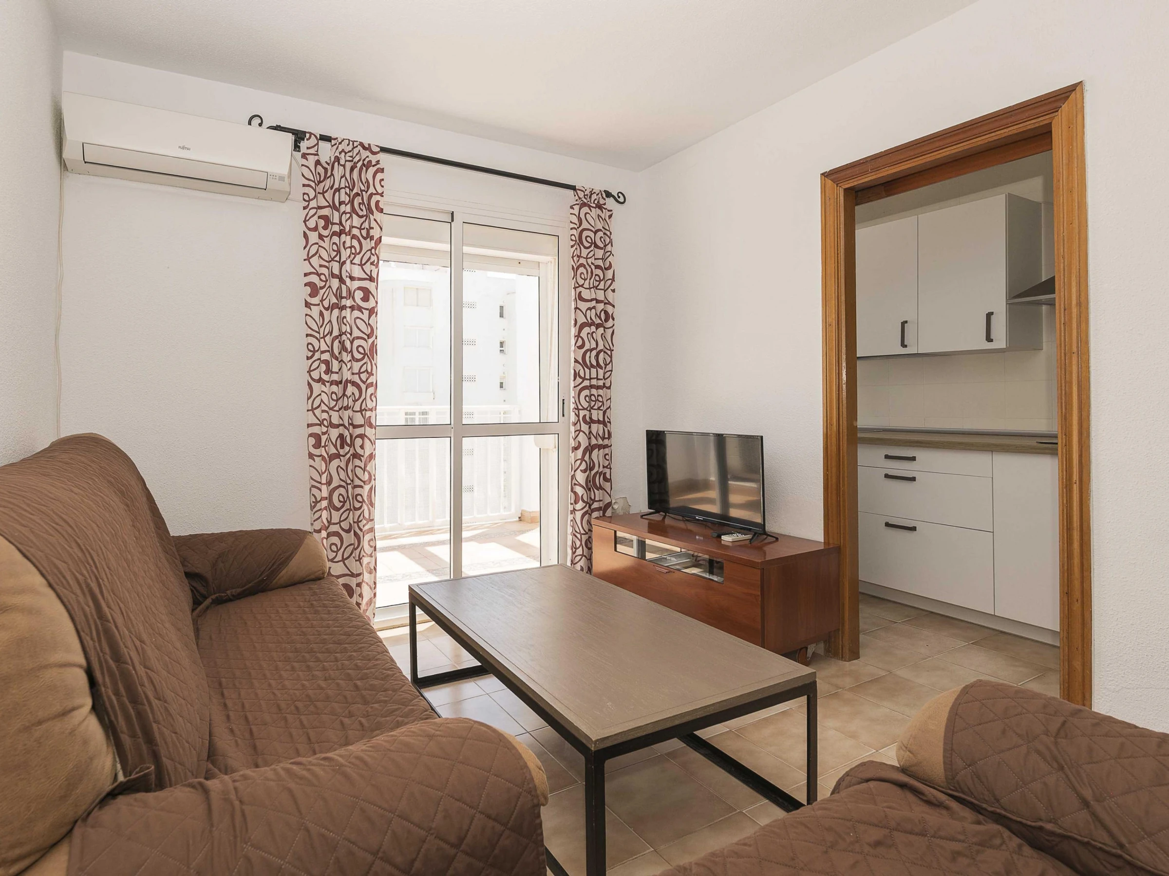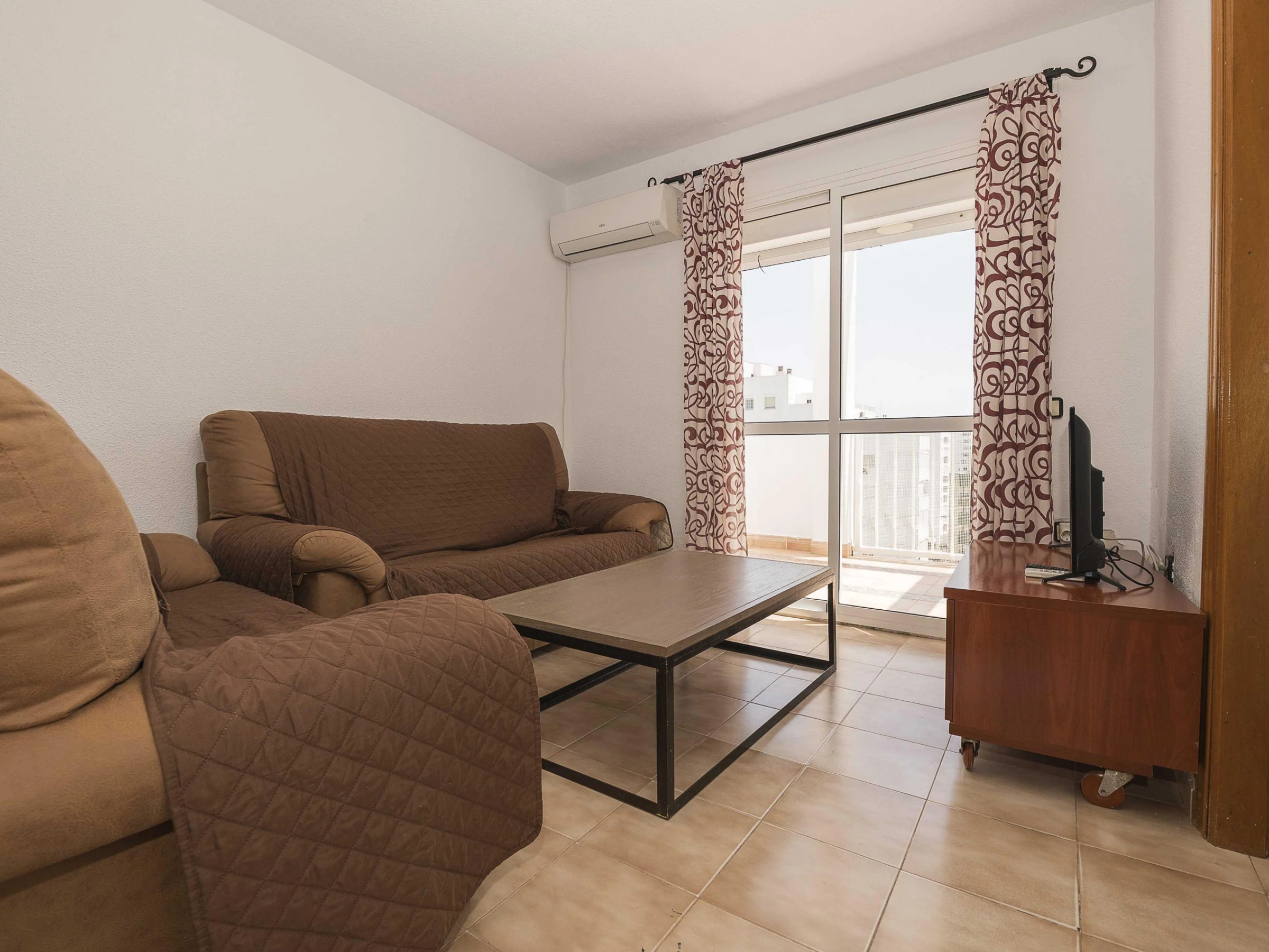 El apartamento se encuentra en un noveno piso de un edificio con ascensor. Dispone de un pequeño balcón con una mesa y cuatro sillas ideal para desayunar contemplando las vistas al mar. En el interior el salón-comedor está equipado con aire acondicionado y Smart TV. La cocina de vitrocerámica cuenta con todos los utensilios necesarios para que cocinen con comodidad. Hay lavadora, plancha y tabla de planchar. A la hora de dormir disponen de dos dormitorios: uno con cama doble y otro con una litera con dos camas individuales. Además hay un baño con bañera que completa su estancia. Si viajan con su bebé podemos proporcionarles una cuna y una trona.