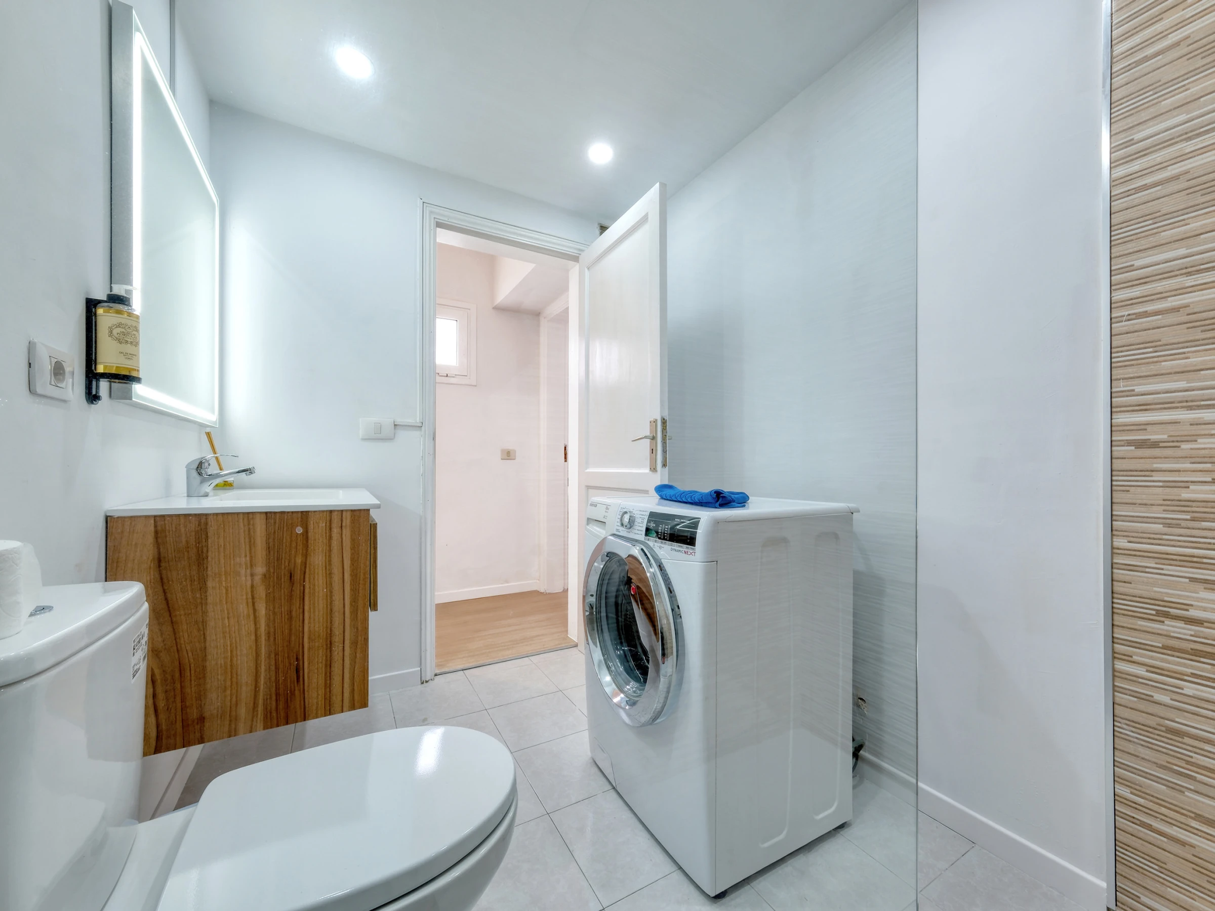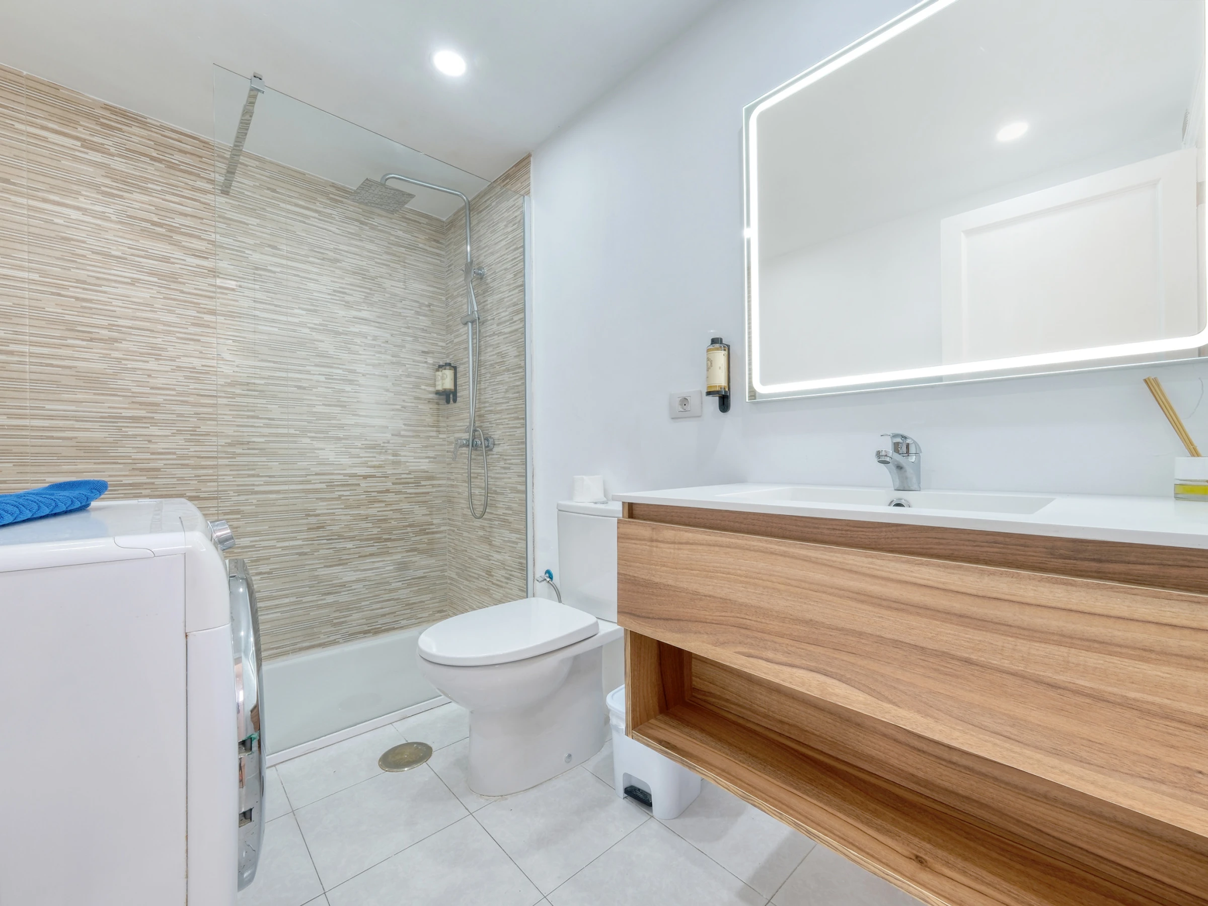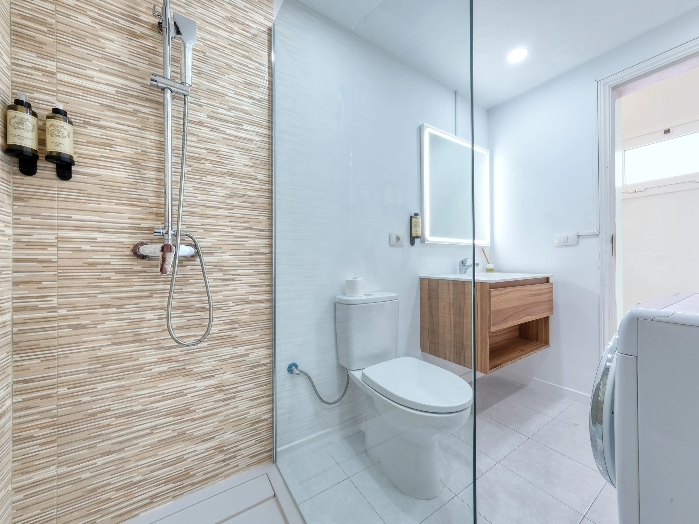 El baño es completo, con ducha y lavadora. También hay plancha y tabla de planchar a disposición de los huéspedes, así como una caja fuerte.