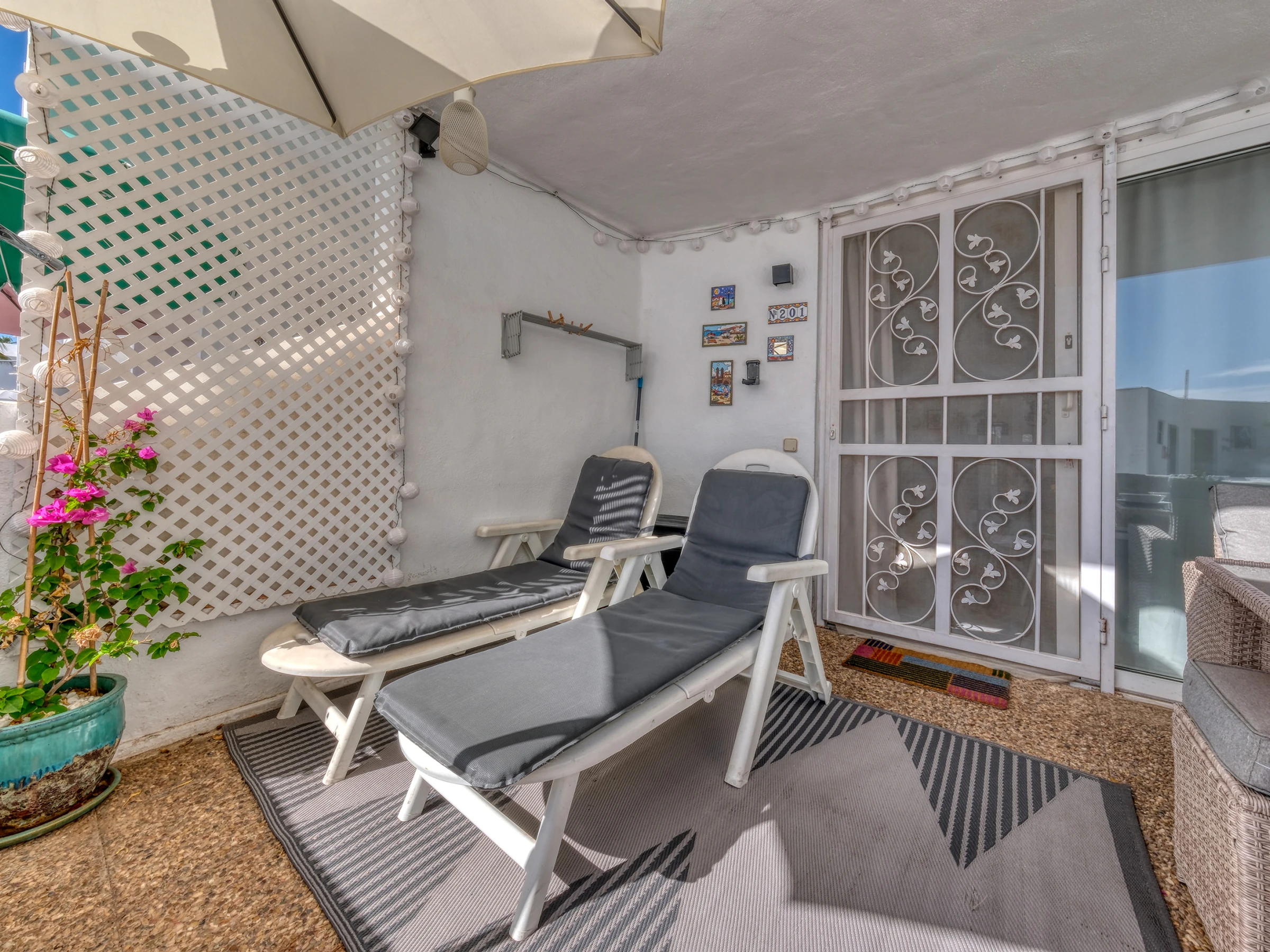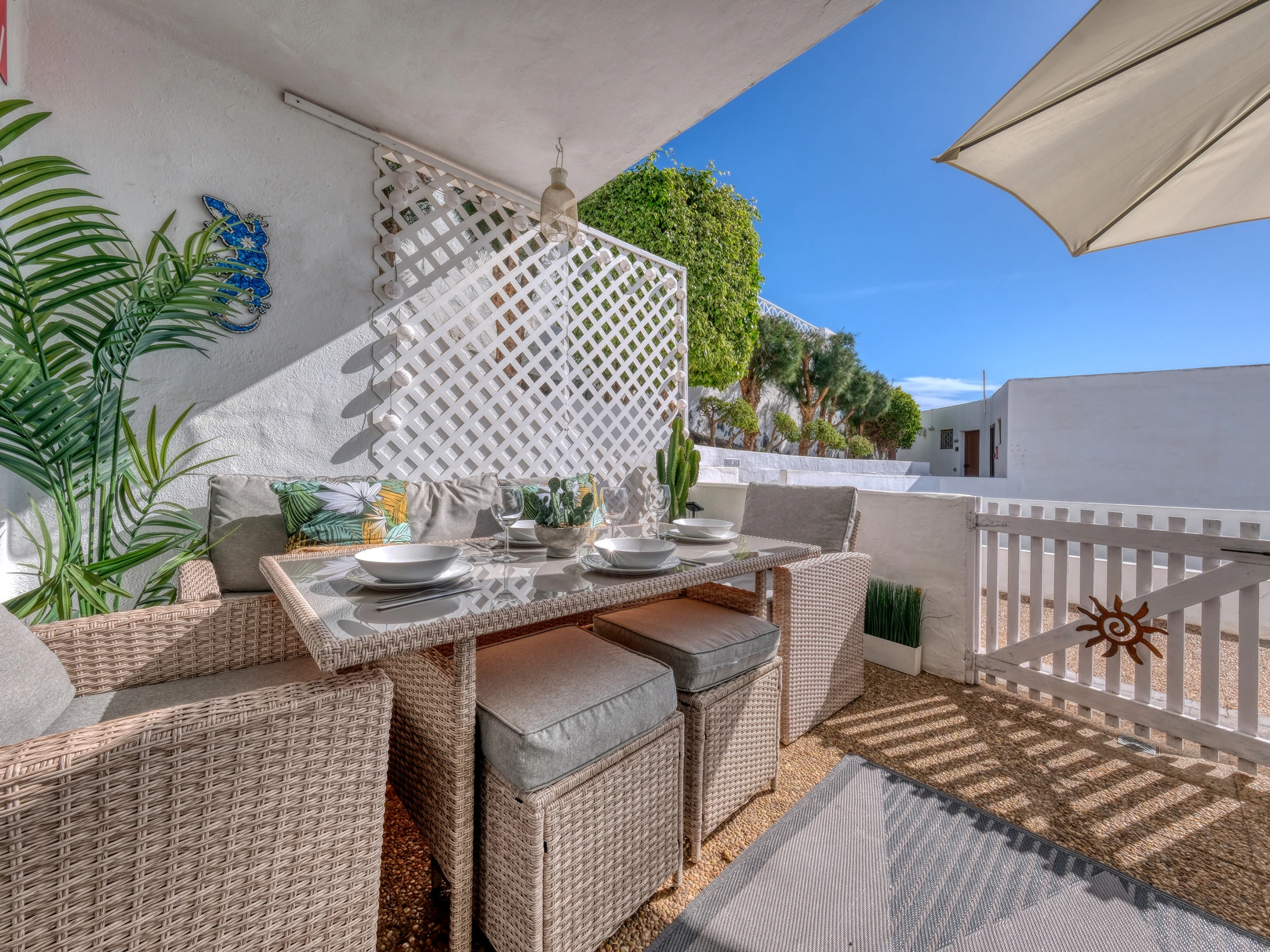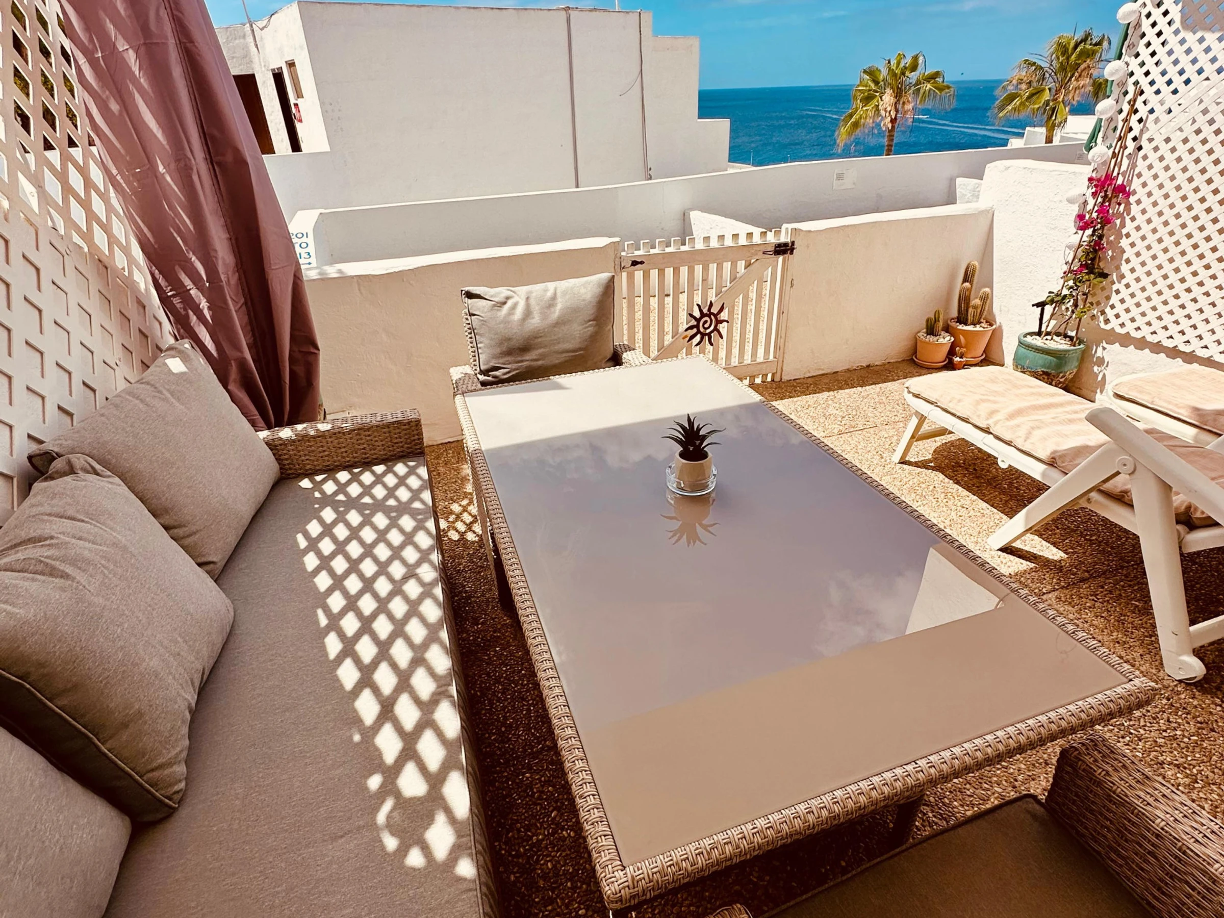Disfrute de la terraza privada con impresionantes vistas al mar y las piscinas. Cuenta con una mesa de comedor para comidas al aire libre, así como dos tumbonas, perfectas para tomar el sol canario o disfrutar de una bebida al atardecer.