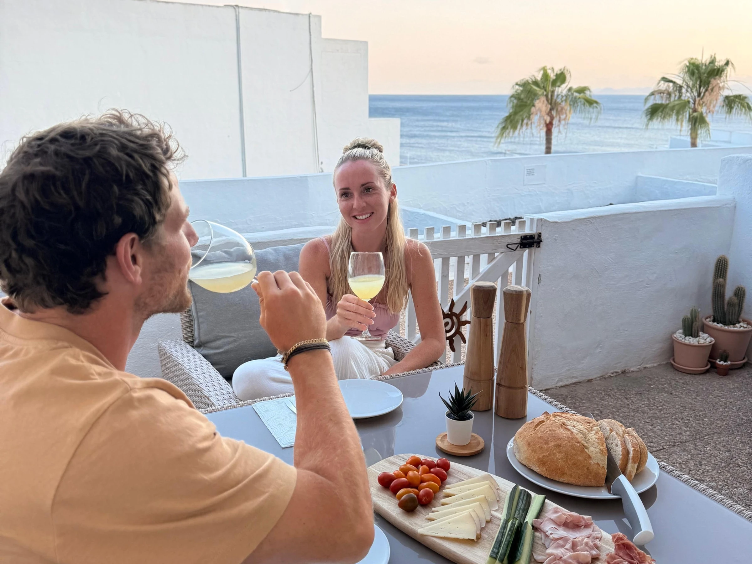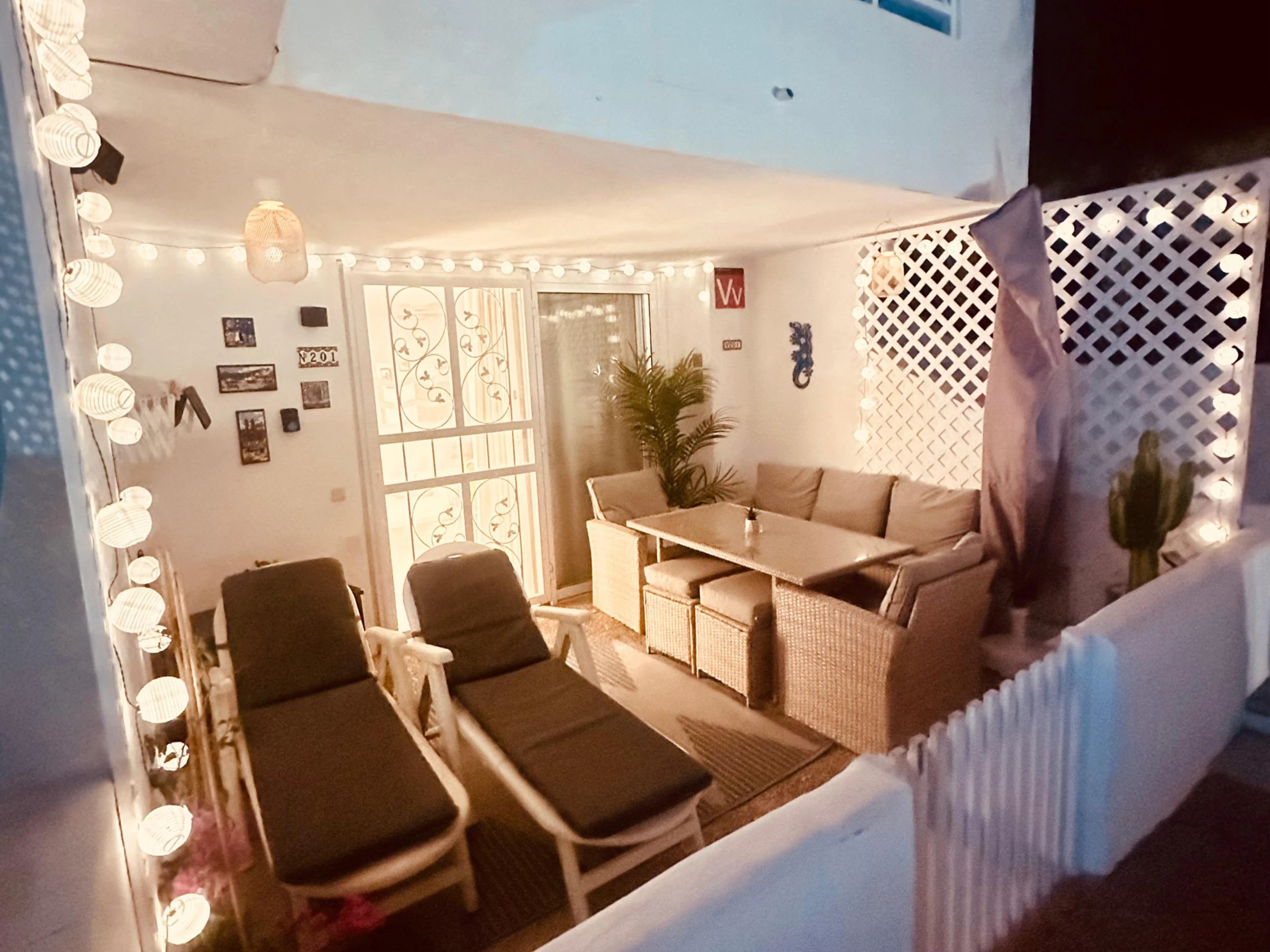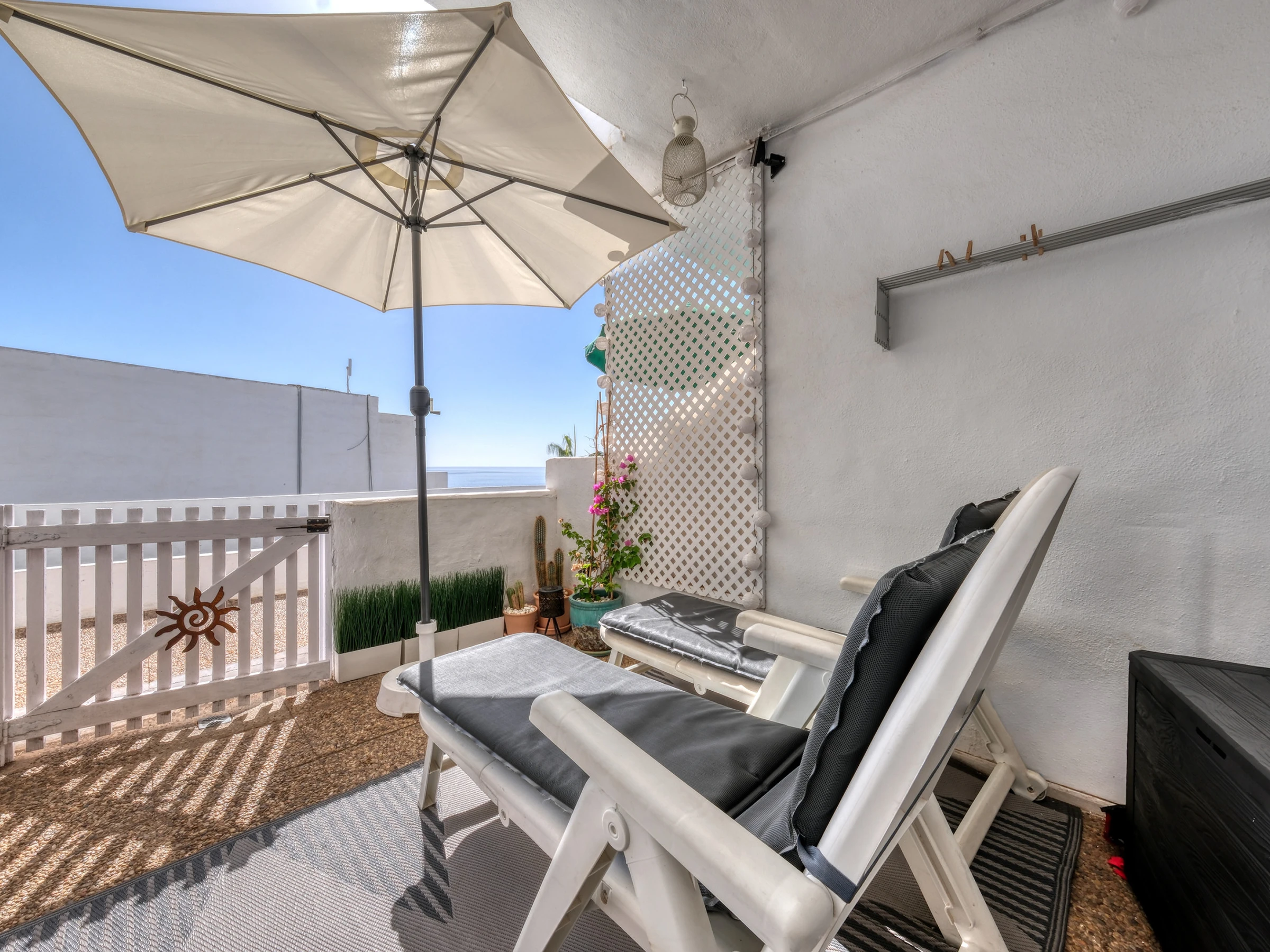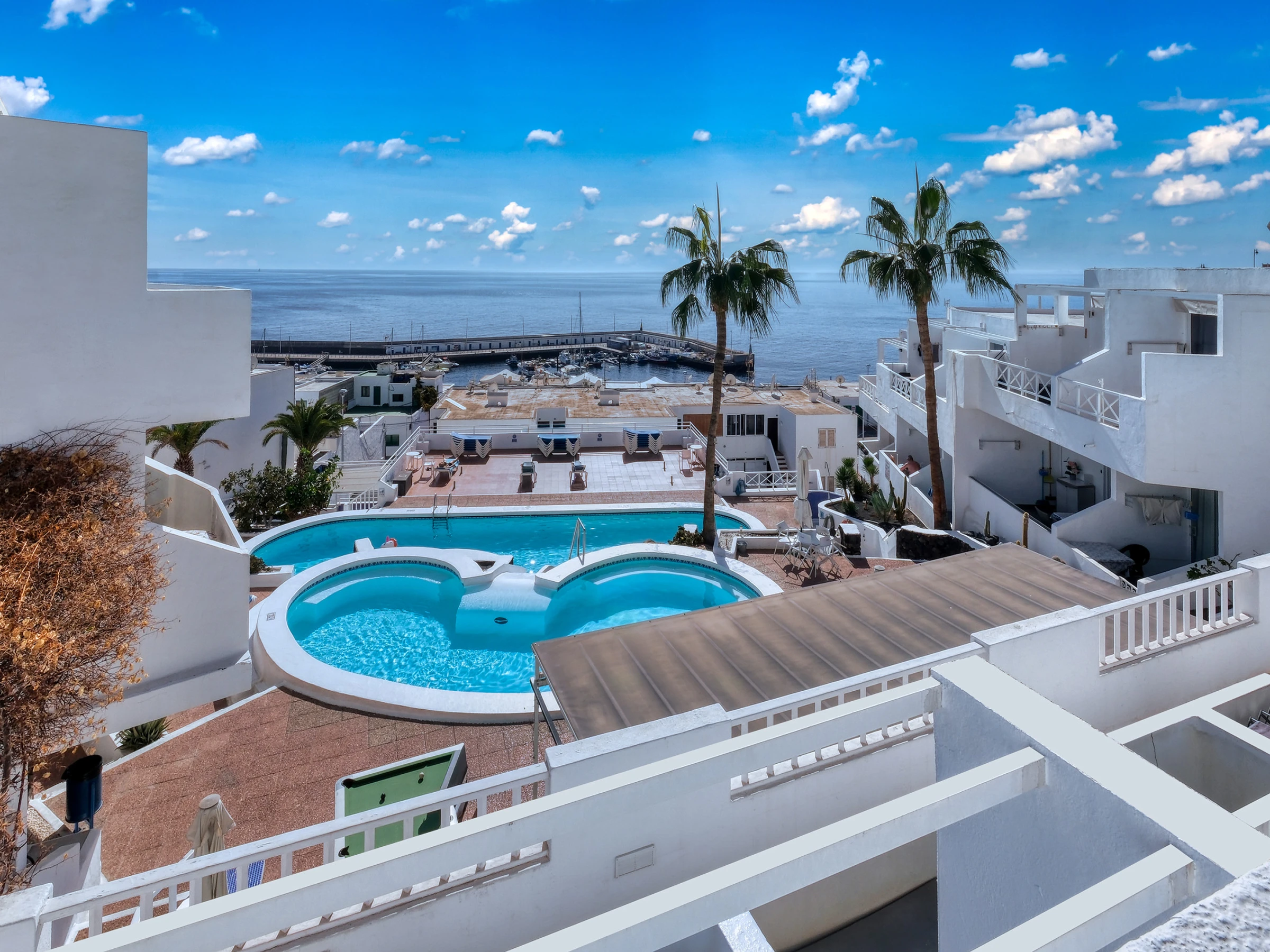 Disfrute de la terraza privada con impresionantes vistas al mar y las piscinas. Cuenta con una mesa de comedor para comidas al aire libre, así como dos tumbonas, perfectas para tomar el sol canario o disfrutar de una bebida al atardecer.