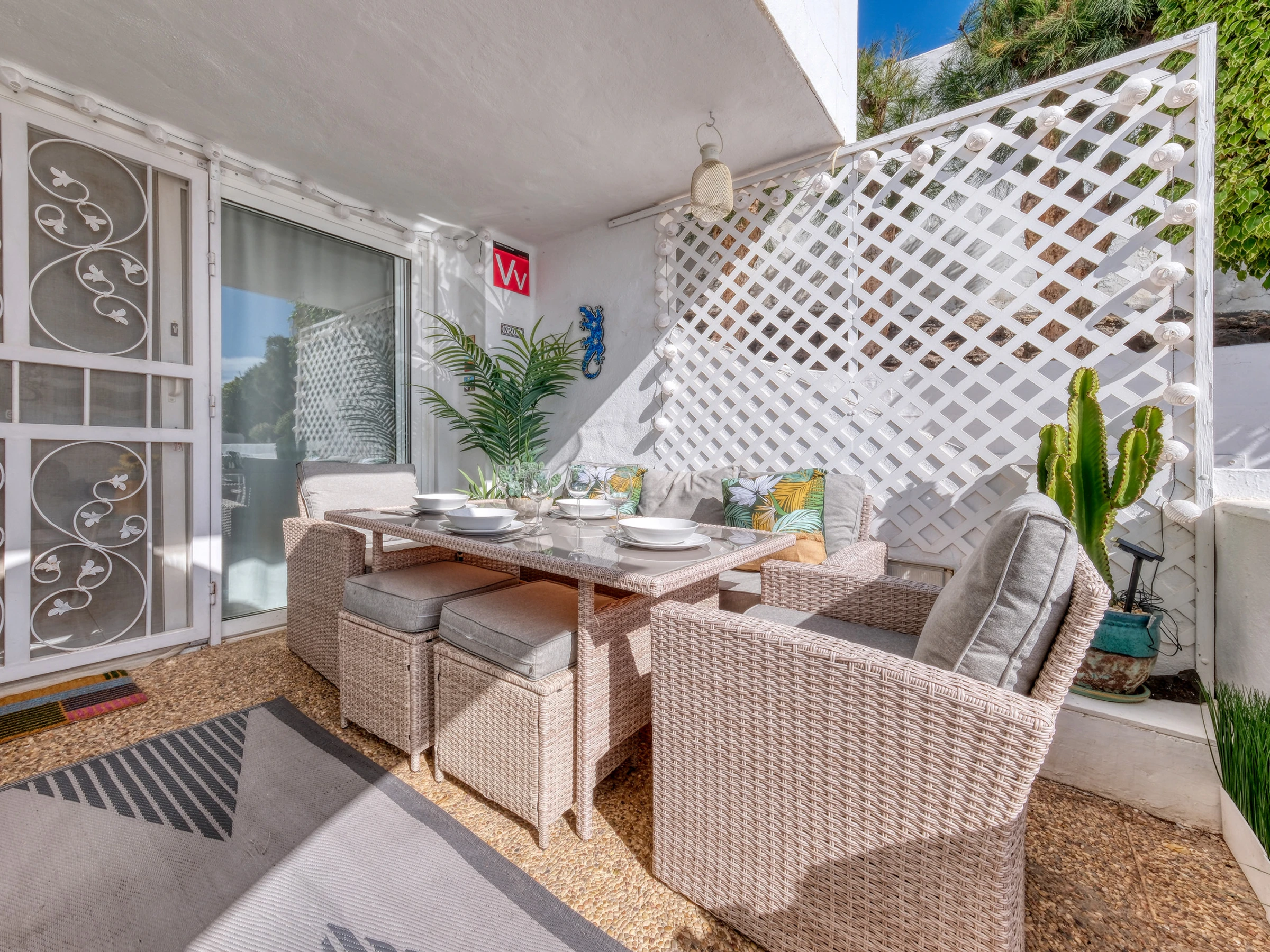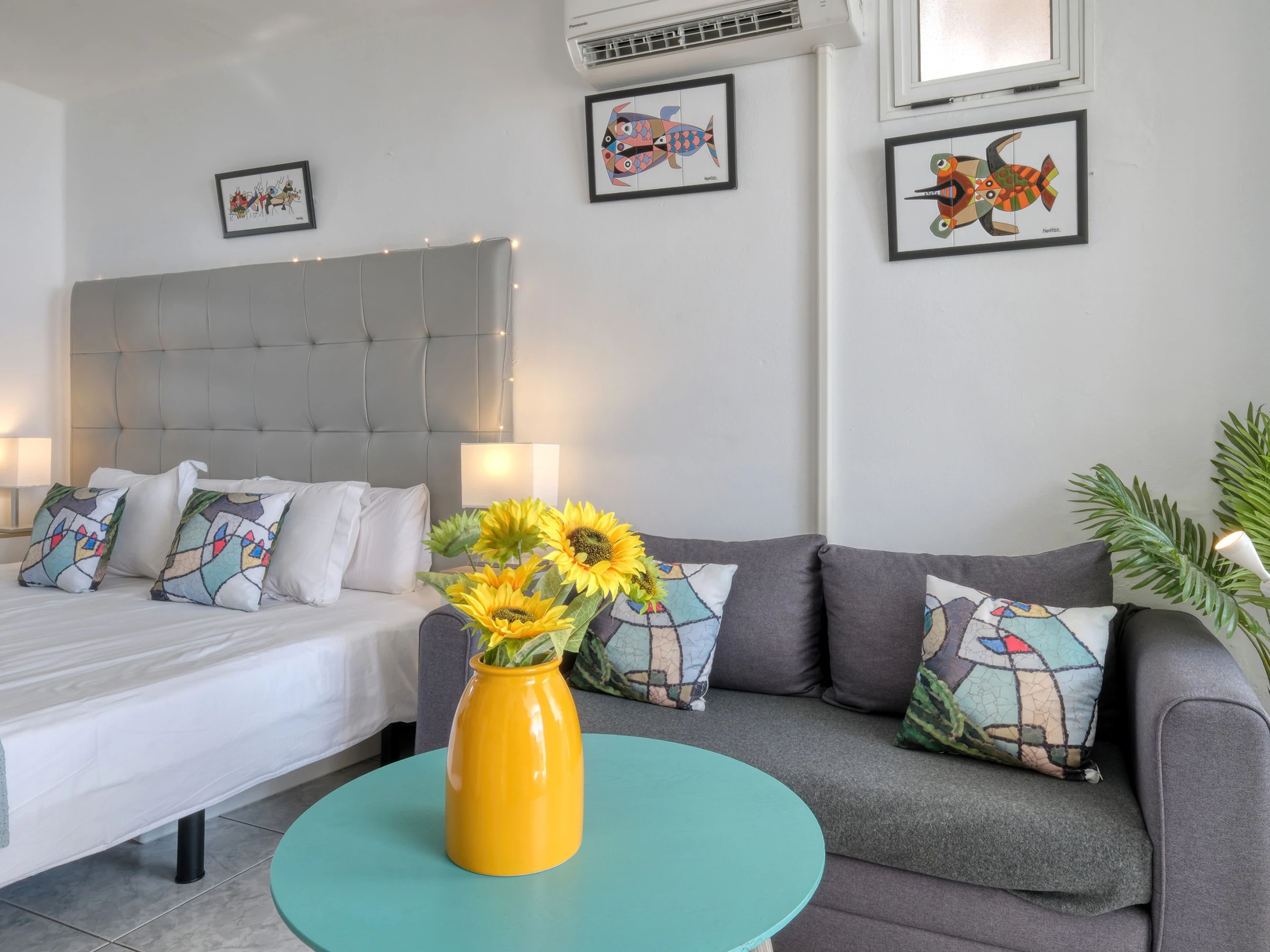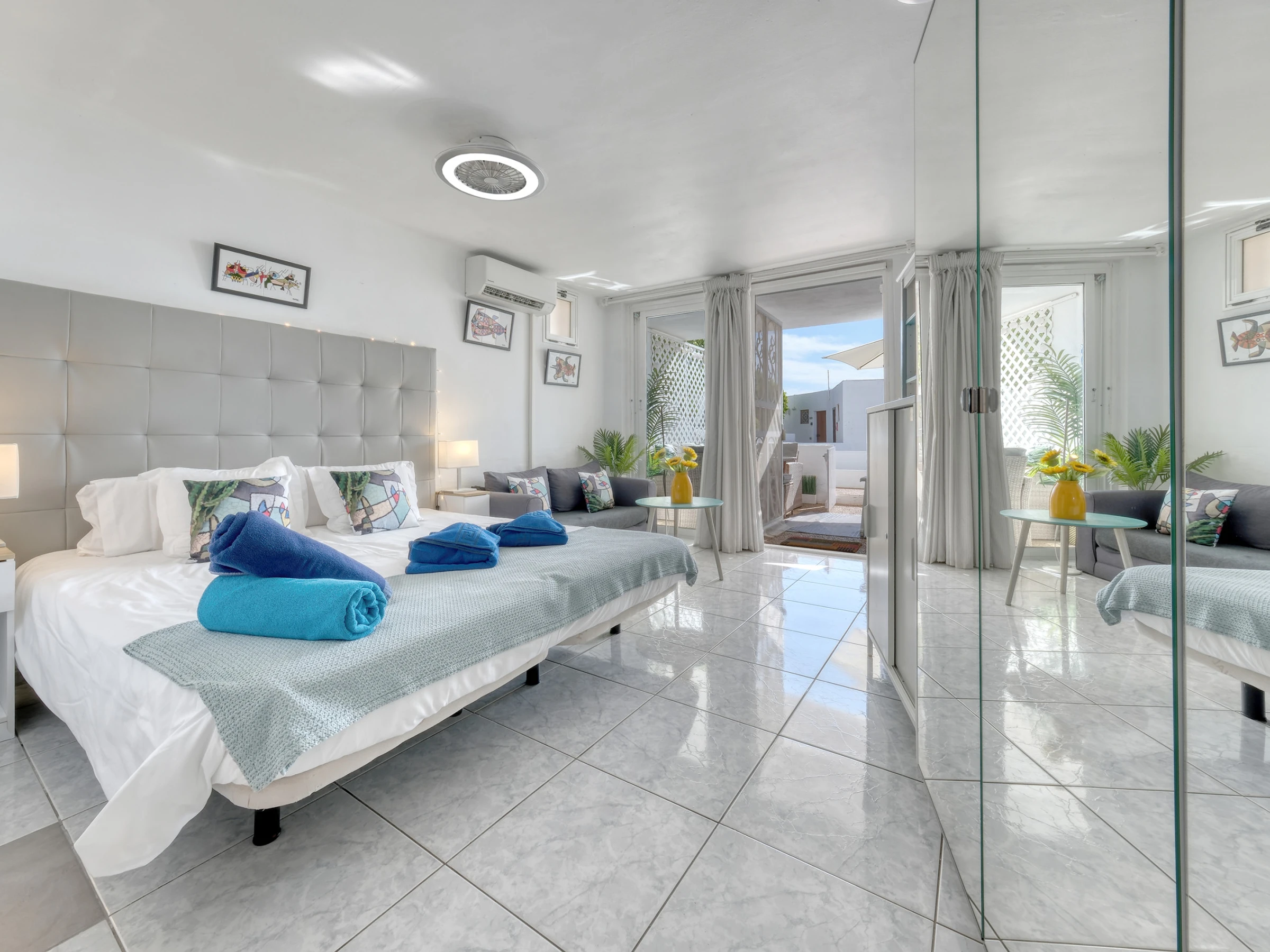 A solo un corto paseo, encontrarás el supermercado y los restaurantes locales, incluido el popular Varadero. La hermosa Playa Chica, con arenas blancas y aguas cristalinas, está a solo 10 minutos a pie, perfecta para un baño matutino o un día relajante junto al mar.