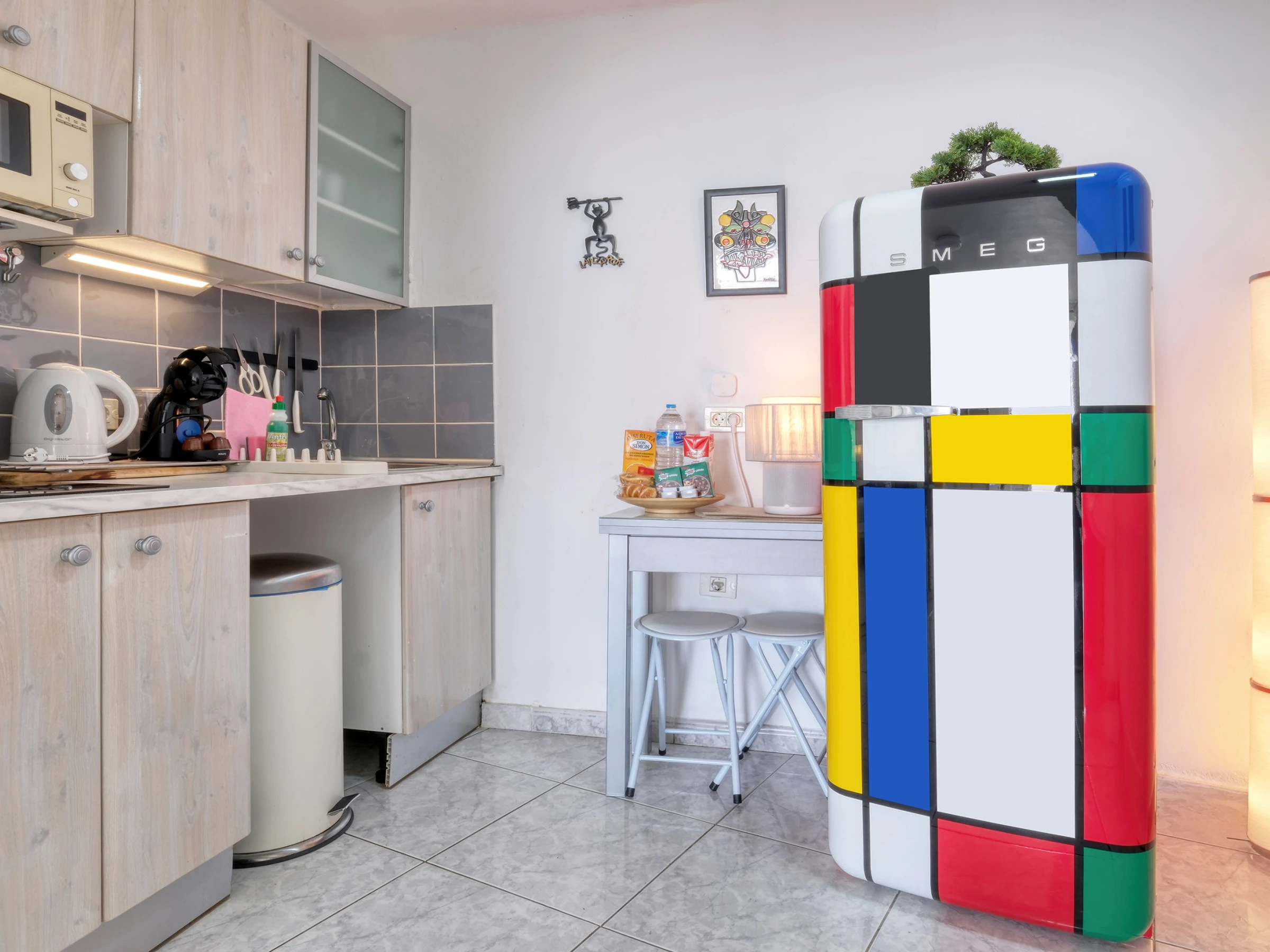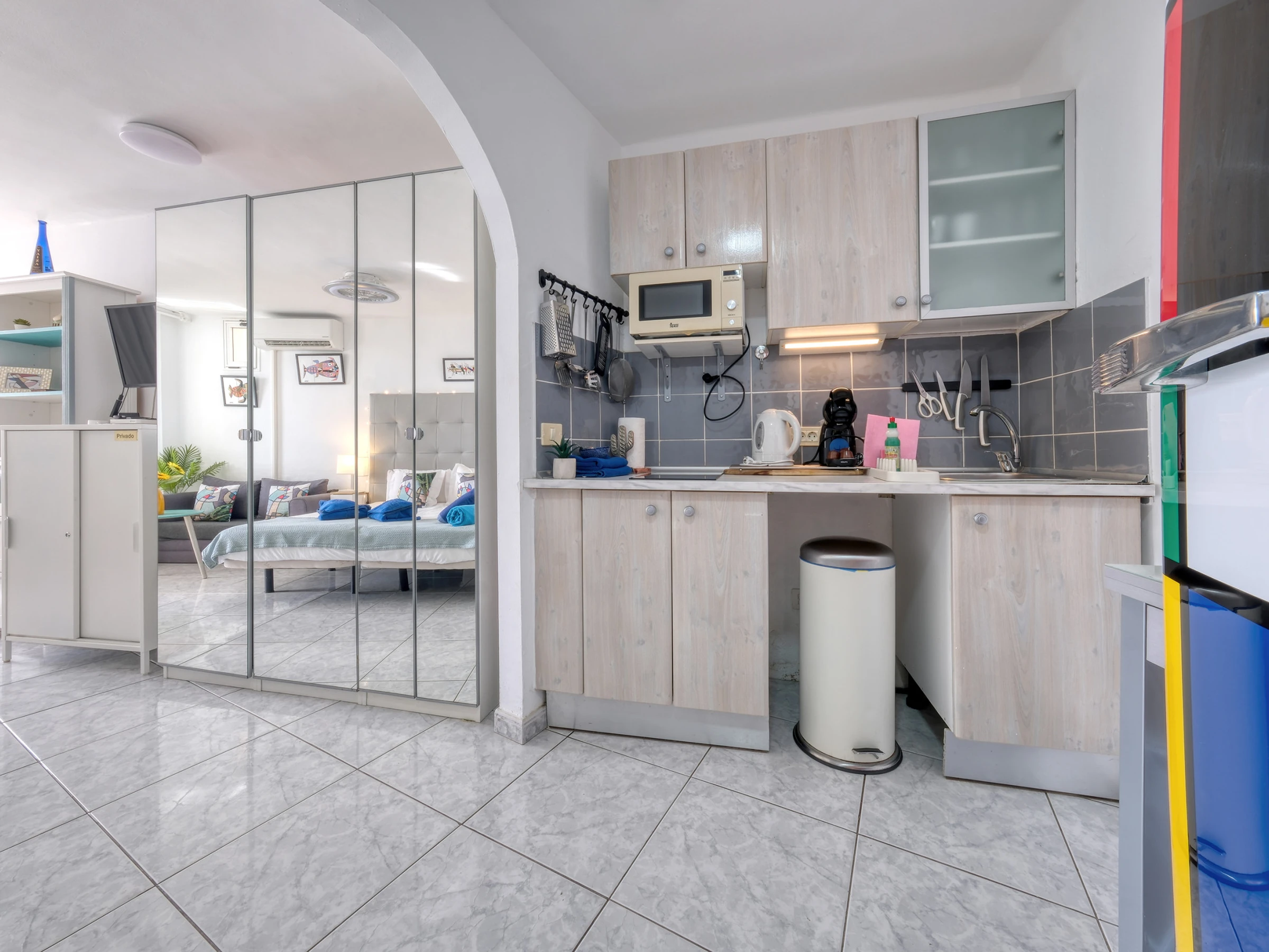 Diseñado para hasta 2 huéspedes, el estudio incluye un área de estar/dormitorio con 2 acogedoras camas individuales, una cocina totalmente equipada con placa de cerámica, microondas, cafetera, tostadora, hervidor, freidora de aire y utensilios de cocina completos, ideal para desayunos o cenas informales.