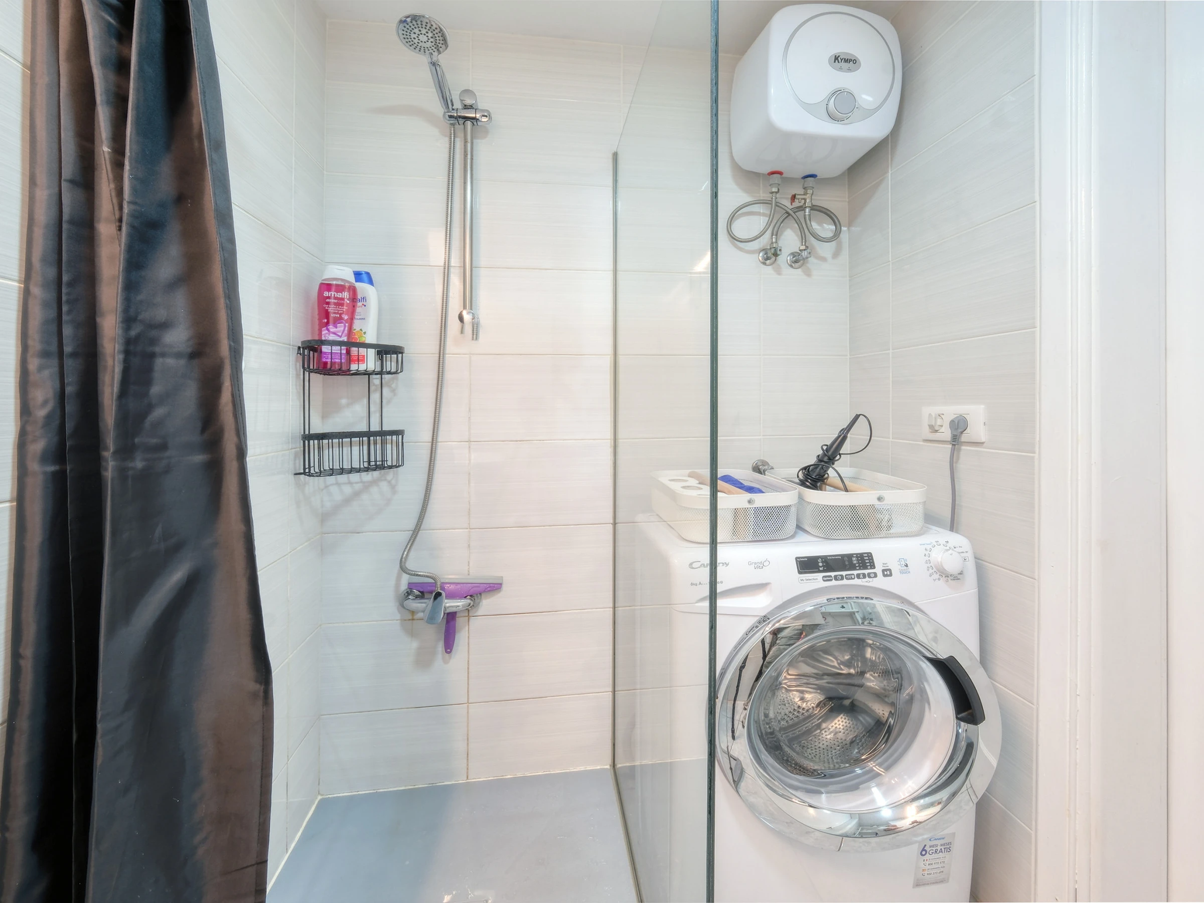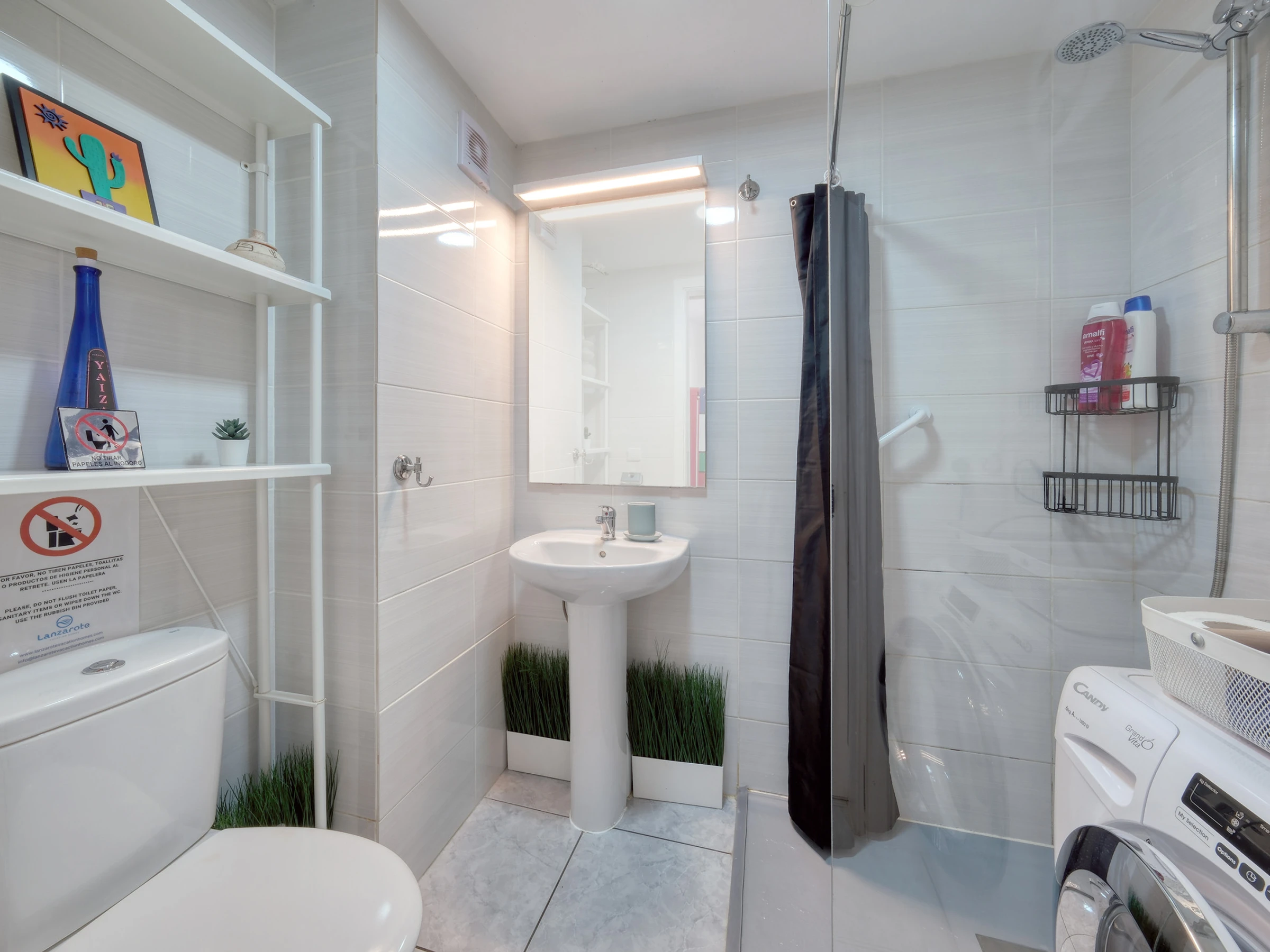 El baño viene con una ducha y lavadora para su comodidad y conveniencia.