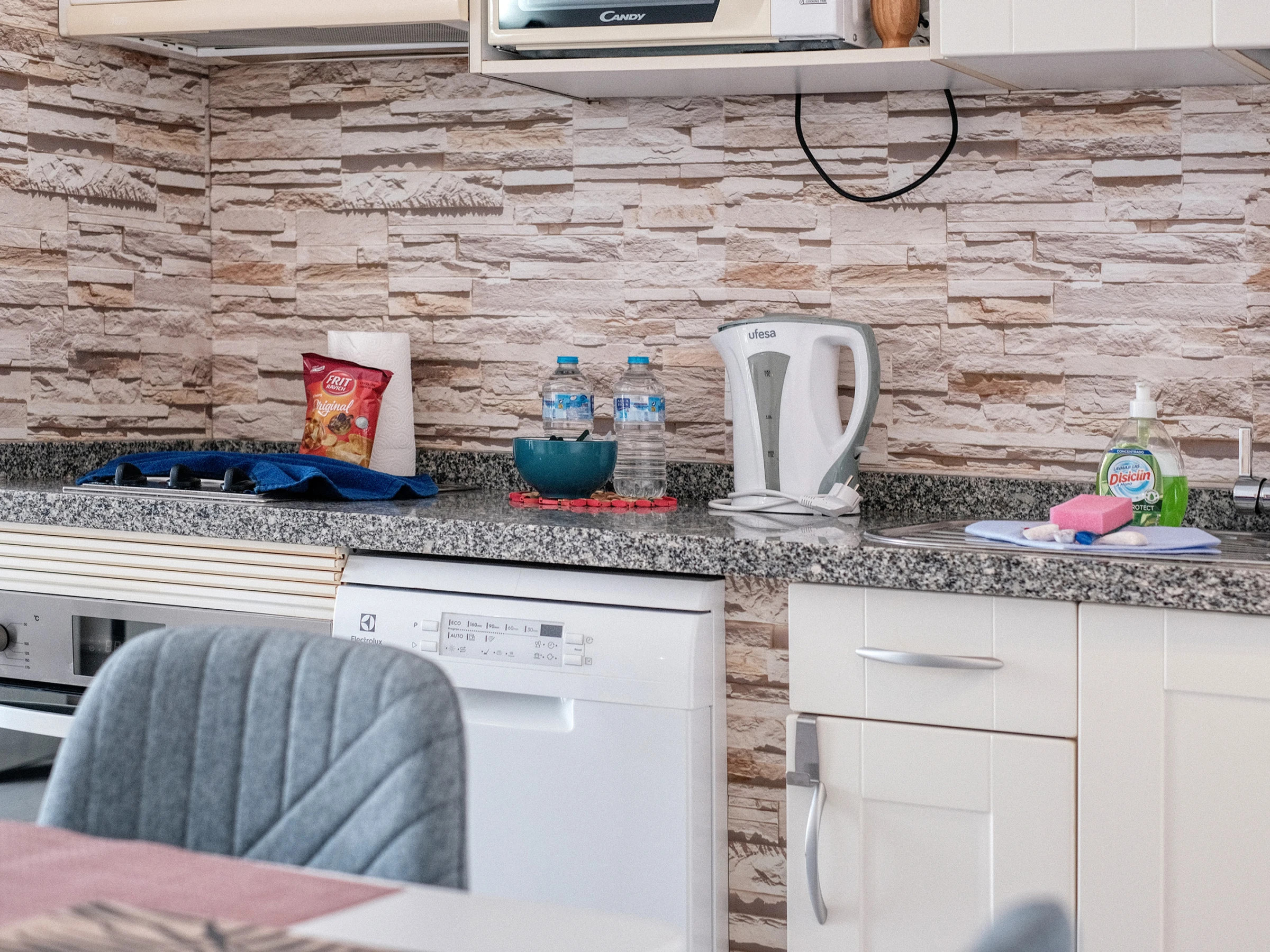 La cocina americana, abierta al salón, está totalmente equipada con todo lo necesario para preparar tus comidas durante la estancia: placa de vitrocerámica, nevera, microondas, horno, congelador, lavavajillas, cafetera, hervidor de agua, exprimidor y menaje completo. Su diseño funcional permite disfrutar del espacio en compañía.