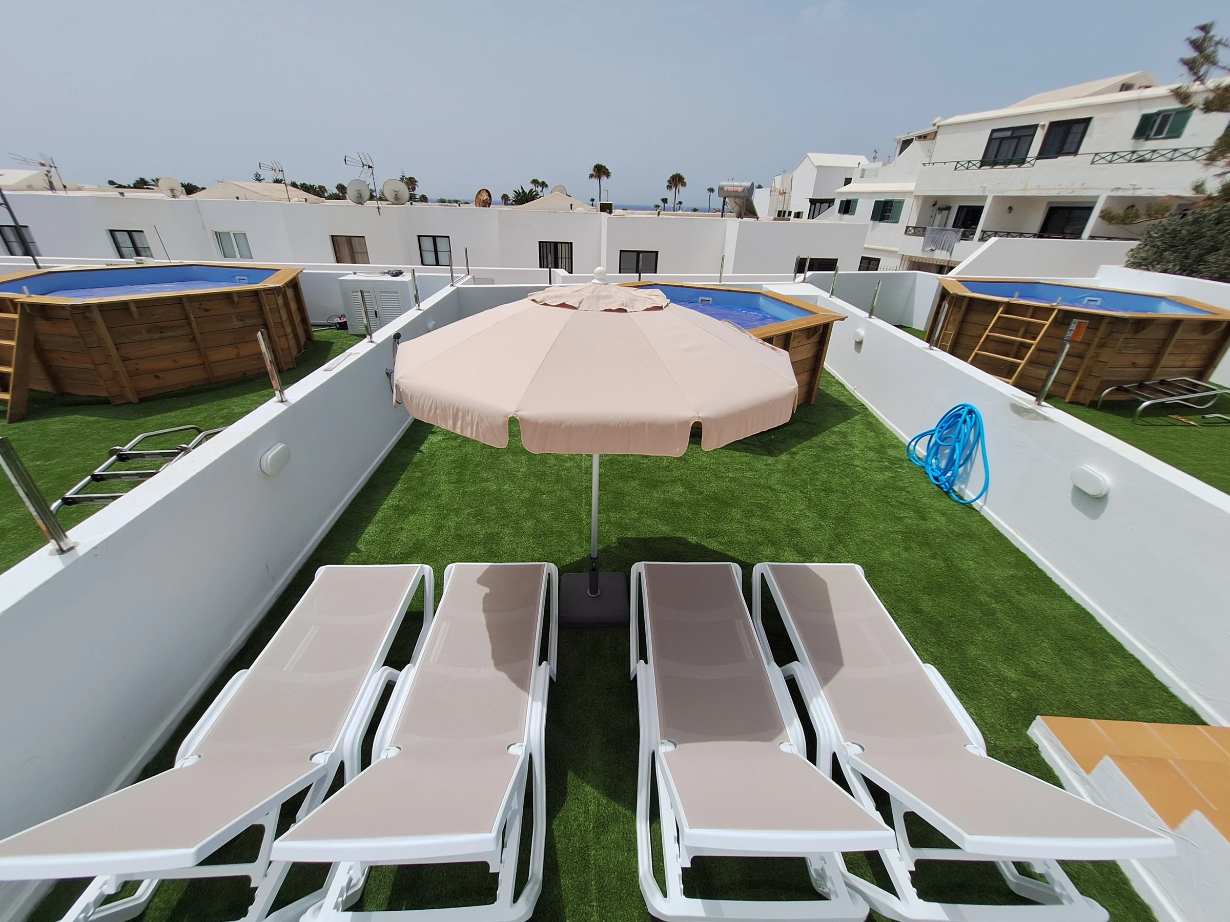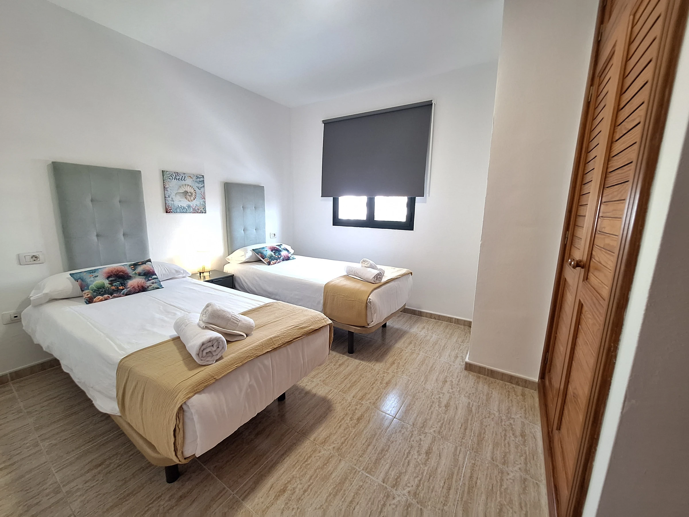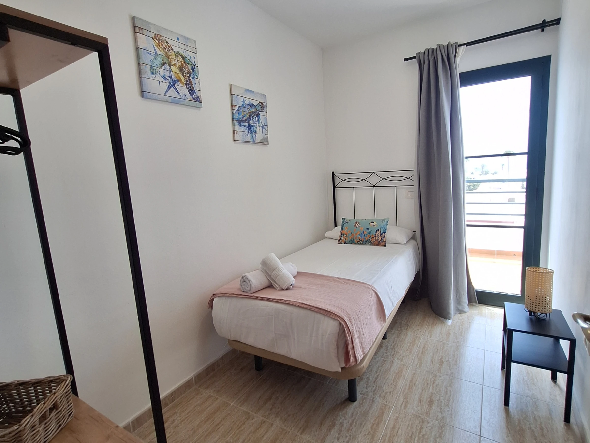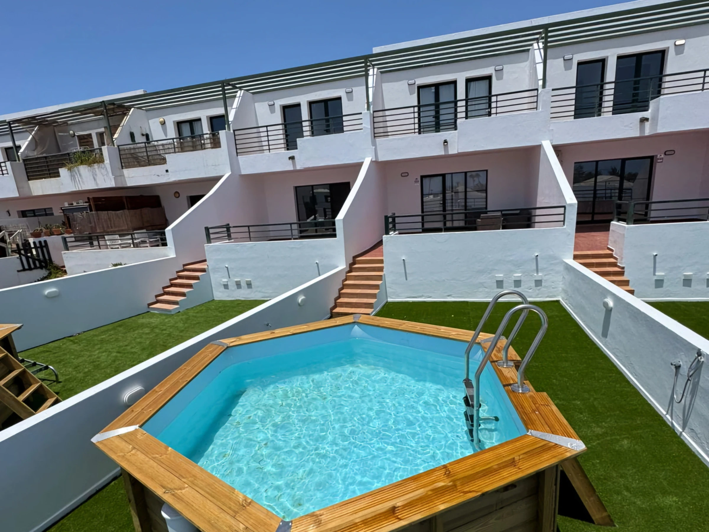 Nuestros modernos dúplex ofrecen un amplio espacio para disfrutar de tus vacaciones con total comodidad. En la planta baja, encontrará una cocina totalmente reformada, equipada con menaje y electrodomésticos propios de un hogar. El amplio salón-comedor, con acceso a una terraza amueblada, es el lugar perfecto para disfrutar de momentos de tranquilidad y compañía. Además, en este espacio exterior, podrás relajarte en una piscina privada de 3 x 3. La planta baja cuenta con un baño completo con ducha. En la planta alta, a la que se accede por escaleras internas, se encuentran tres dormitorios. Disponen de una cama de matrimonio con ropero empotrado. El segundo dormitorio cuenta con dos camas individuales de 90 cm y ropero empotrado, y el tercero tiene una cama individual de 90 cm. Además, en esta planta se encuentra un baño completo con ducha y un balcón con vistas al mar. Este dúplex tiene capacidad para hasta 5 personas más un bebé (cuna disponible bajo previa petición). No dispone de camas supletorias ni sofá cama. Entre otros servicios, el alojamiento ofrece Wi-Fi gratuito en las instalaciones, y fácil aparcamiento (no privado). Los dúplex no dispone de aire acondicionado, ventiladores ni calefactores. Ideal para familias, grupos de amigos y trabajadores en remoto.