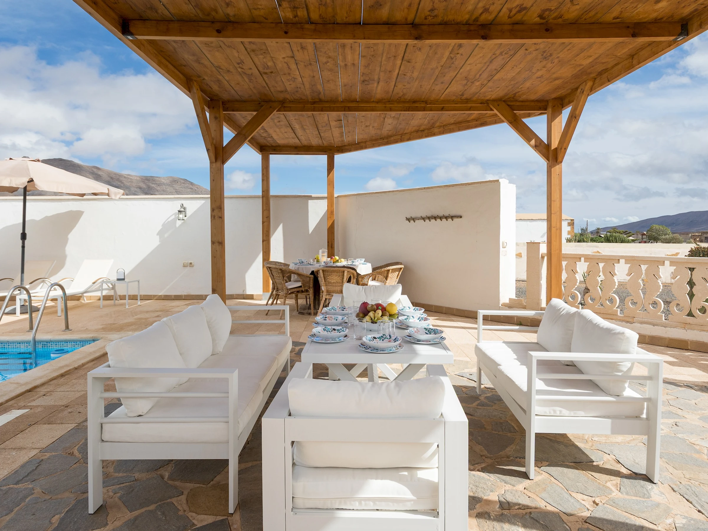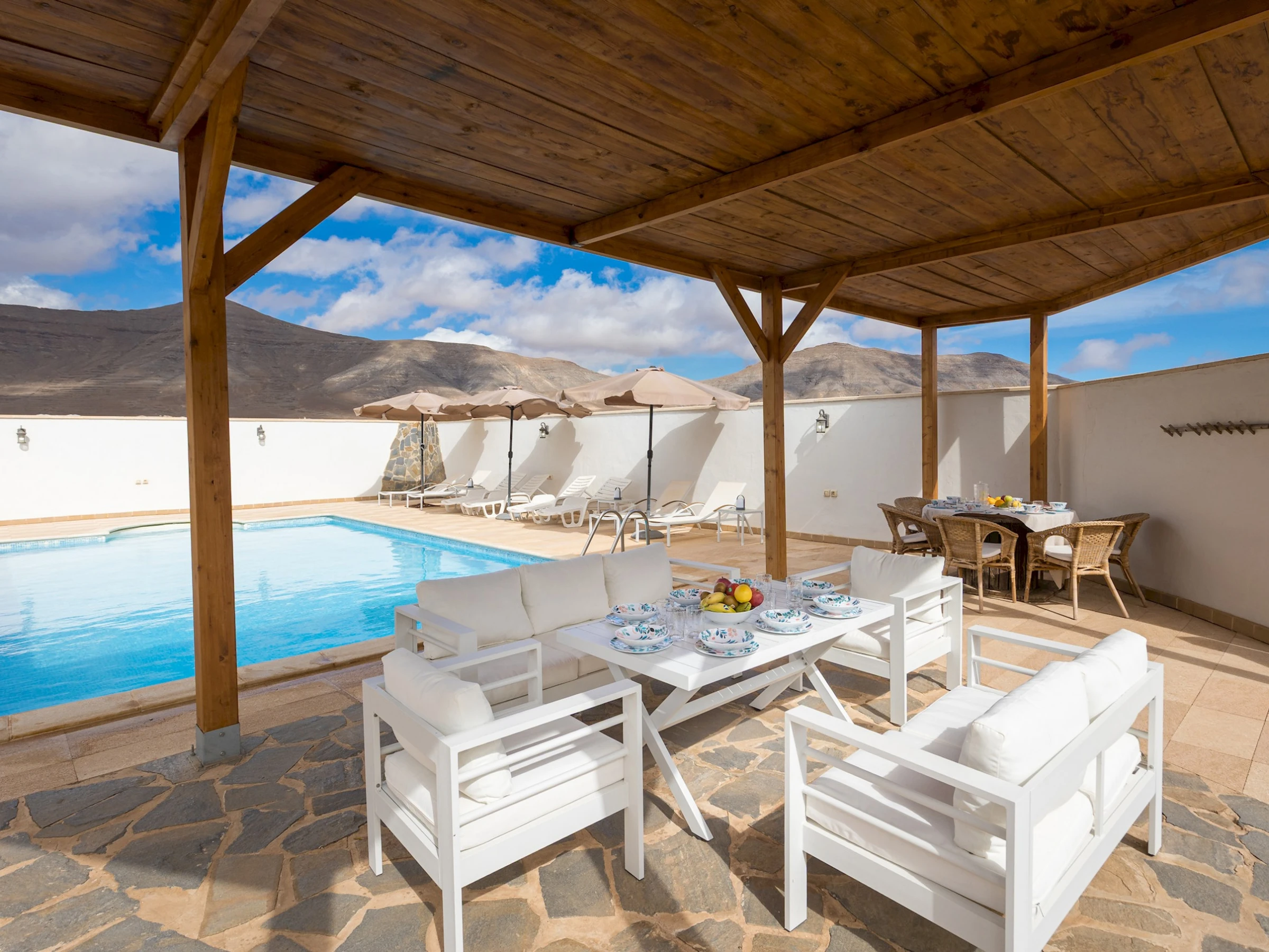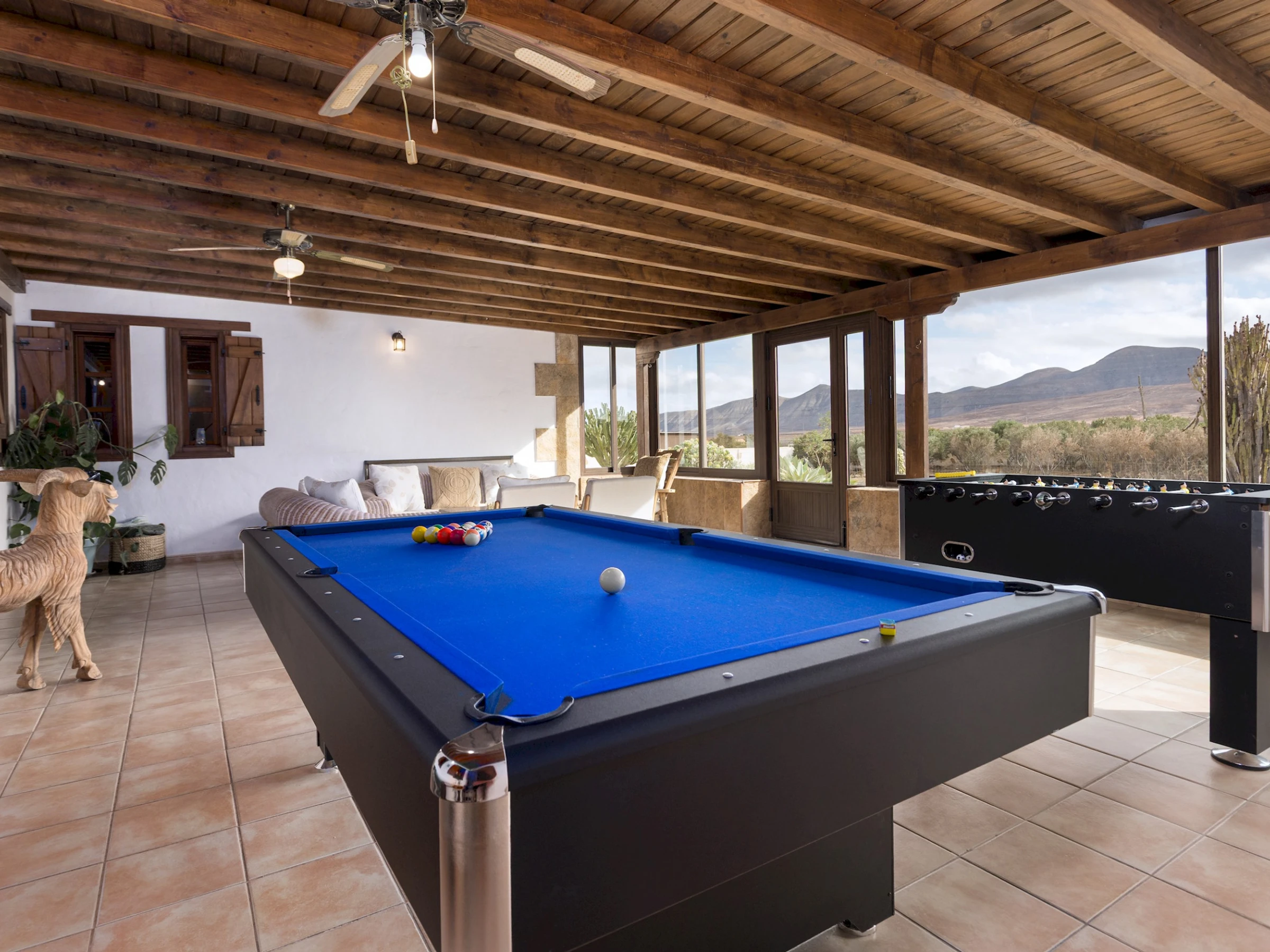 La vivienda incluye además una gran sala de juegos cerrada con vistas al paisaje volcánico, equipada con billar, futbolín y dardos, perfecta para compartir momentos en familia. En el exterior, la piscina privada con tumbonas, sombrillas y zona de barbacoa invita a disfrutar del sol en total tranquilidad. El espacio se completa con un comedor al aire libre bajo pérgola y aparcamiento privado cubierto.