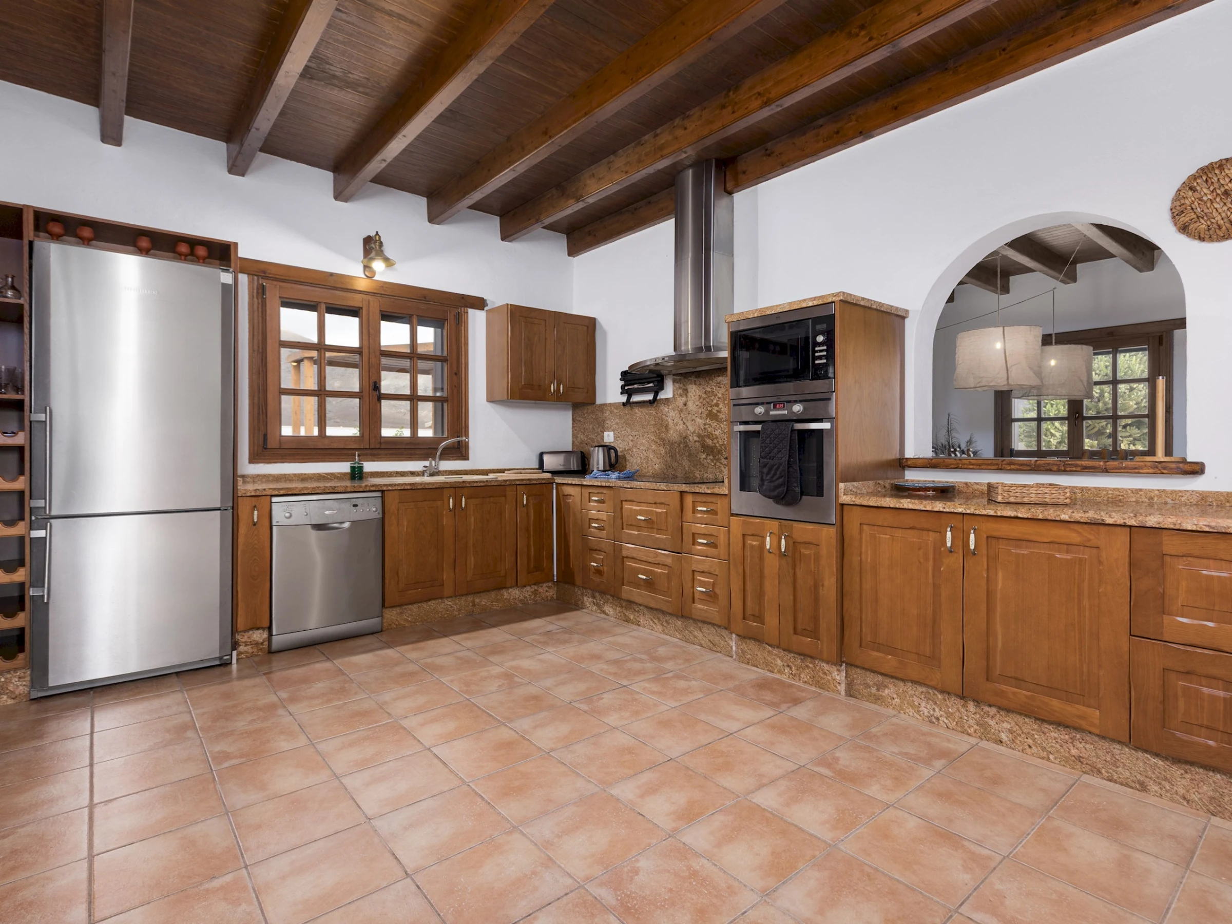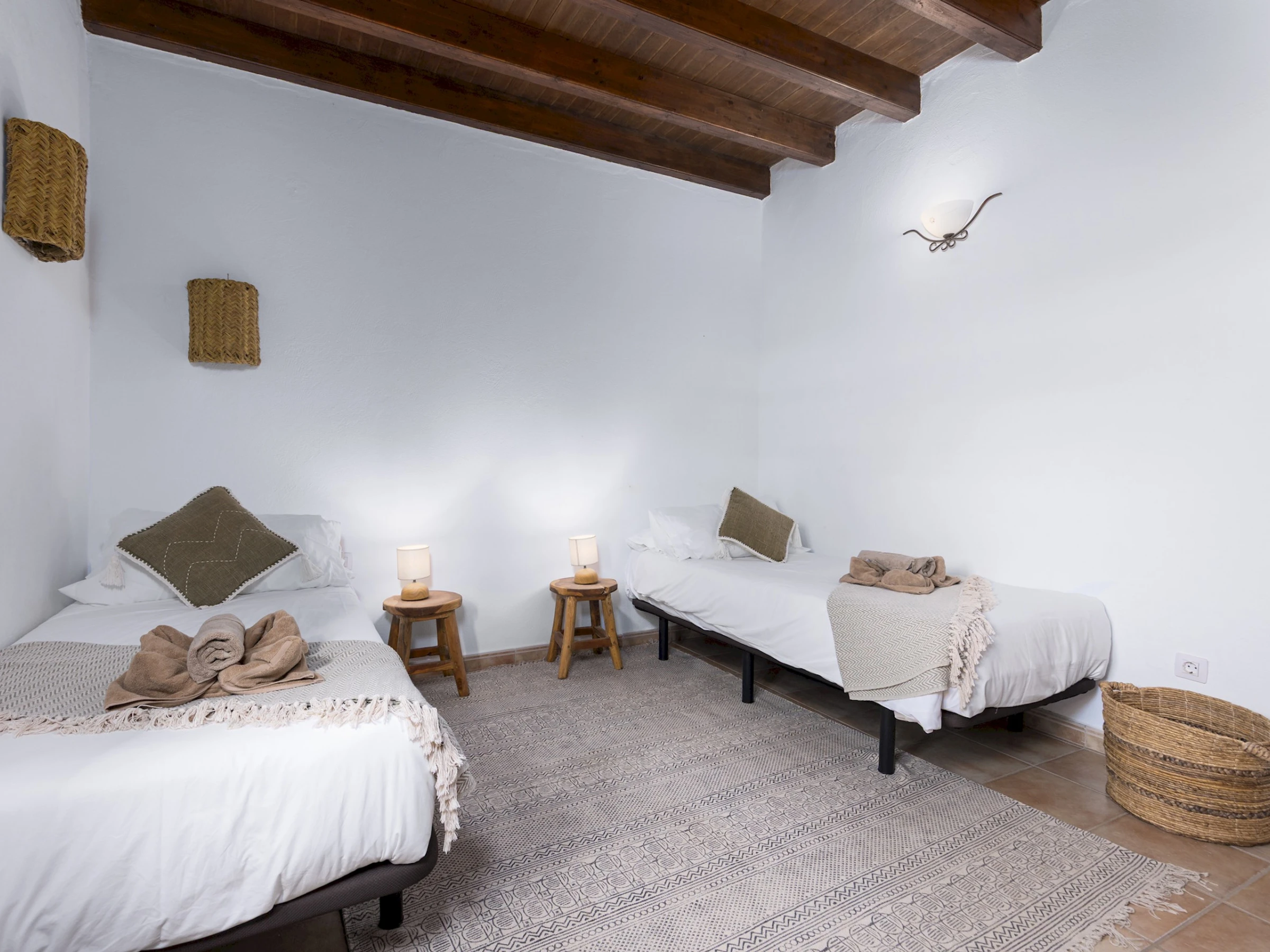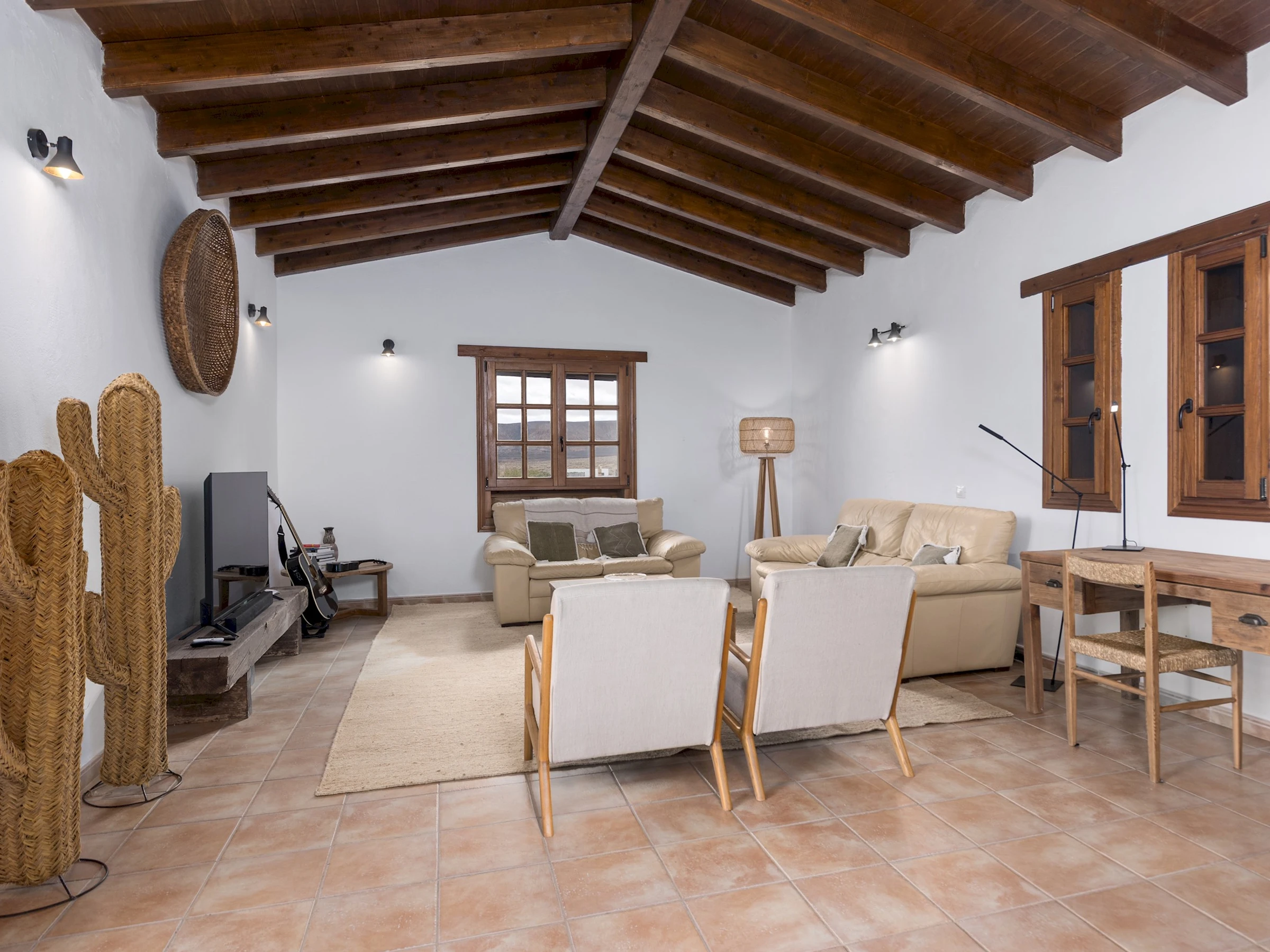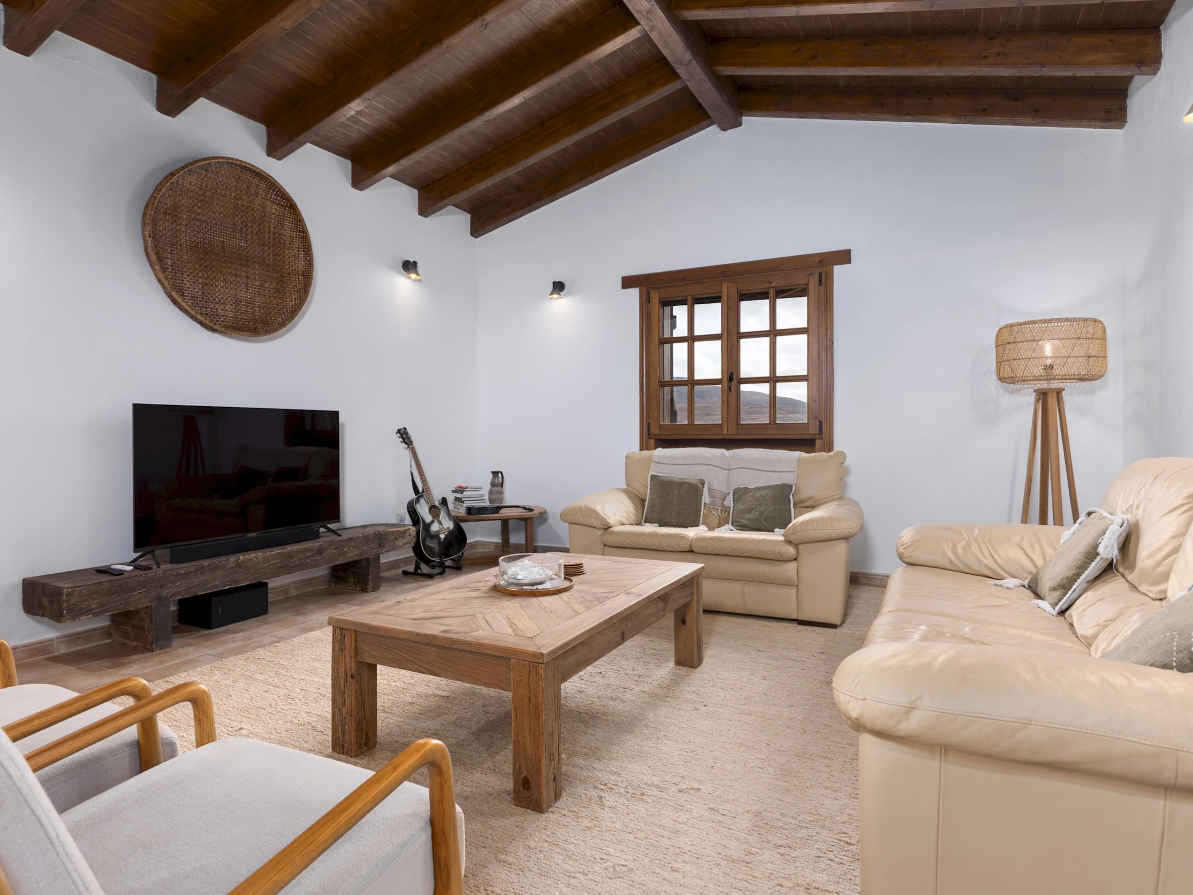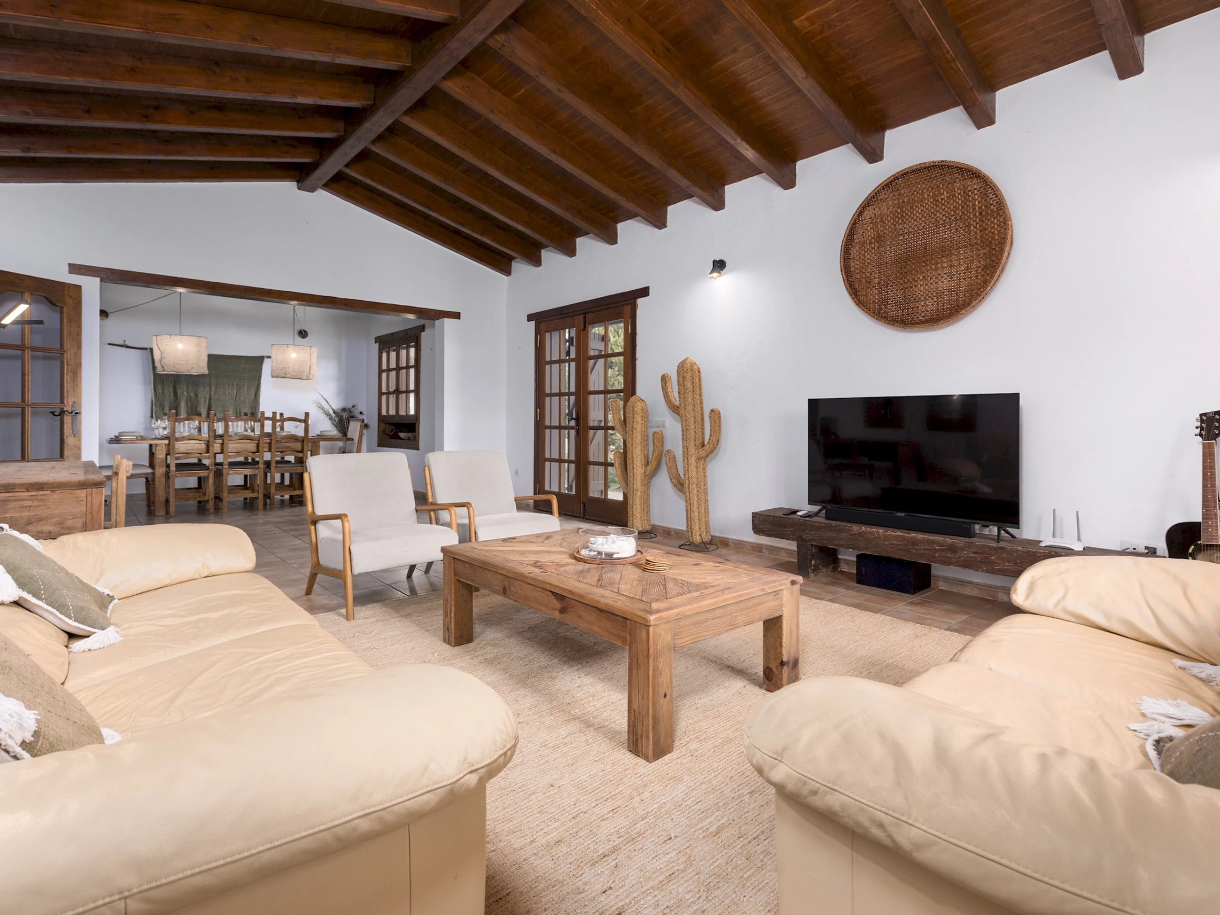 Distribuida en una sola planta, la casa ofrece un ambiente acogedor y funcional, con estancias luminosas y detalles en madera que realzan su carácter tradicional. Cuenta con cuatro dormitorios: el principal con cama King size y baño en suite, un segundo con cama Queen size y dos dormitorios adicionales con dos camas individuales cada uno. Dispone de tres baños completos con ducha, una zona de estudio o trabajo en el salón de estilo rústico con techos de madera, cómodos sofás y Smart TV, ideal para relajarse tras un día de playa o excursión.