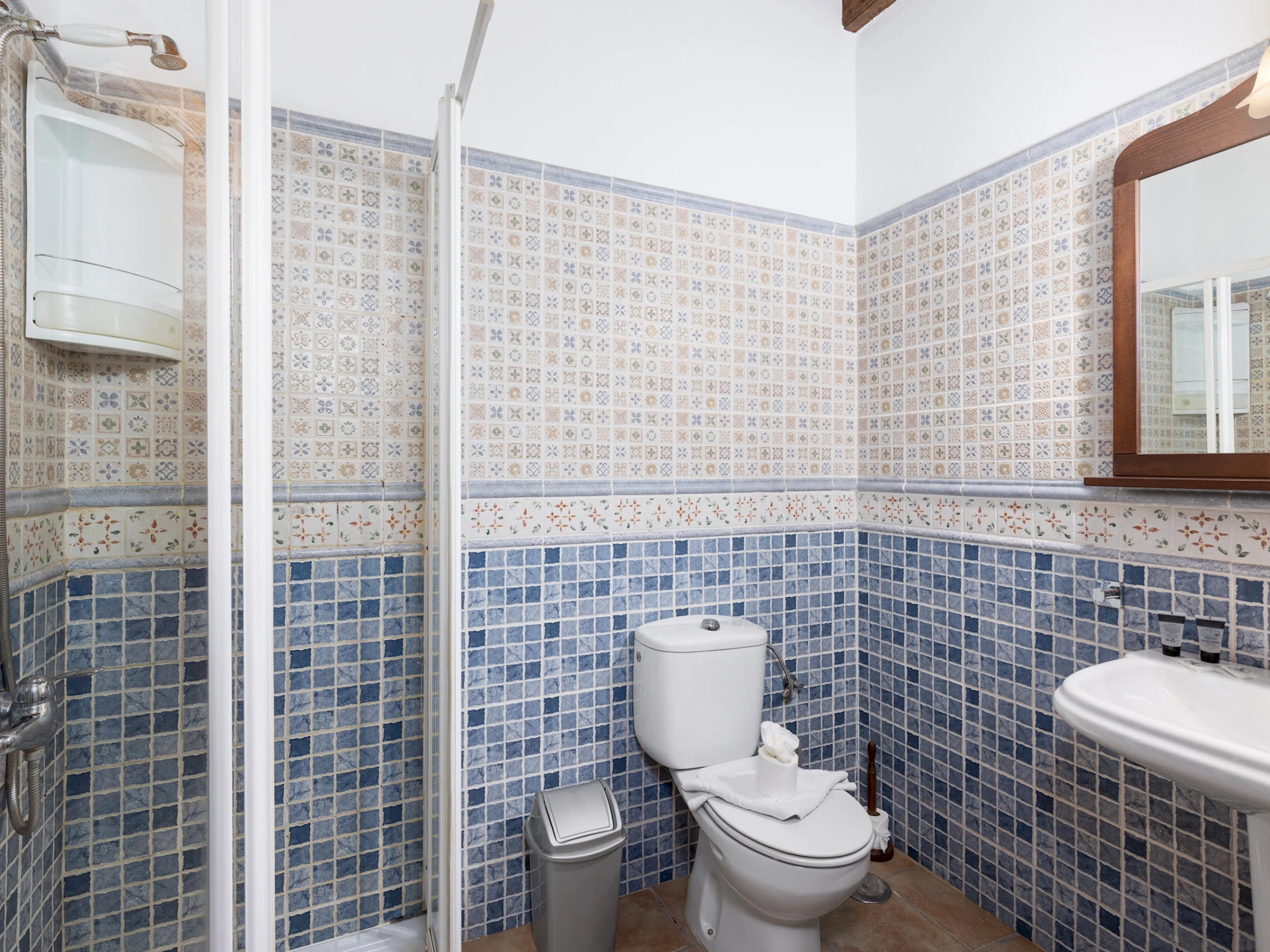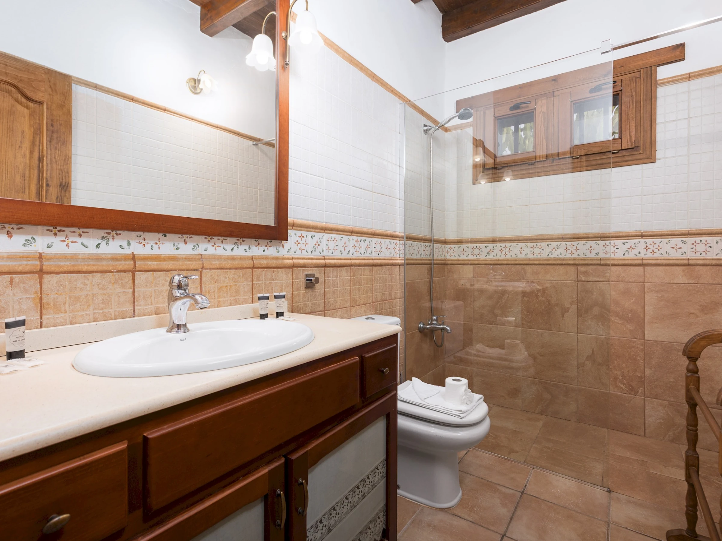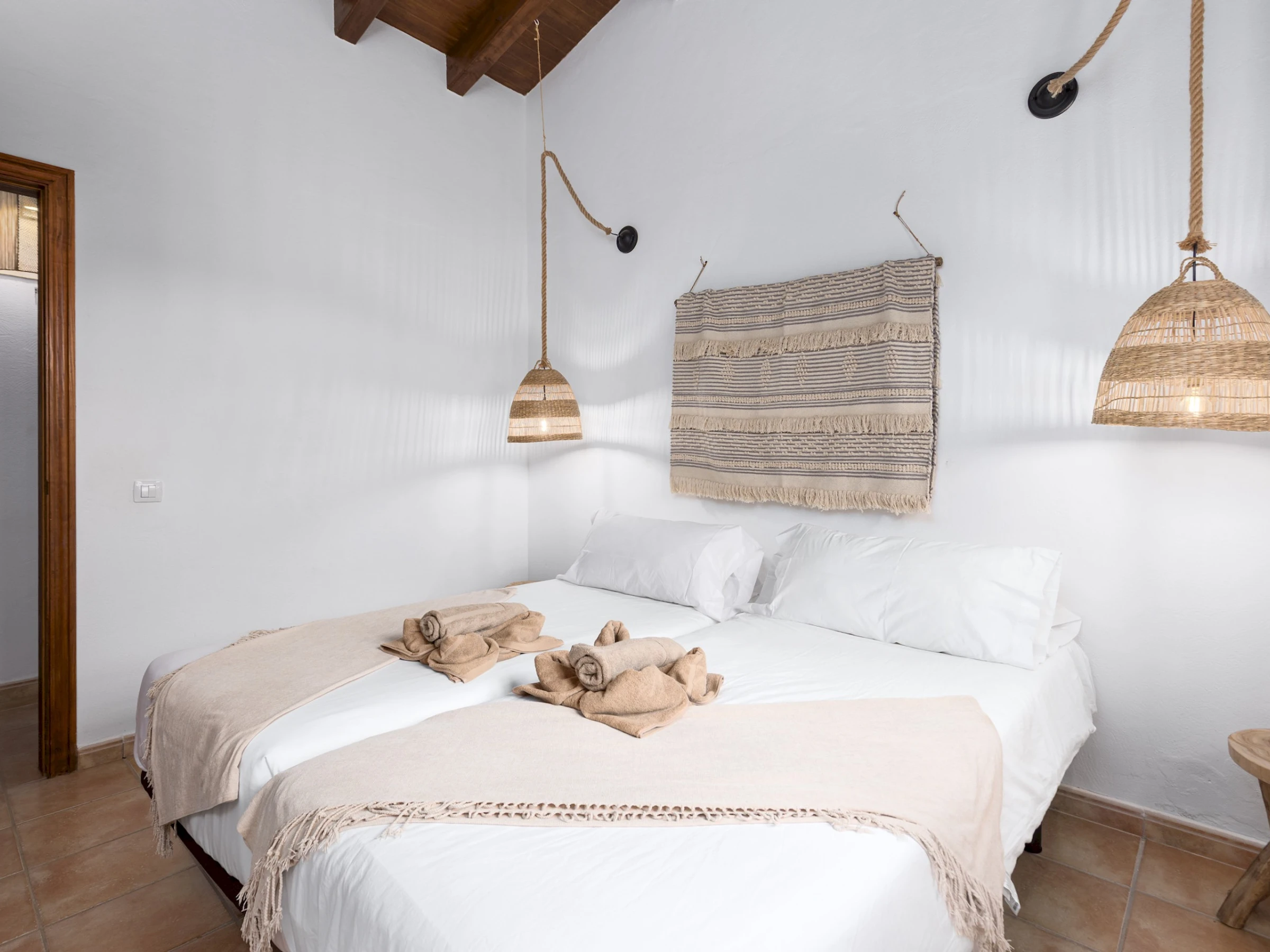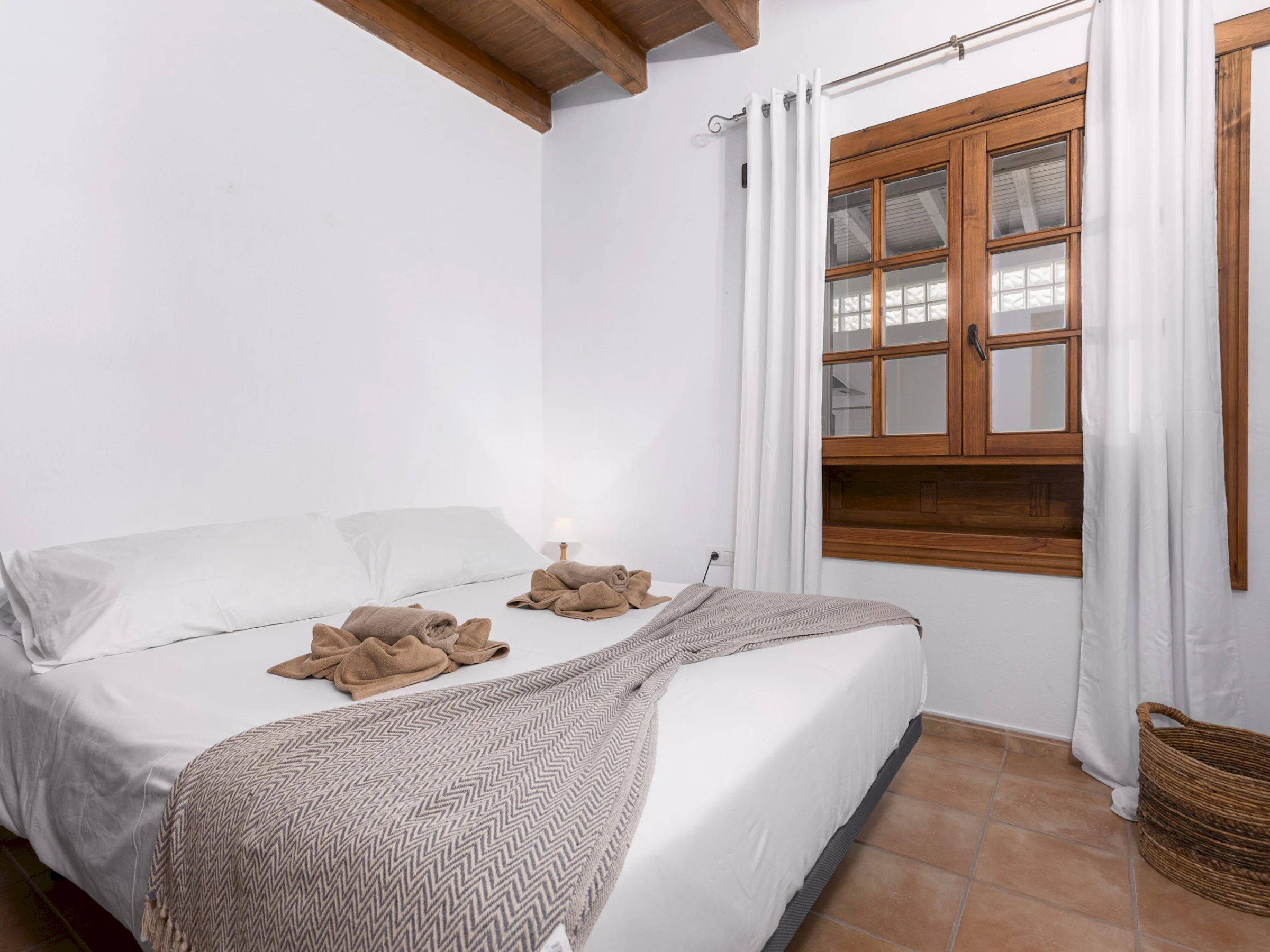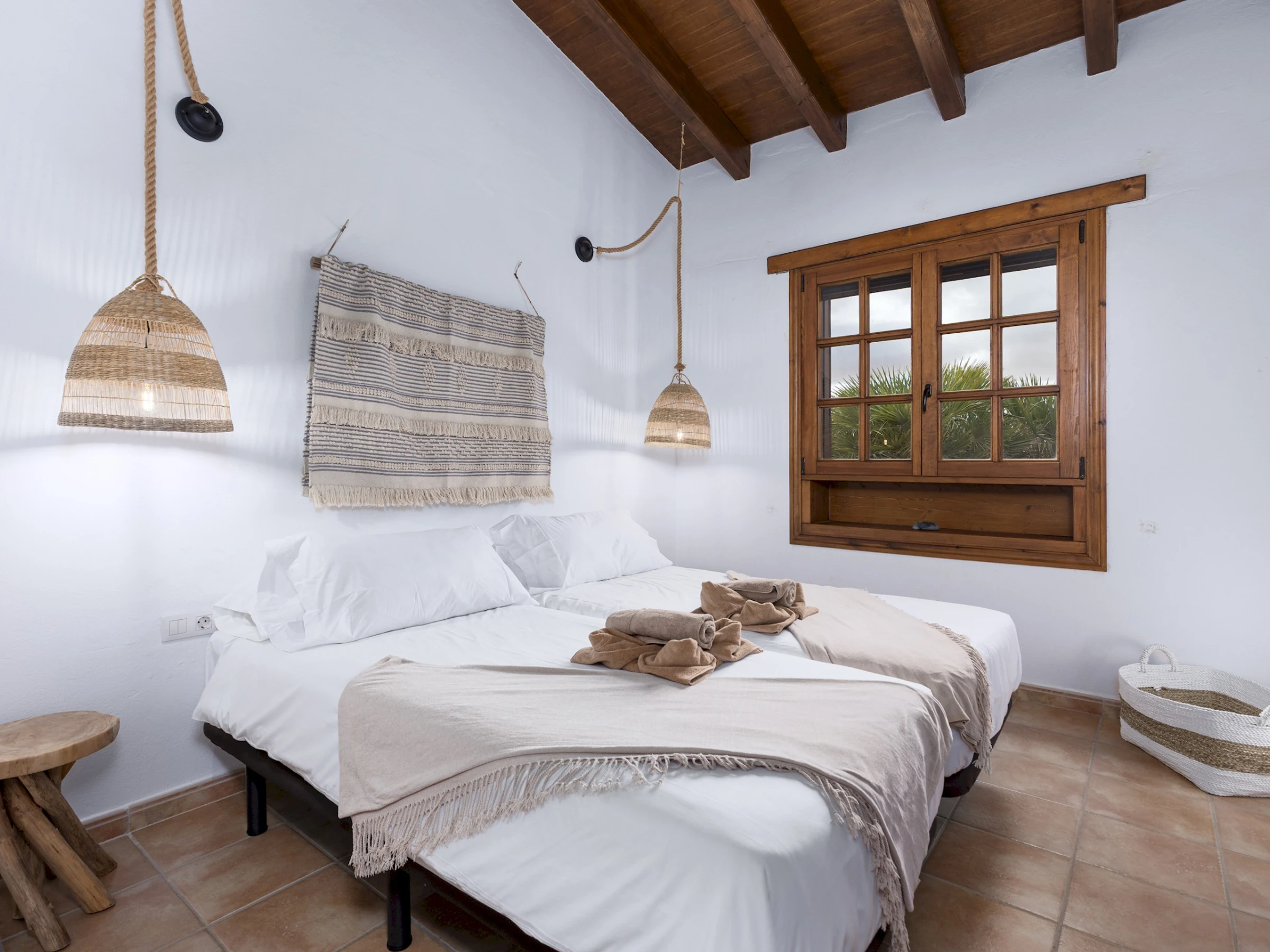 Distribuida en una sola planta, la casa ofrece un ambiente acogedor y funcional, con estancias luminosas y detalles en madera que realzan su carácter tradicional. Cuenta con cuatro dormitorios: el principal con cama King size y baño en suite, un segundo con cama Queen size y dos dormitorios adicionales con dos camas individuales cada uno. Dispone de tres baños completos con ducha, una zona de estudio o trabajo en el salón de estilo rústico con techos de madera, cómodos sofás y Smart TV, ideal para relajarse tras un día de playa o excursión.