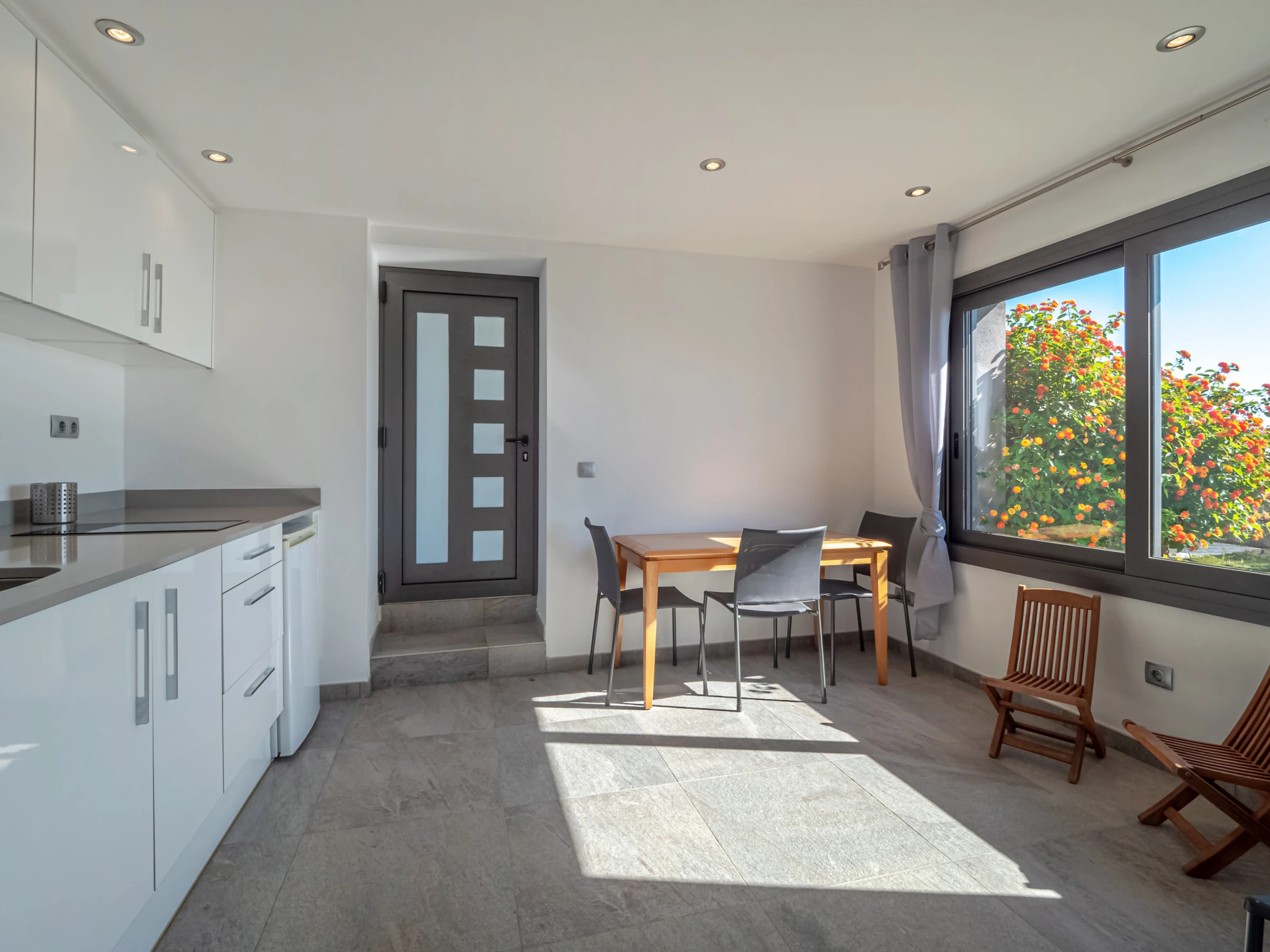 En la planta principal hay un dormitorio doble en suite con baño completo y bañera privada, desde el amplio salón-comedor se accede a la cocina americana abierta con acabados de alta calidad, de donde se disfrutan de unas maravillosas vistas. En la misma planta, se encuentra una gran terraza con espacio suficiente para desayunar, comer y cenar todos juntos. Desde la terraza, bajando una planta, se accede a la zona de la impresionante piscina infinita, donde se encuentra también el estudio independiente con cocina privada.