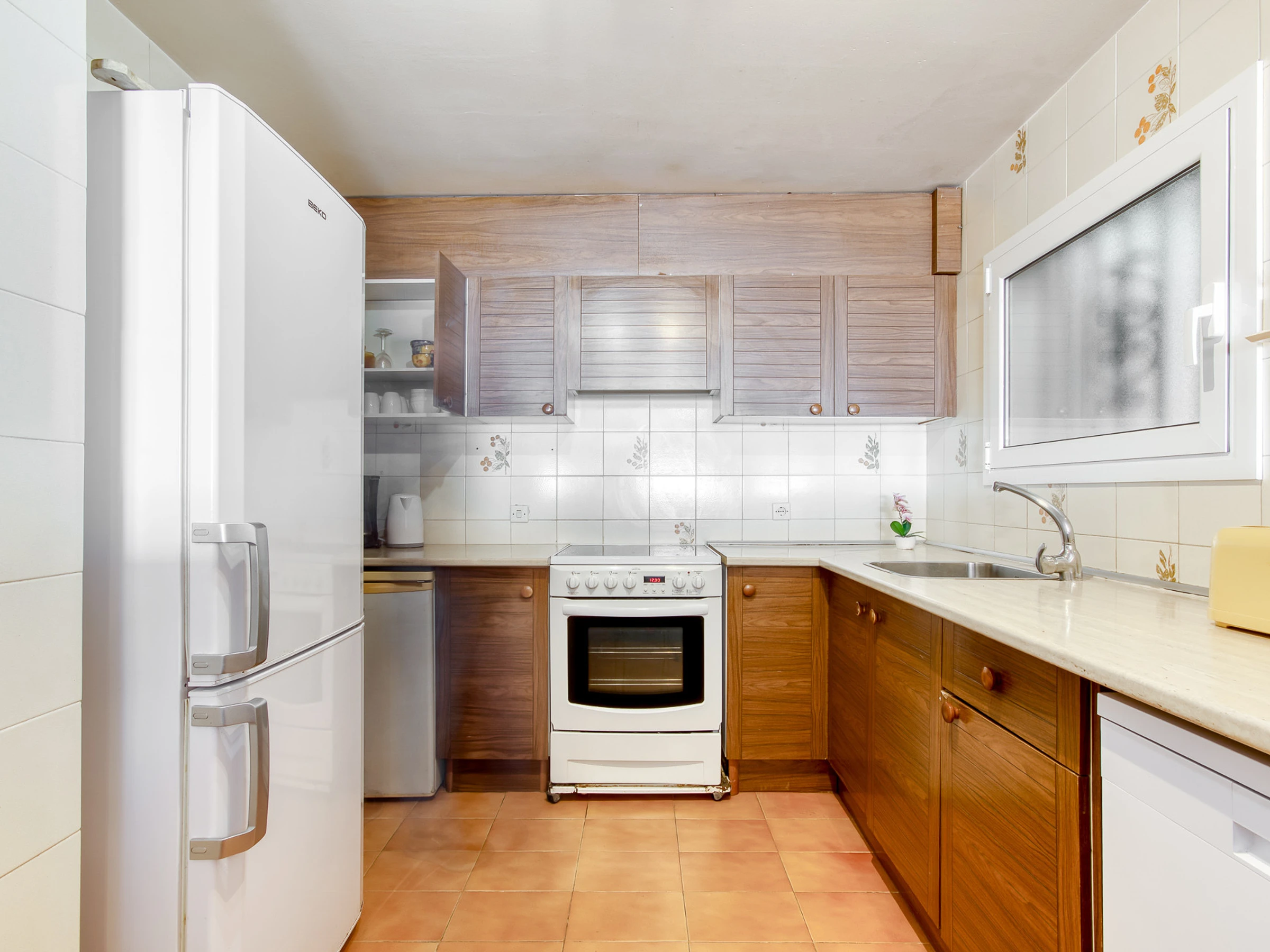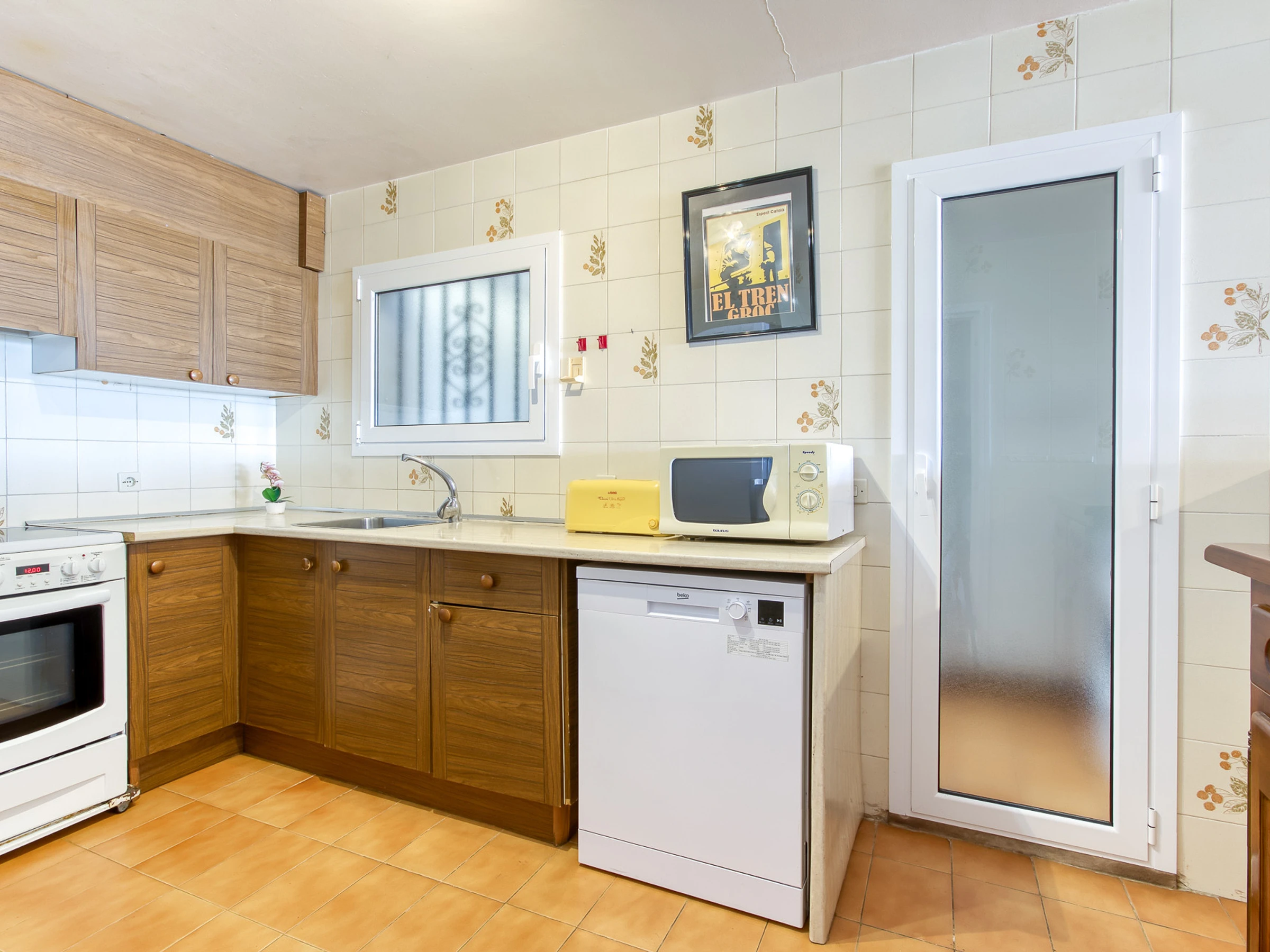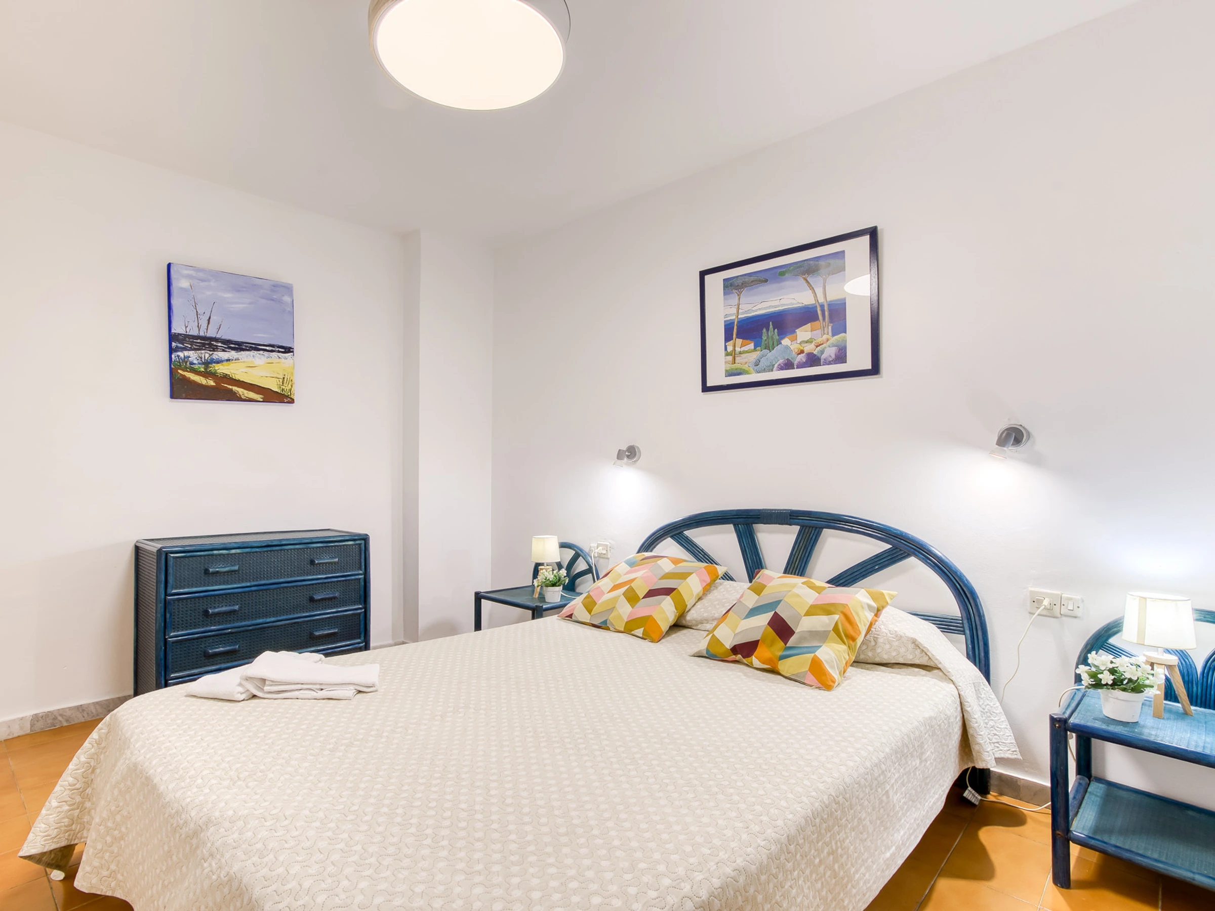 En la interior del apartamento está la cocina completamente equipada seguida del lavadero con lavadora y lavavajillas. Seguidamente hay un baño completo con ducha, una habitación con cama de matrimonio y armarios empotrados, una habitación con dos camas individuales y armarios empotrados, finalmente hay la habitación grande con una cama matrimonial con armarios empotrados y el segundo baño completo; todas las piezas tienen ventanas.