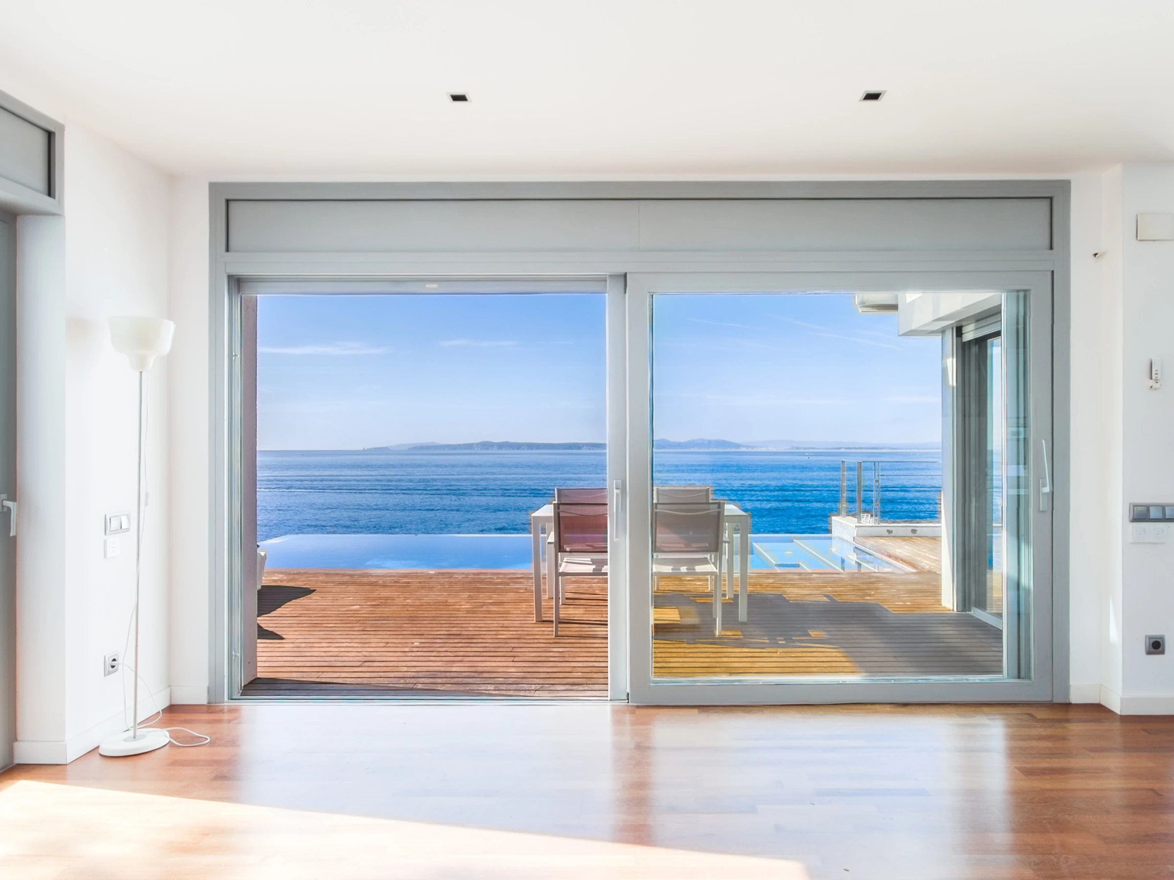El salón-comedor, amplio y muy luminoso, cuenta con grandes ventanales que permiten disfrutar del mar desde el interior y dan acceso directo a una gran terraza con muebles de jardín y a la piscina privada infinita de agua salada, perfecta para relajarse mientras los más pequeños disfrutan del agua.