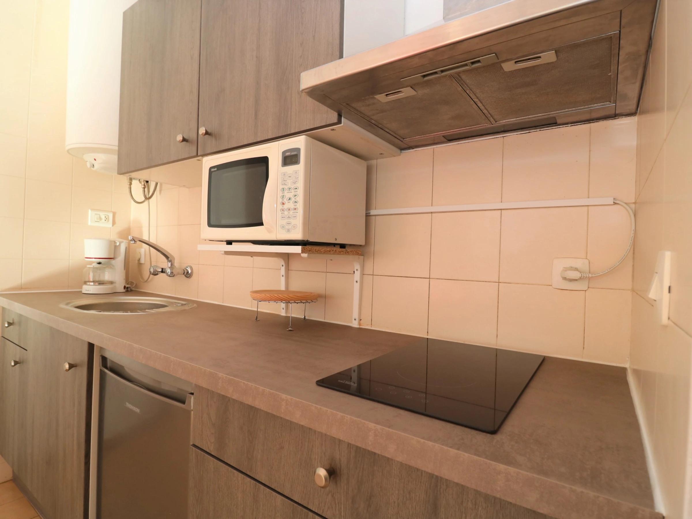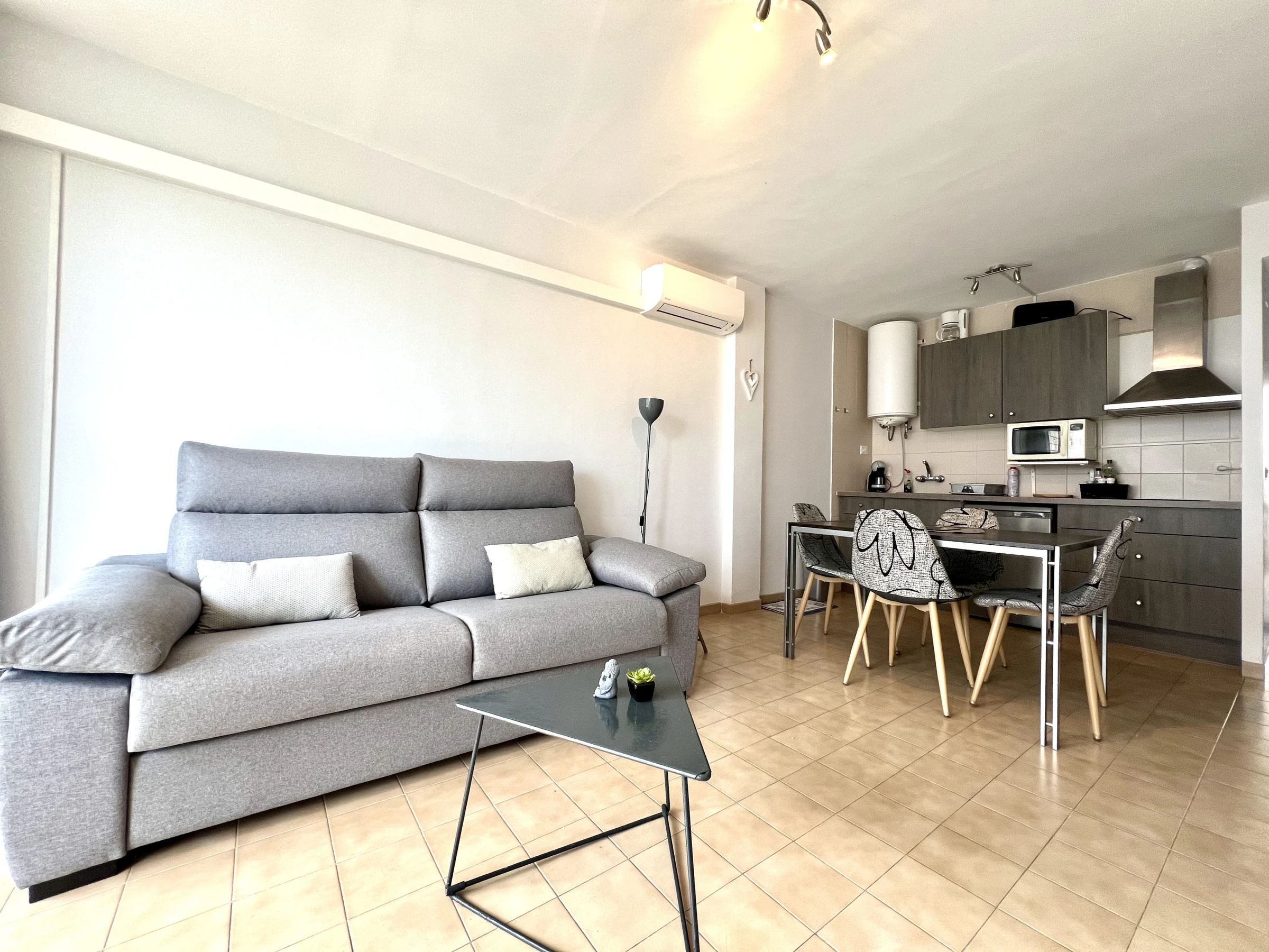 El apartamento cuenta con una cocina abierta totalmente equipada, ofreciendo todos los equipamientos necesarios para preparar deliciosas comidas: nevera, lavadora, cafetera, microondas, tostadora y una vajilla completa. El aire acondicionado en el salón garantiza un confort óptimo durante los calurosos días de verano.