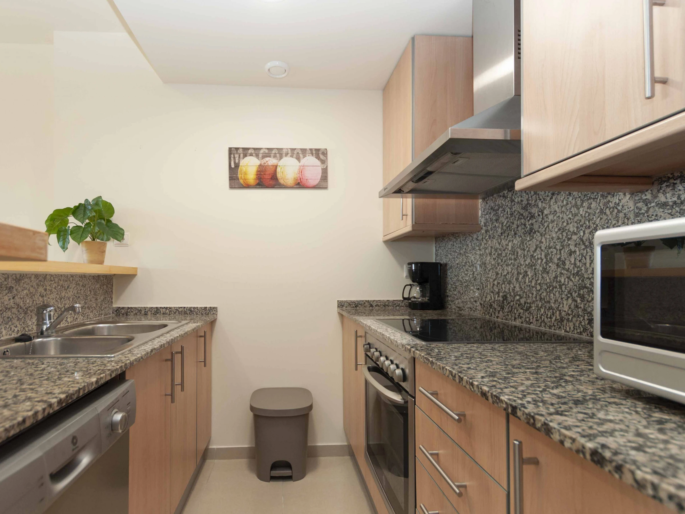 La cocina americana, de vitrocerámica, está equipada con nevera, microondas, horno, congelador, lavadora, secadora, lavavajillas, vajilla/cubertería, utensilios/cocina, cafetera, tostadora y exprimidor.