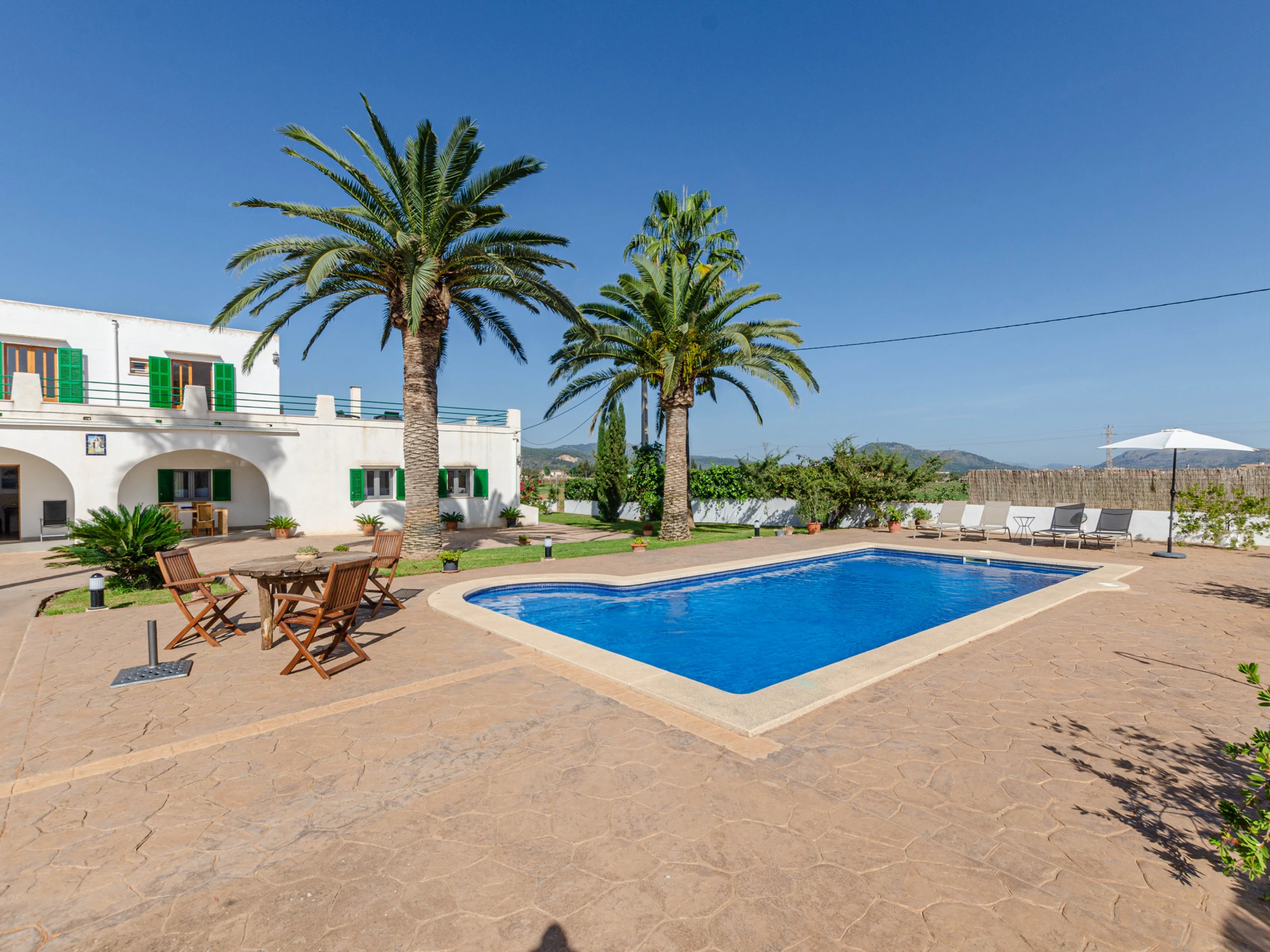 La casa destaca por los bonitos exteriores, incluyendo la piscina privada de cloro con un tamaño de 8 x 4 metros. La piscina está rodeada por una terraza con hamacas, sombrillas y un jardín con palmeras. El equipamiento del jardín incluye una barbacoa móvil y una ducha exterior. En la primera planta de la casa hay otra terraza amueblada con vistas al campo.
