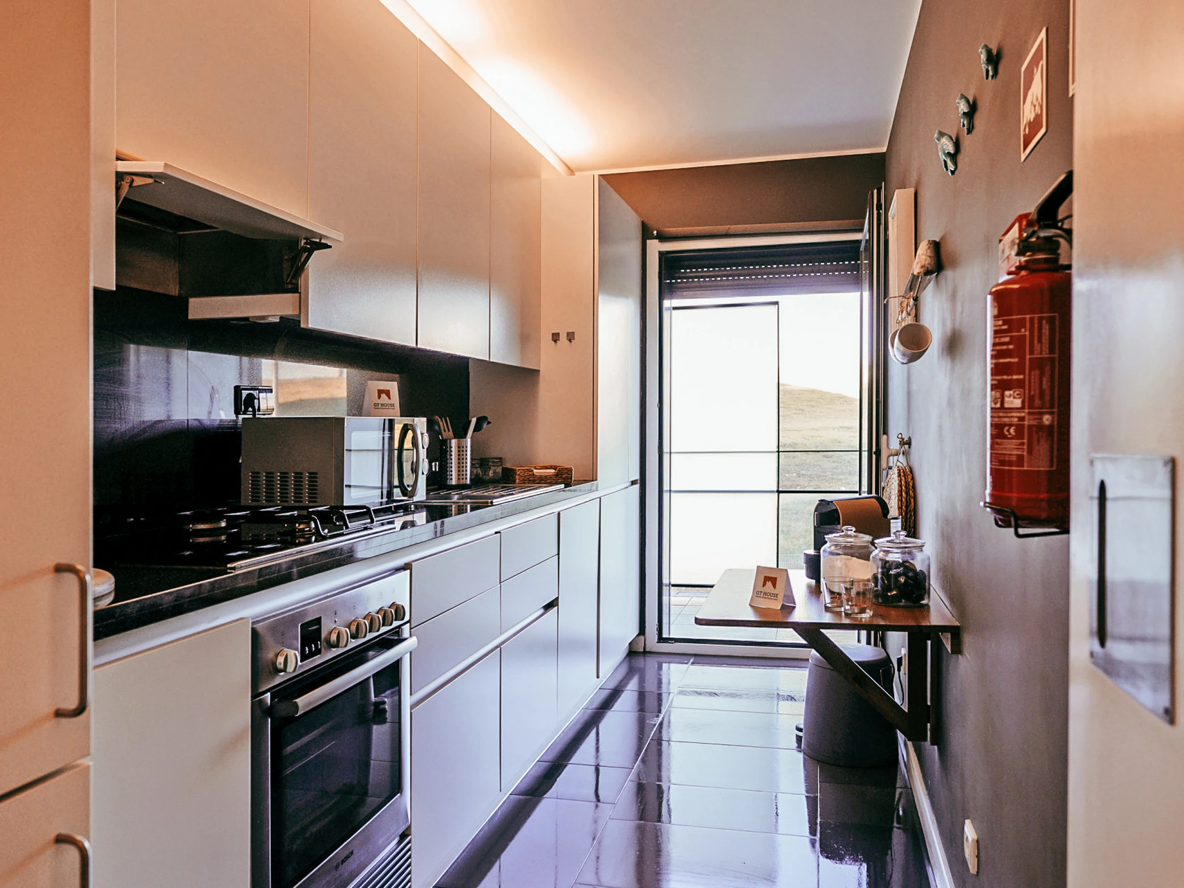 Cocina equipada: horno, placa (gas y eléctrica), microondas, frigorífico, congelador, lavavajillas, cafetera, tostadora, jarra eléctrica, utensilios