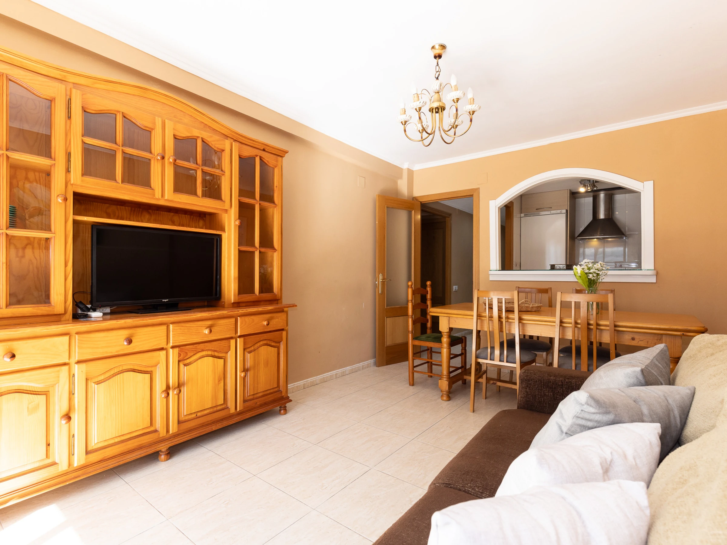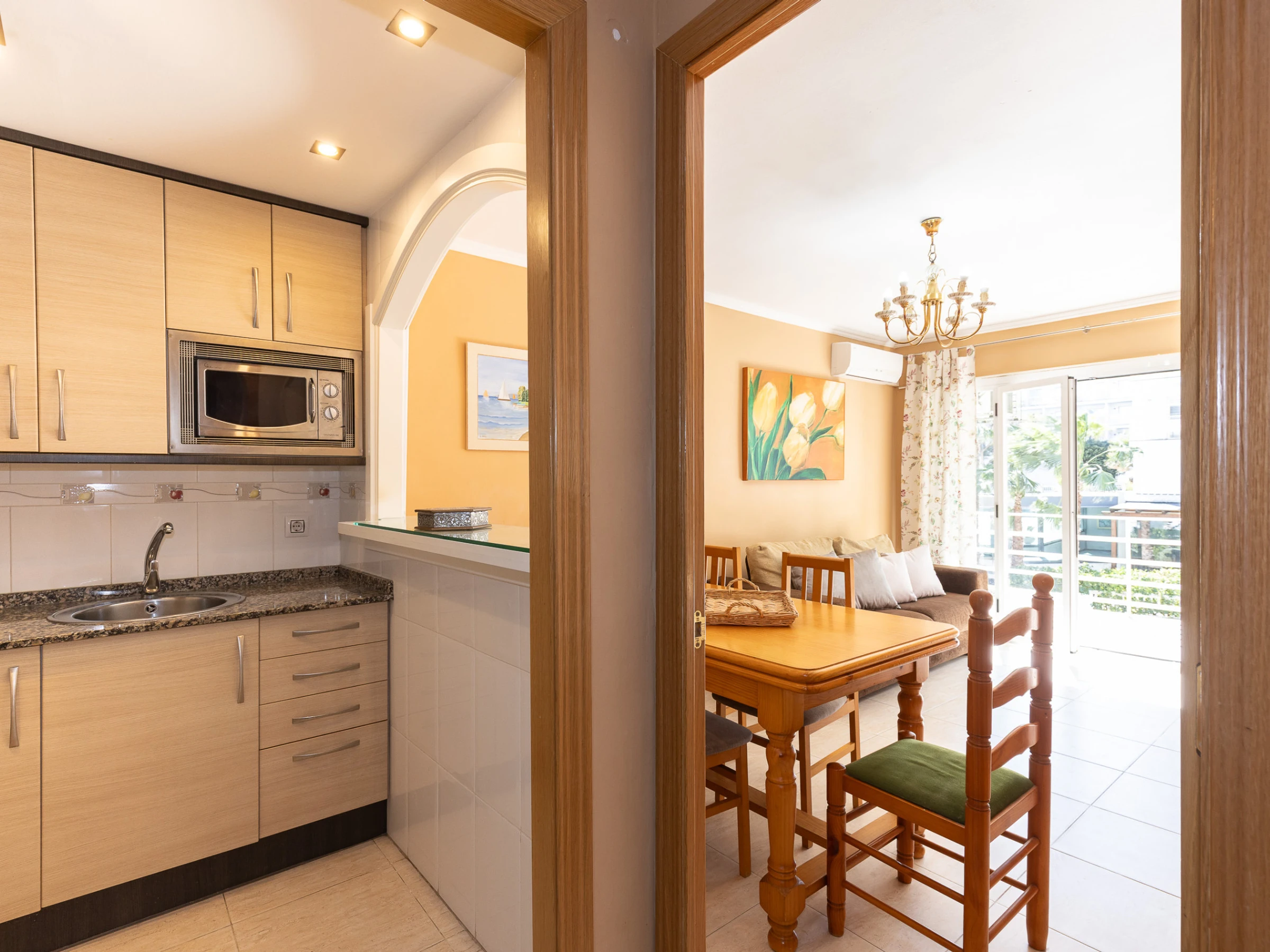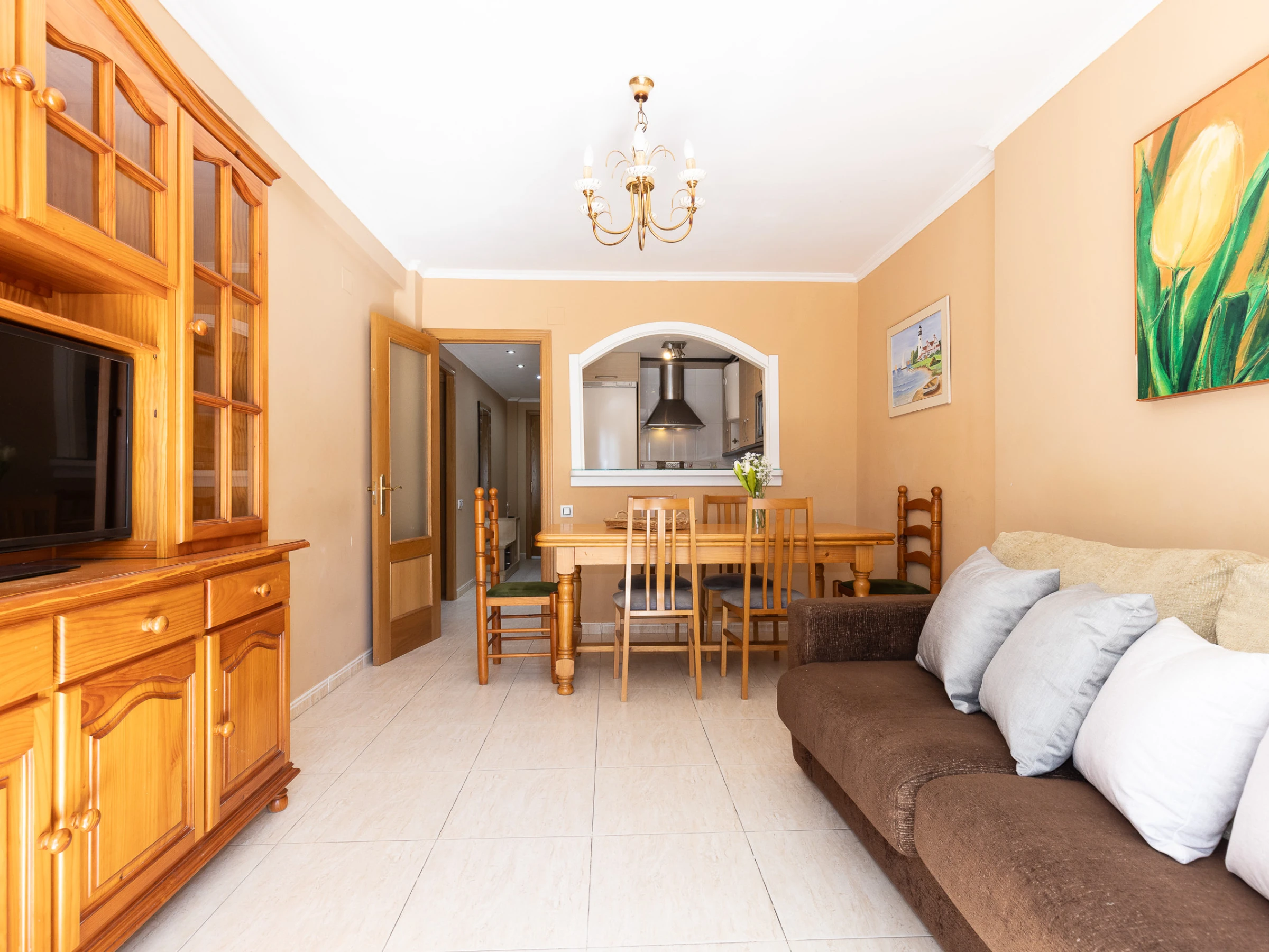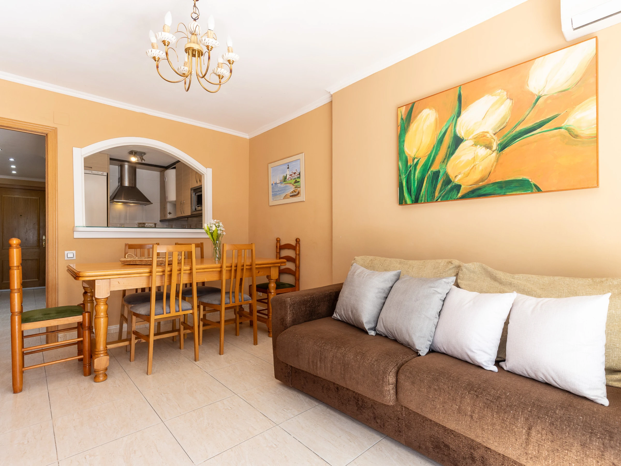 El apartamento está distribuido en tres habitaciones dobles, (2 camas de matrimonio y 1 litera) amplio salón comedor con balcón y un sofá-cama doble de alta calidad, cocina americana totalmente equipada y un cuarto de baño completo con ducha. El alojamiento dispone de aire acondicionado en el salón.