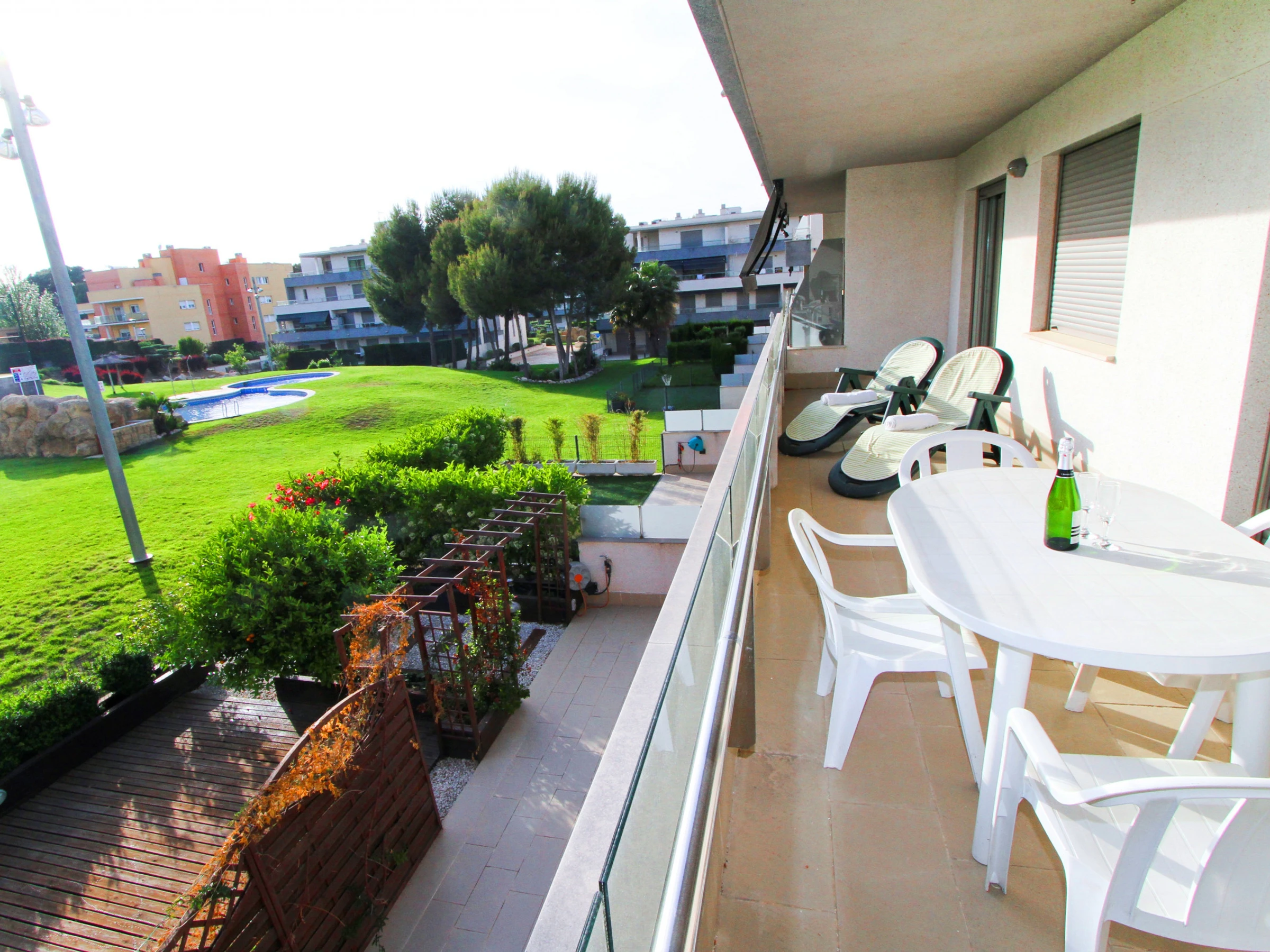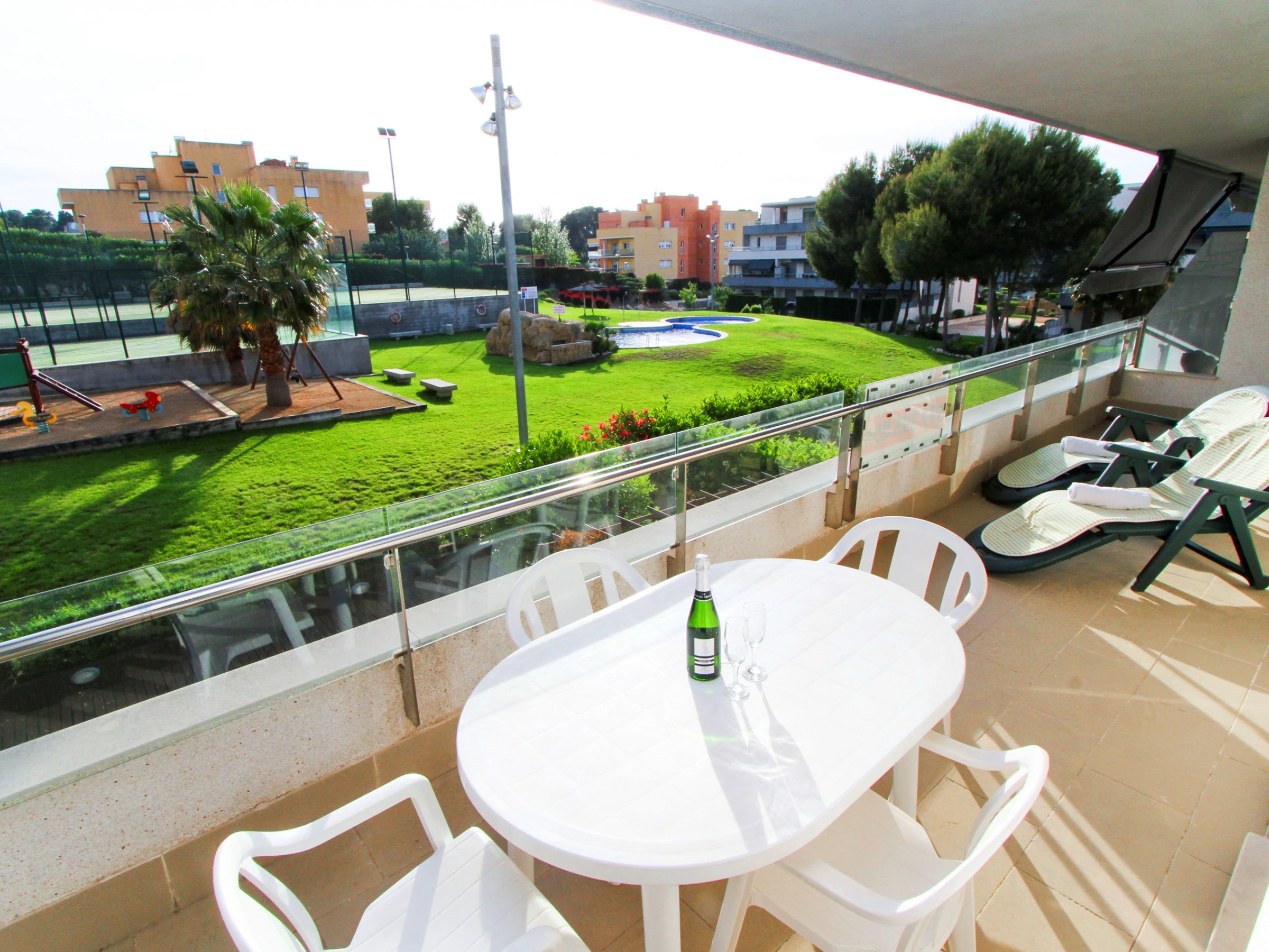 Amplia terraza con toldo, y vistas a la zona comunitaria.
