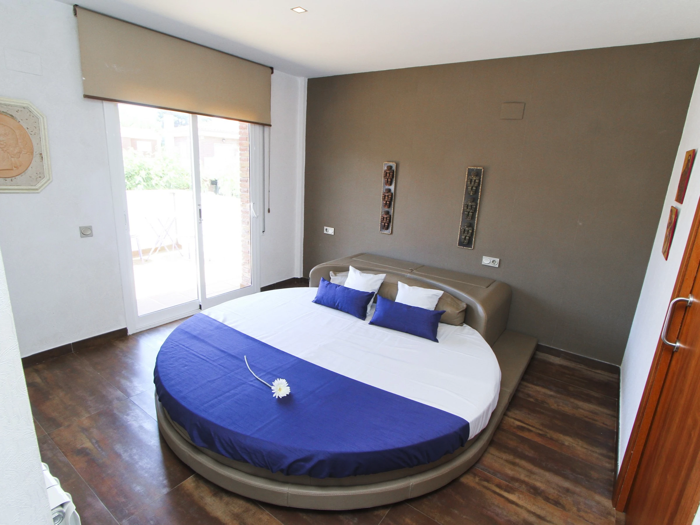 La casa se distribuye en dos plantas y cuenta con cuatro dormitorios dobles, dos cuartos de baño y un aseo de cortesía. El dormitorio principal, con cama redonda, dispone de cuarto de baño privado con bañera y un amplio vestidor. Los otros dormitorios cuentan con dos camas de matrimonio y uno con dos camas individuales. La cocina es independiente y muy amplia, equipada con todo el menaje necesario y electrodomésticos, incluyendo lavavajillas. El salón comedor da acceso a la terraza-jardín y a la piscina.