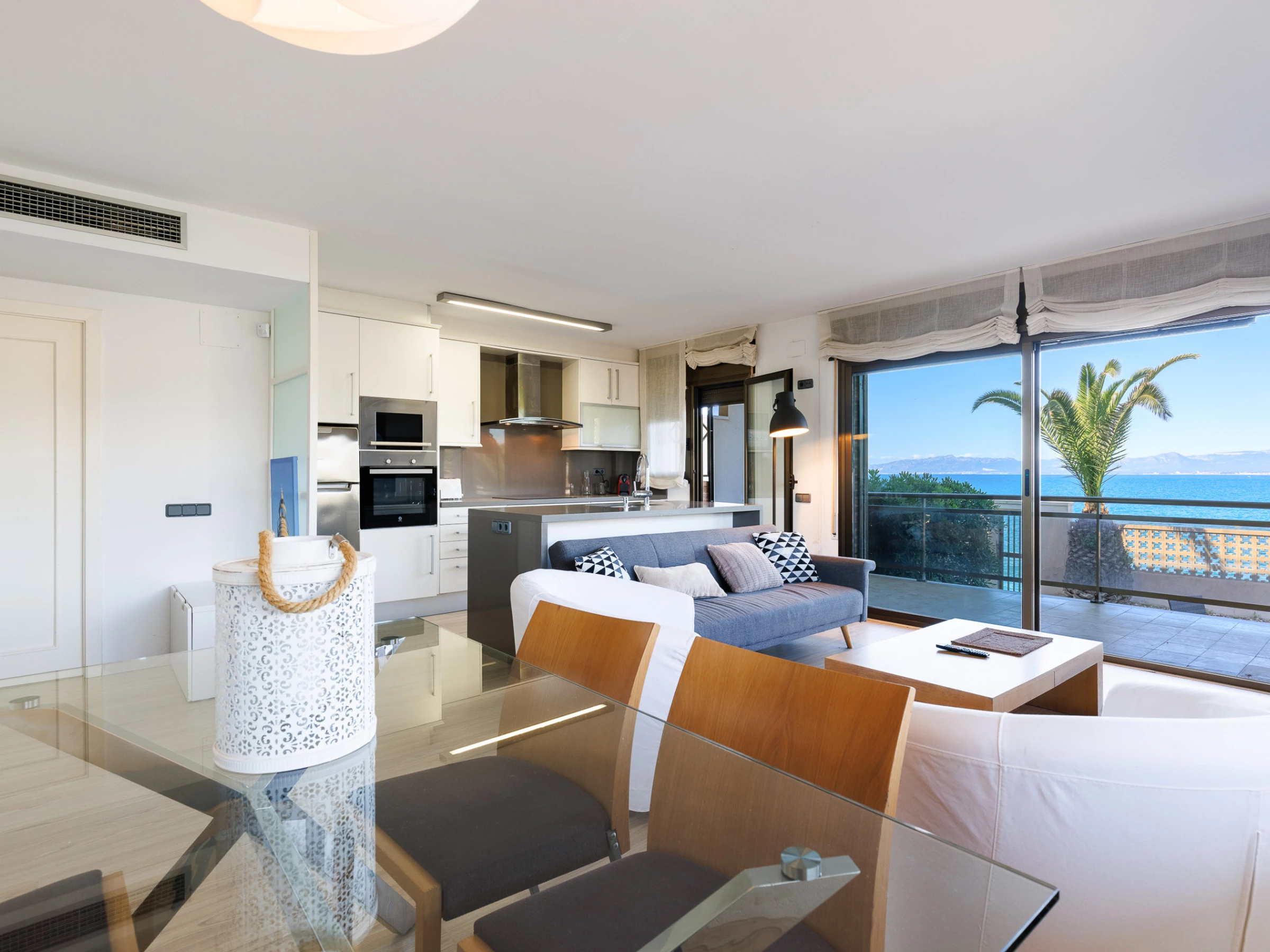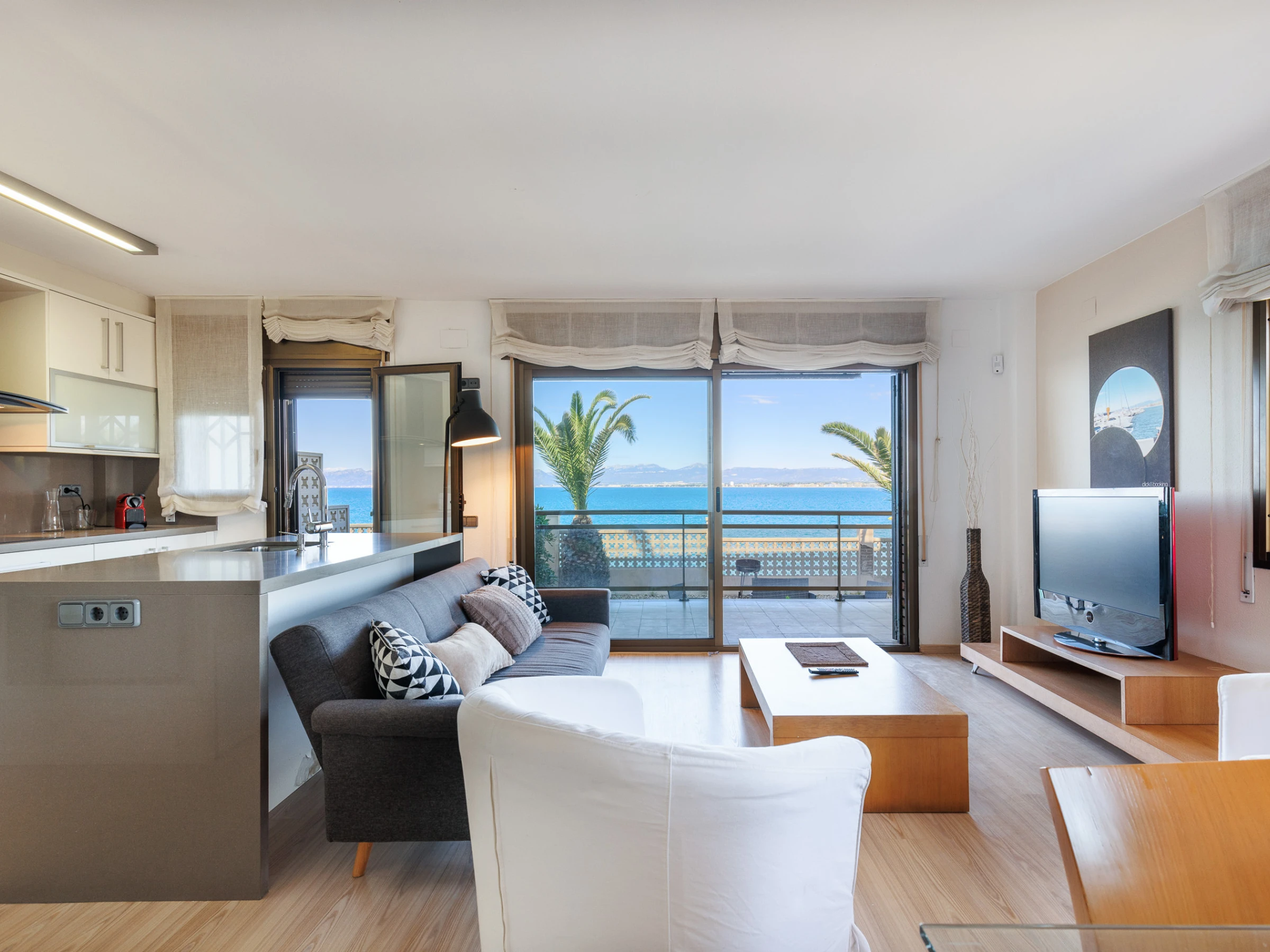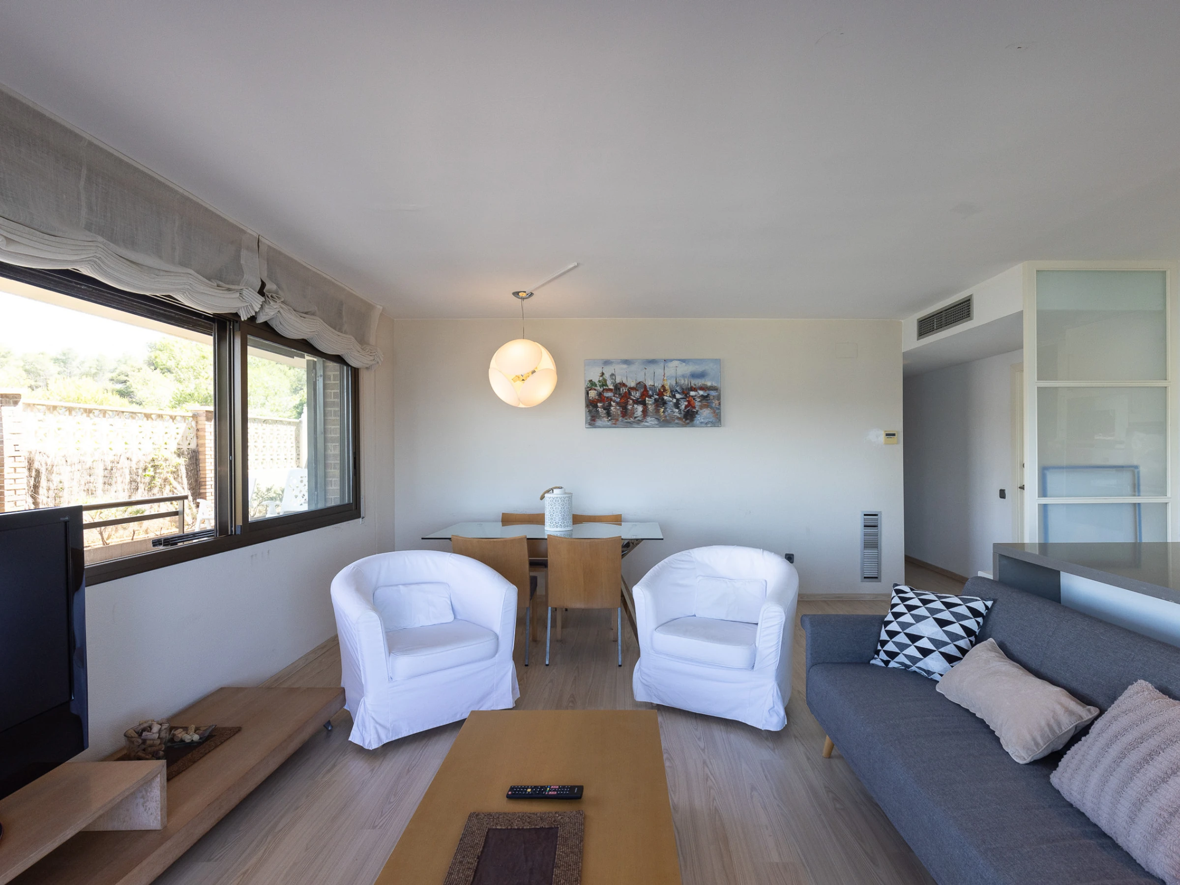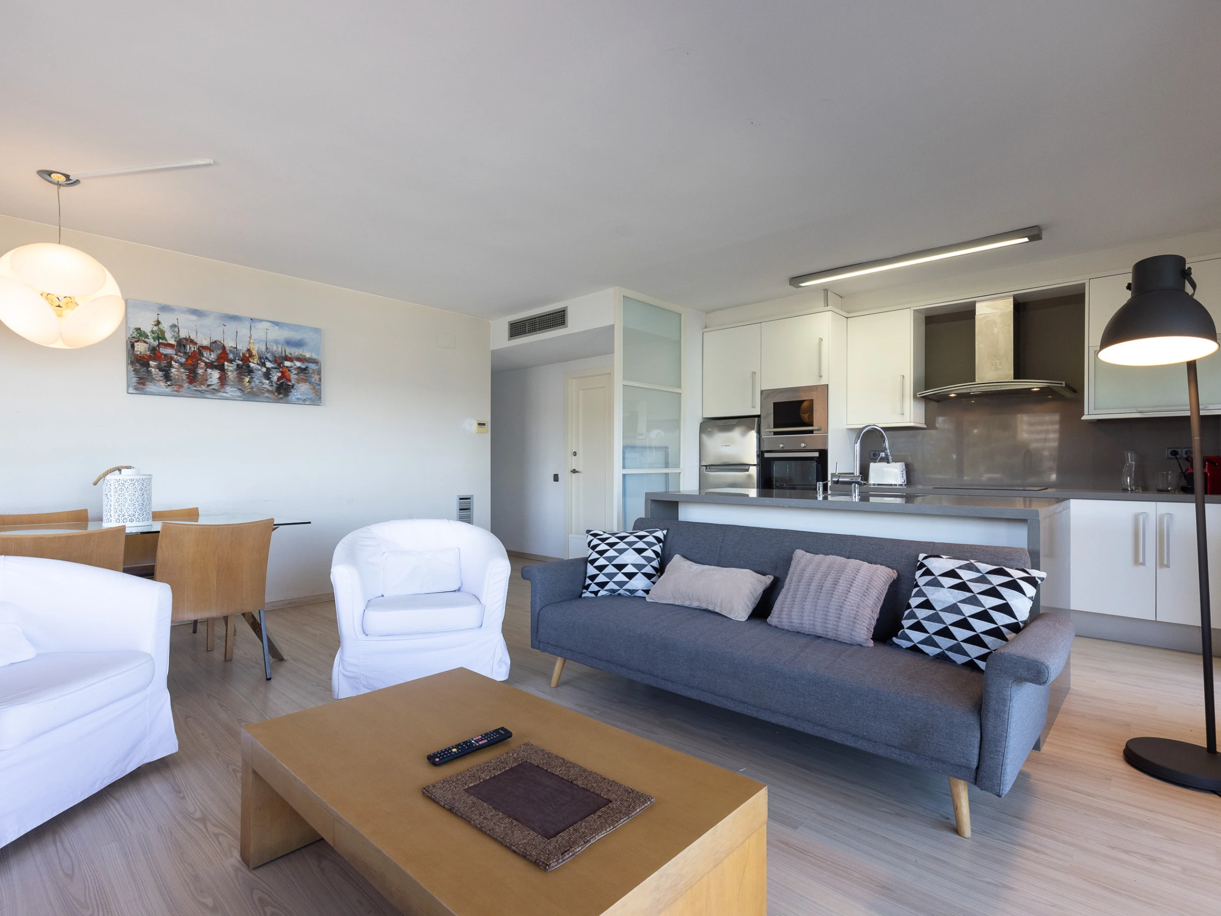 Sala de estar luminosa con cocina abierta