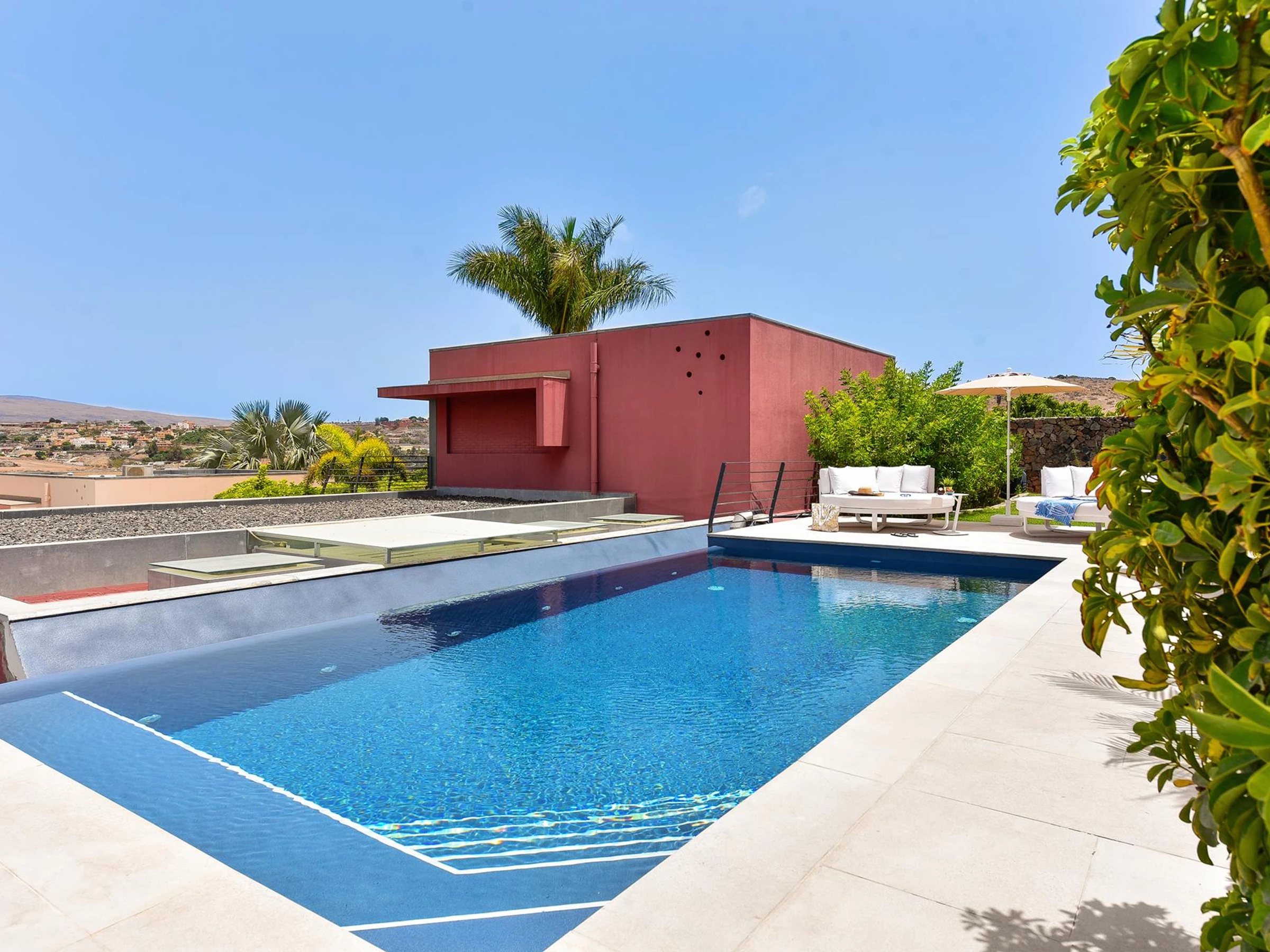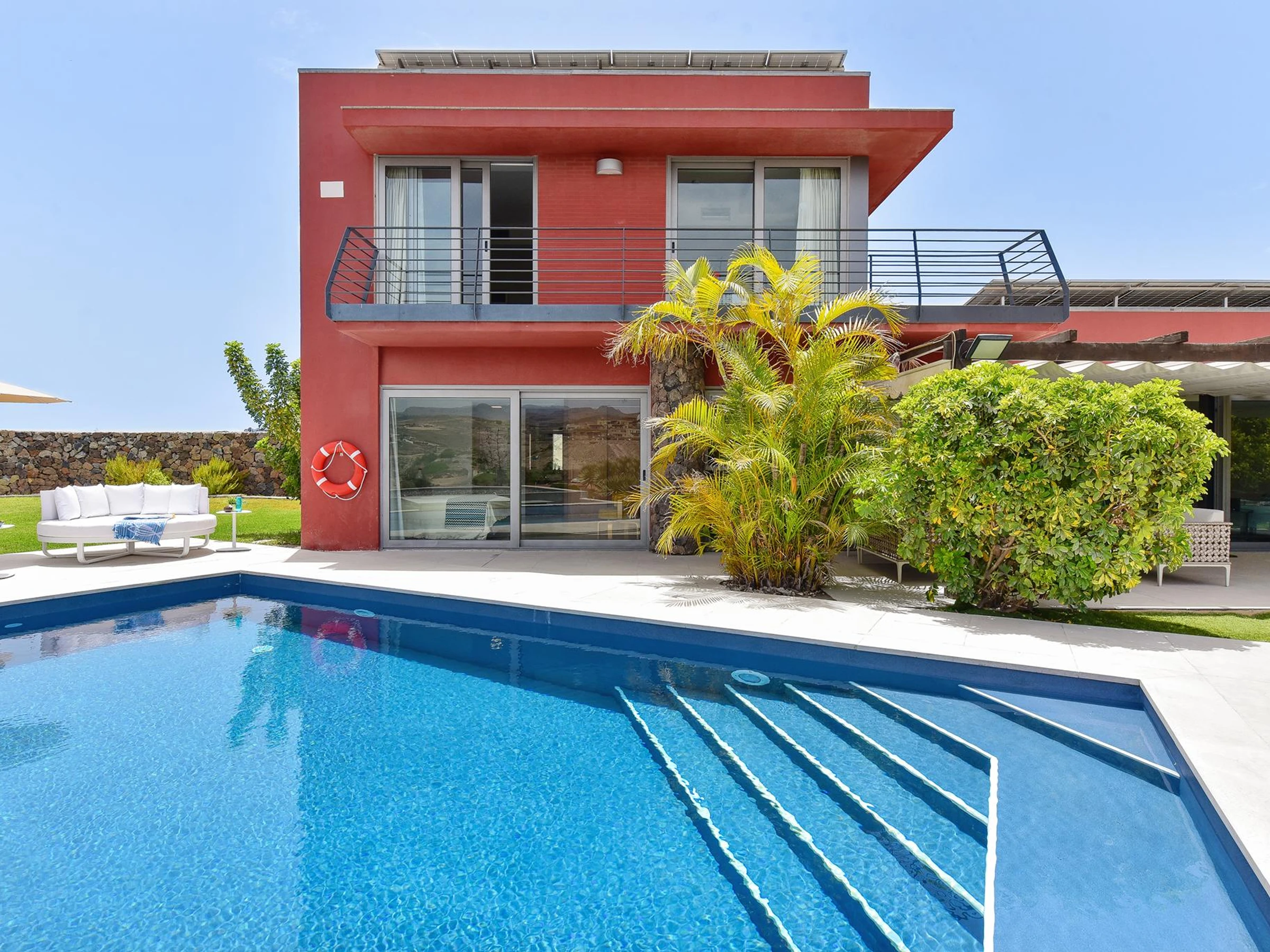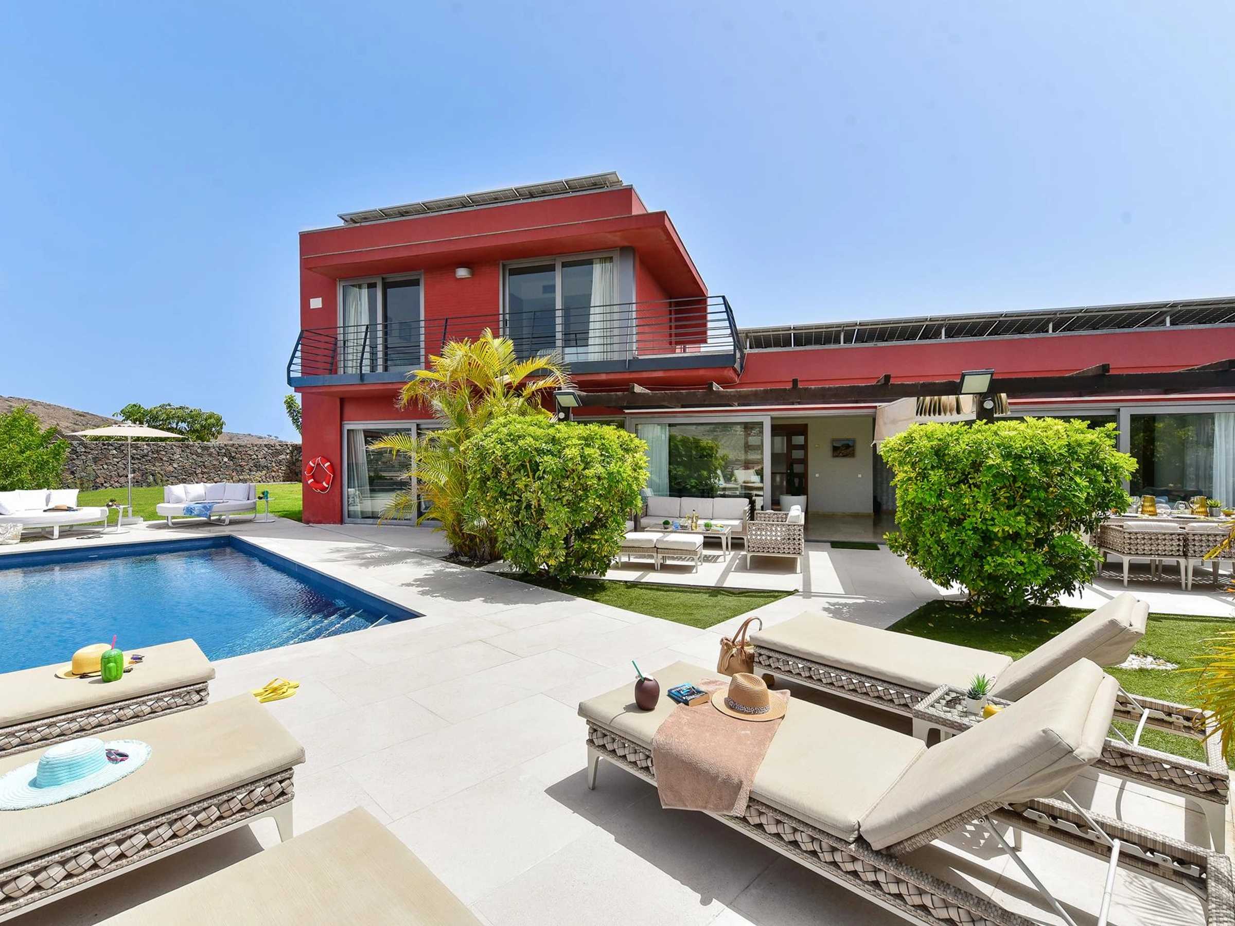 Toda la villa está equipada y decorada al detalle con materiales de primerísima calidad. En el exterior destaca su gran piscina climatizable (servicio de climatización de piscina no incluido en el precio) y la preciosa terraza cubierta con jardín, que alberga la amplia y relajante sala de estar al aire libre. Es un lugar de ensueño para disfrutar como nunca de la tranquilidad y el descanso.