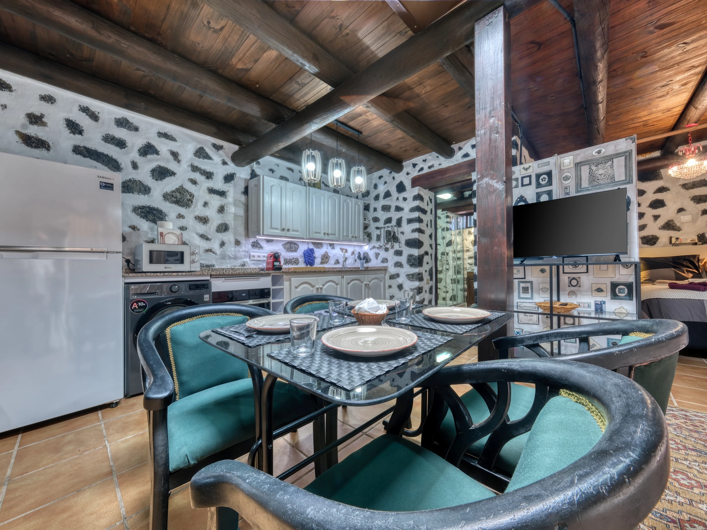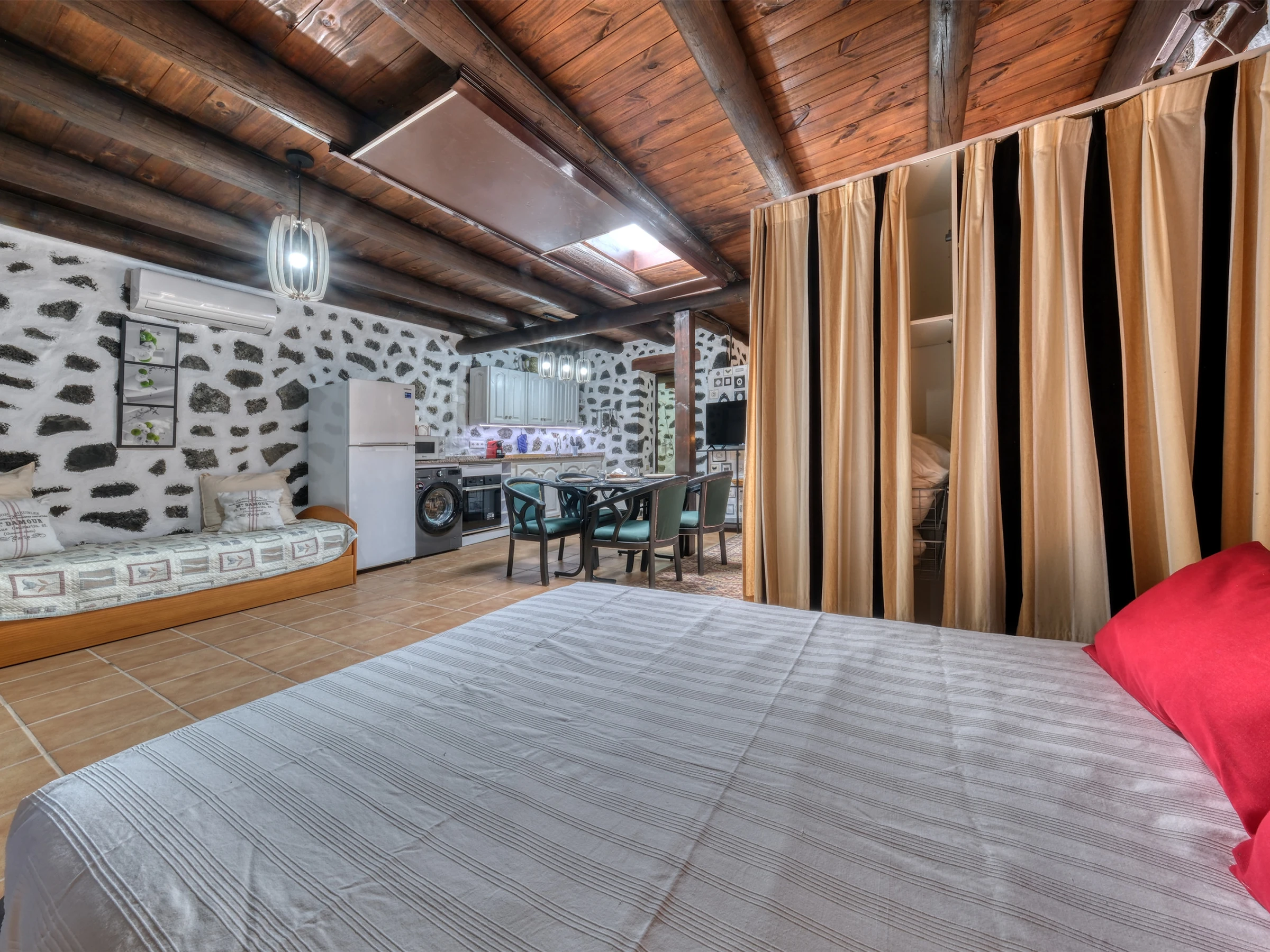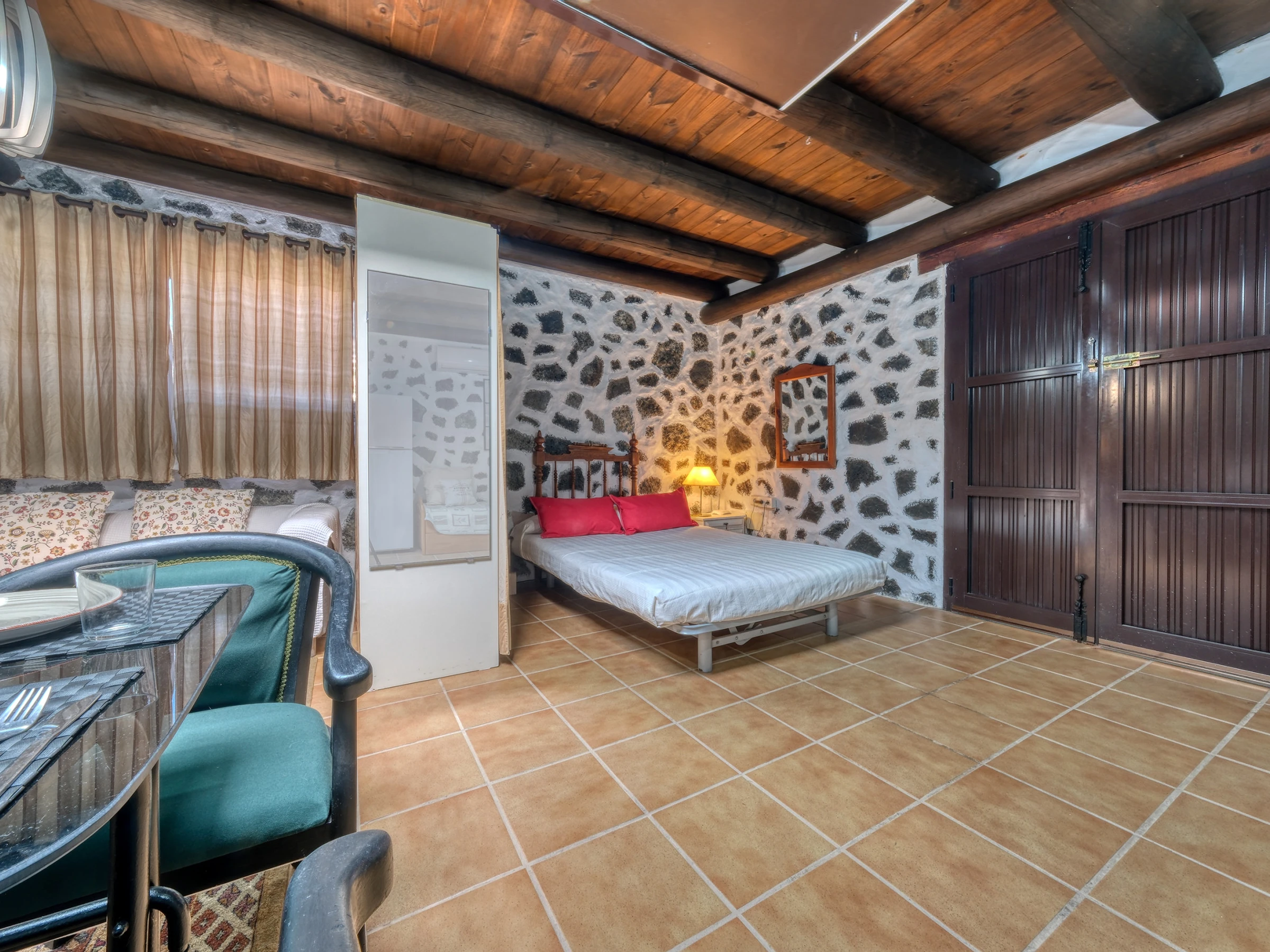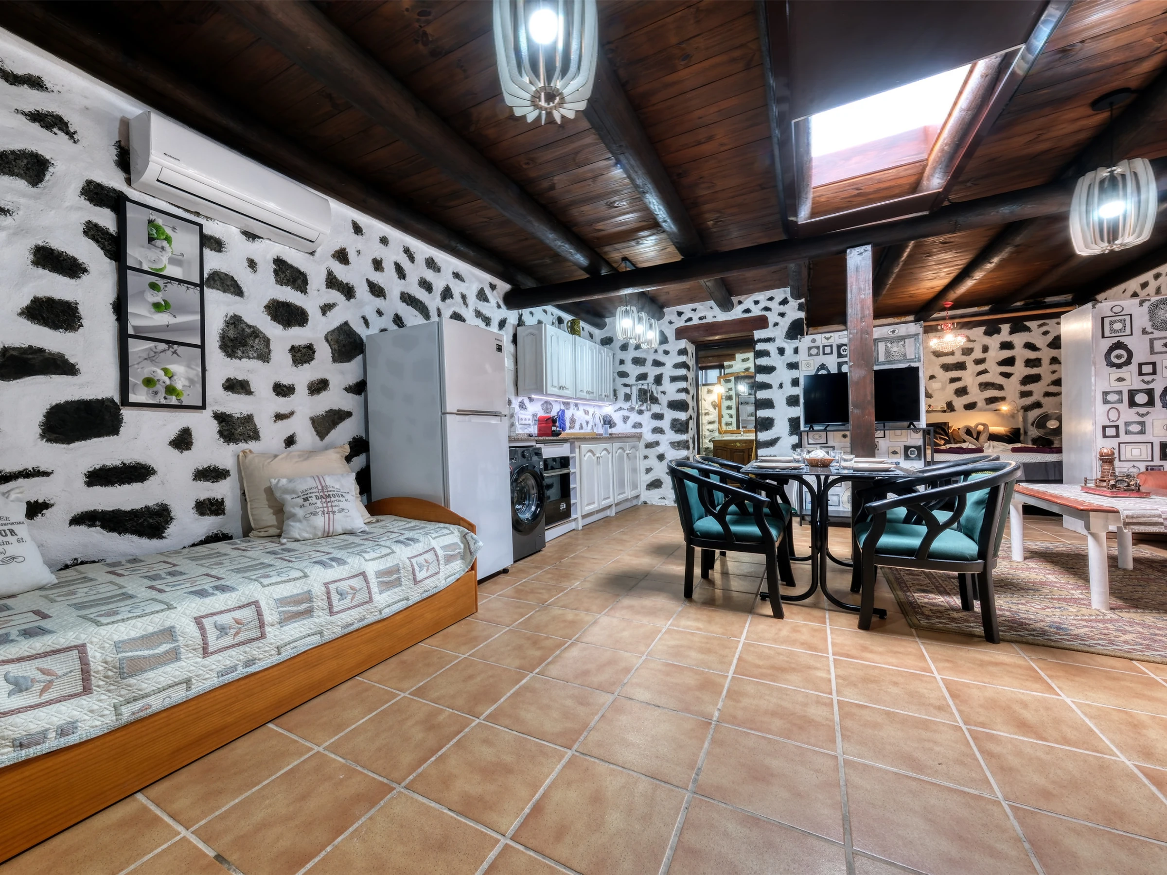 El Apartamento 2 (Planta Baja) es un amplio estudio con capacidad para hasta 6 personas. Dispone de dos camas de matrimonio y una cama individual extraíble, así como una cocina americana totalmente equipada con horno, microondas, cafetera, utensilios de cocina y una mesa de comedor donde disfrutar de desayunos familiares o cenas especiales.