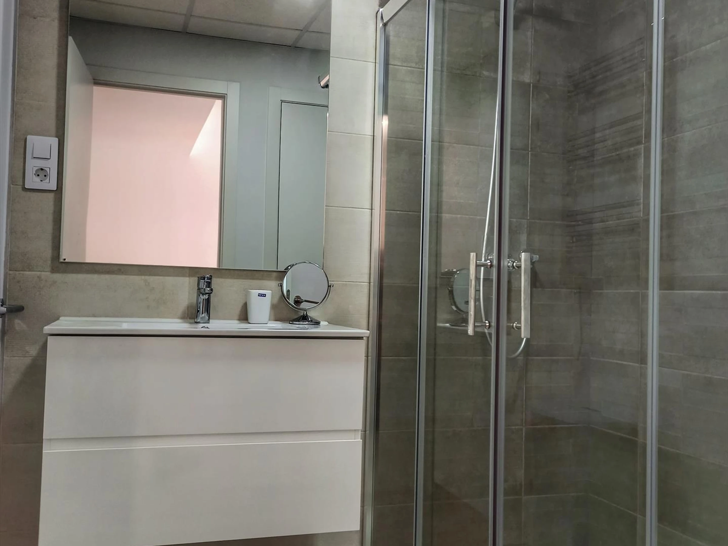 * cuarto de baño en suite con ducha, váter y secador de peloExterior del